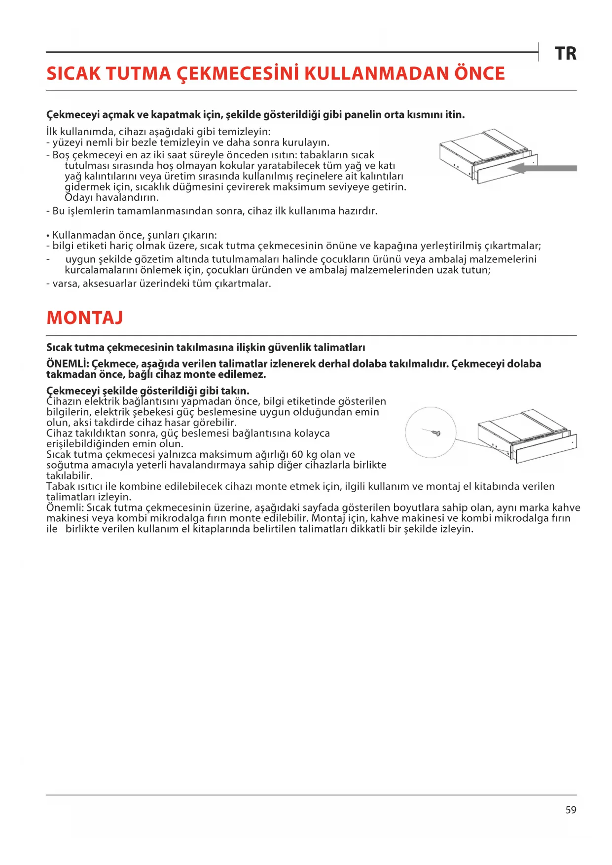 - Kullanmadan önce, şunları çıkarın: - bilgi etiketi hariç olmak üzere, sıcak tutma çekmecesinin önüne ve kapağına yerleştirilmiş çıkartmalar; - uygun şekilde gözetim altında tutulmamaları halinde çocukların ürünü veya ambalaj malzemelerini kurcalamalarını önlemek için, çocukları üründen ve ambalaj malzemelerinden uzak tutun; - varsa, aksesuarlar üzerindeki tüm çıkartmalar. MONTAJ Sıcak tutma çekmecesinin takılmasına ilişkin güvenlik talimatları ÖNEMLİ: Çekmece, aşağıda verilen talimatlar izlenerek derhal dolaba takılmalıdır. Çekmeceyi dolaba takmadan önce, bağlı cihaz monte edilemez. Çekmeceyi şekilde gösterildiği gibi takın. Cihazın elektrik bağlantısını yapmadan önce, bilgi etiketinde gösterilen bilgilerin, elektrik şebekesi güç beslemesine uygun olduğundan emin olun, aksi takdirde cihaz hasar görebilir. Cihaz takıldıktan sonra, güç beslemesi bağlantısına kolayca erişilebildiğinden emin olun. Sıcak tutma çekmecesi yalnızca maksimum ağırlığı 60 kg olan ve soğutma amacıyla yeterli havalandırmaya sahip diğer cihazlarla birlikte takılabilir. Tabak ısıtıcı ile kombine edilebilecek cihazı monte etmek için, ilgili kullanım ve montaj el kitabında verilen talimatları izleyin. Önemli: Sıcak tutma çekmecesinin üzerine, aşağıdaki sayfada gösterilen boyutlara sahip olan, aynı marka kahve makinesi veya kombi mikrodalga fırın monte edilebilir. Montaj için, kahve makinesi ve kombi mikrodalga fırın ile birlikte verilen kullanım el kitaplarında belirtilen talimatları dikkatli bir şekilde izleyin.60 GENEL BAKIŞ
