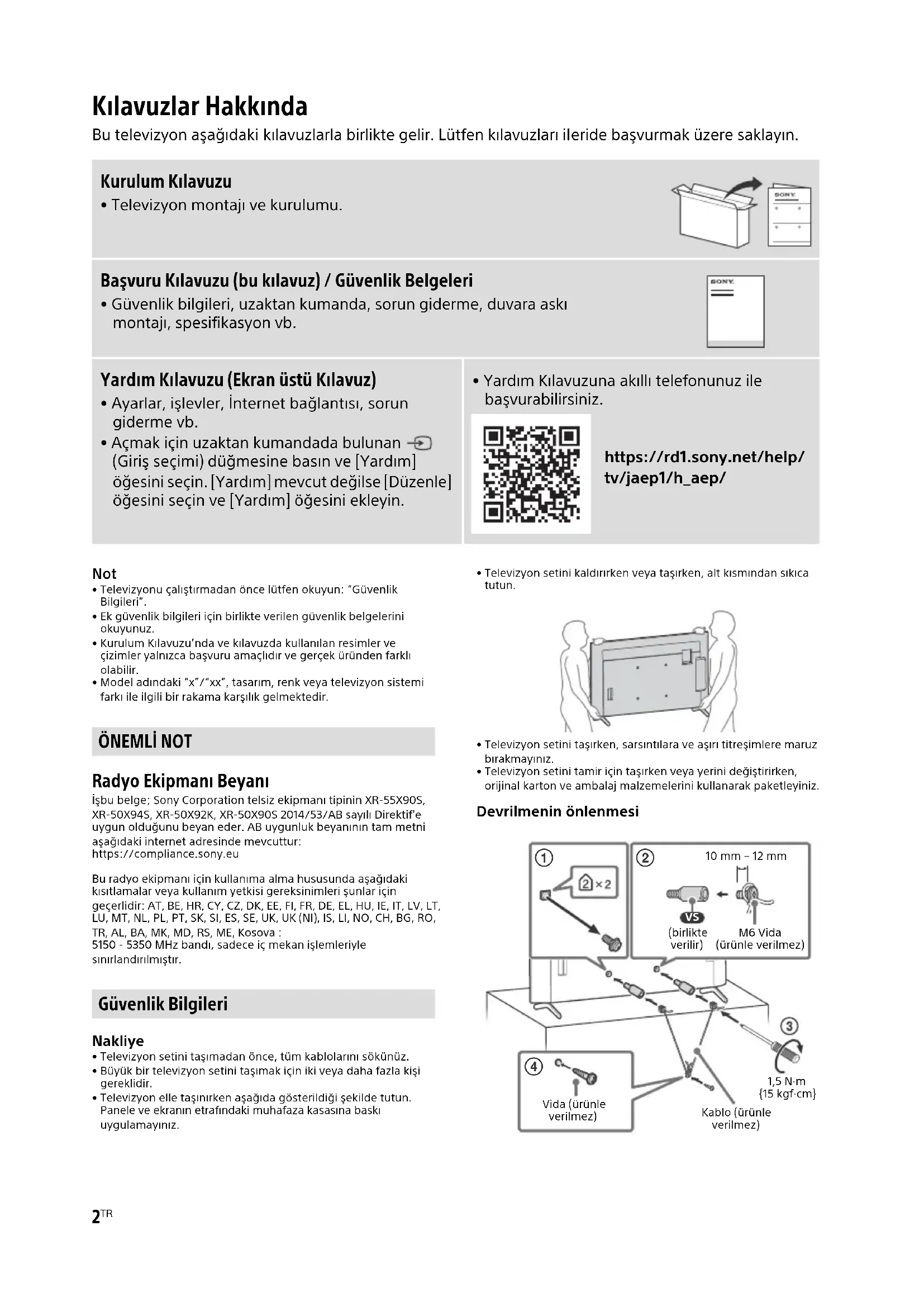 - Televizyonu çalıştırmadan önce lütfen okuyun: “Güvenlik Bilgileri”.• Ek güvenlik bilgileri için birlikte verilen güvenlik belgelerini okuyunuz. • Kurulum Kılavuzu’nda ve kılavuzda kullanılan resimler ve çizimler yalnızca başvuru amaçlıdır ve gerçek üründen farklı olabilir.• Model adındaki “x”/“xx”, tasarım, renk veya televizyon sistemi farkı ile ilgili bir rakama karşılık gelmektedir. Radyo Ekipmanı Beyanı İşbu belge; Sony Corporation telsiz ekipmanı tipinin XR-55X90S, XR-50X94S, XR-50X92K, XR-50X90S 2014/53/AB sayılı Direktif'e uygun olduğunu beyan eder. AB uygunluk beyanının tam metni aşağıdaki internet adresinde mevcuttur: https://compliance.sony.euBu radyo ekipmanı için kullanıma alma hususunda aşağıdaki kısıtlamalar veya kullanım yetkisi gereksinimleri şunlar için geçerlidir: AT, BE, HR, CY, CZ, DK, EE, FI, FR, DE, EL, HU, IE, IT, LV, LT, LU, MT, NL, PL, PT, SK, SI, ES, SE, UK, UK (NI), IS, LI, NO, CH, BG, RO, TR, AL, BA, MK, MD, RS, ME, Kosova :5150 - 5350 MHz bandı, sadece iç mekan işlemleriyle sınırlandırılmıştır. Nakliye