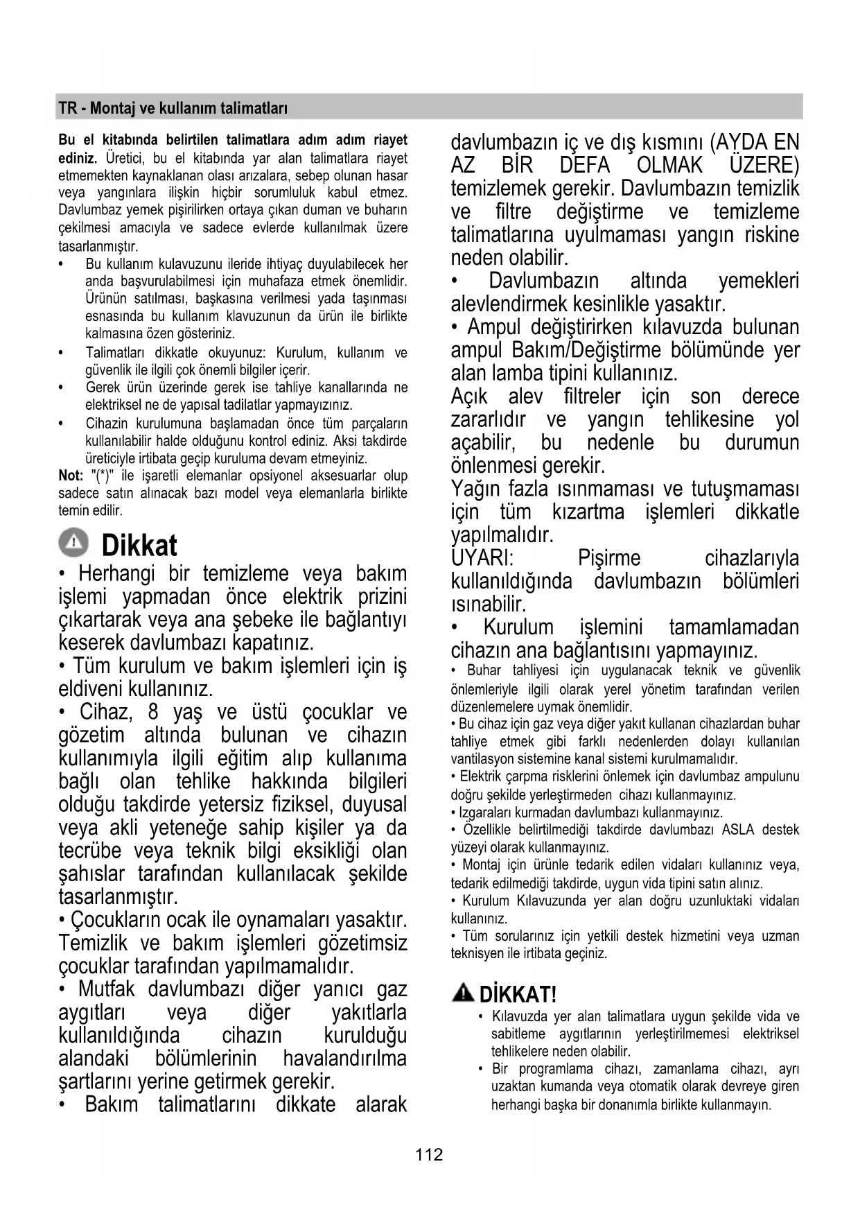 - Elektrik çarpma risklerini önlemek için davlumbaz ampulunu doğru şekilde yerleştirmeden cihazı kullanmayınız.