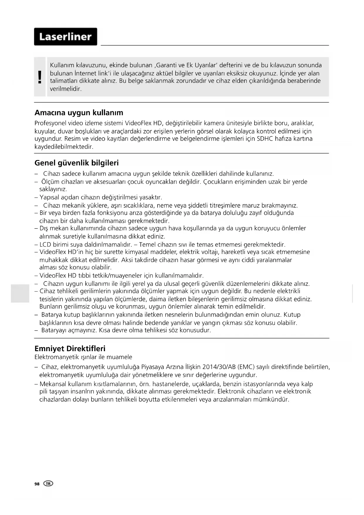 NOEmniyet Direktieri Elektromanyetik ışınlar ile muamele – Cihaz, elektromanyetik uyumluluğa Piyasaya Arzına İlişkin 2014/30/AB (EMC) sayılı direktinde belirtilen, elektromanyetik uyumluluğa dair yönetmeliklere ve sınır değerlerine uygundur. – Mekansal kullanım kısıtlamalarının, örn. hastanelerde, uçaklarda, benzin istasyonlarında veya kalp pili taşıyan insanlrın yakınında, dikkate alınması gerekmektedir. Elektronik cihazların ve elektronik cihazlardan dolayı bunların tehlikeli boyutta etkilenmeleri veya arızalanmaları mümkündür. Genel güvenlik bilgileri – Cihazı sadece kullanım amacına uygun şekilde teknik özellikleri dahilinde kullanınız. – Ölçüm cihazları ve aksesuarları çocuk oyuncakları değildir. Çocukların erişiminden uzak bir yerde saklayınız. – Yapısal açıdan cihazın değiştirilmesi yasaktır. – Cihazı mekanik yüklere, aşırı sıcaklıklara, neme veya şiddetli titreşimlere maruz bırakmayınız. – Bir veya birden fazla fonksiyonu arıza gösterdiğinde ya da batarya doluluğu zayıf olduğunda cihazın bir daha kullanılmaması gerekmektedir. – Dış mekan kullanımında cihazın sadece uygun hava koşullarında ya da uygun koruyucu önlemler alınmak suretiyle kullanılmasına dikkat ediniz. – LCD birimi suya daldırılmamalıdır. – Temel cihazın sıvı ile temas etmemesi gerekmektedir. – VideoFlex HD’in hiç bir surette kimyasal maddeler, elektrik voltajı, hareketli veya sıcak etmemesine muhakkak dikkat edilmelidir. Aksi takdirde cihazın hasar görmesi ve aynı ciddi yaralanmalar alması söz konusu olabilir. – VideoFlex HD tıbbi tetkik/muayeneler için kullanılmamalıdır. – Cihazın uygun kullanımı ile ilgili yerel ya da ulusal geçerli güvenlik düzenlemelerini dikkate alınız. – Cihaz tehlikeli gerilimlerin yakınında ölçümler yapmak için uygun değildir. Bu nedenle elektrikli tesislerin yakınında yapılan ölçümlerde, daima iletken bileşenlerin gerilimsiz olmasına dikkat ediniz. Bunların gerilimsiz oluşu ve korunması, uygun önlemler alınarak temin edilmelidir. – Batarya kutup başlıklarının yakınında iletken nesnelerin bulunmadığından emin olunuz. Kutup başlıklarının kısa devre olması halinde bedende yanıklar ve yangın çıkması söz konusu olabilir. – Bataryayı açmayınız. Kısa devre olma tehlikesi söz konusudur. Amacına uygun kullanım Profesyonel video izleme sistemi VideoFlex HD, değiştirilebilir kamera ünitesiyle birlikte boru, aralıklar, kuyular, duvar boşlukları ve araçlardaki zor erişilen yerlerin görsel olarak kolayca kontrol edilmesi için uygundur. Resim ve video kayıtları değerlendirme ve belgelendirme işlemleri için SDHC hafıza kartına kaydedilebilmektedir. Kullanım kılavuzunu, ekinde bulunan ‚Garanti ve Ek Uyarılar‘ defterini ve de bu kılavuzun sonunda bulunan İnternet link‘i ile ulaşacağınız aktüel bilgiler ve uyarıları eksiksiz okuyunuz. İçinde yer alan talimatları dikkate alınız. Bu belge saklanmak zorundadır ve cihaz elden çıkarıldığında beraberinde verilmelidir.