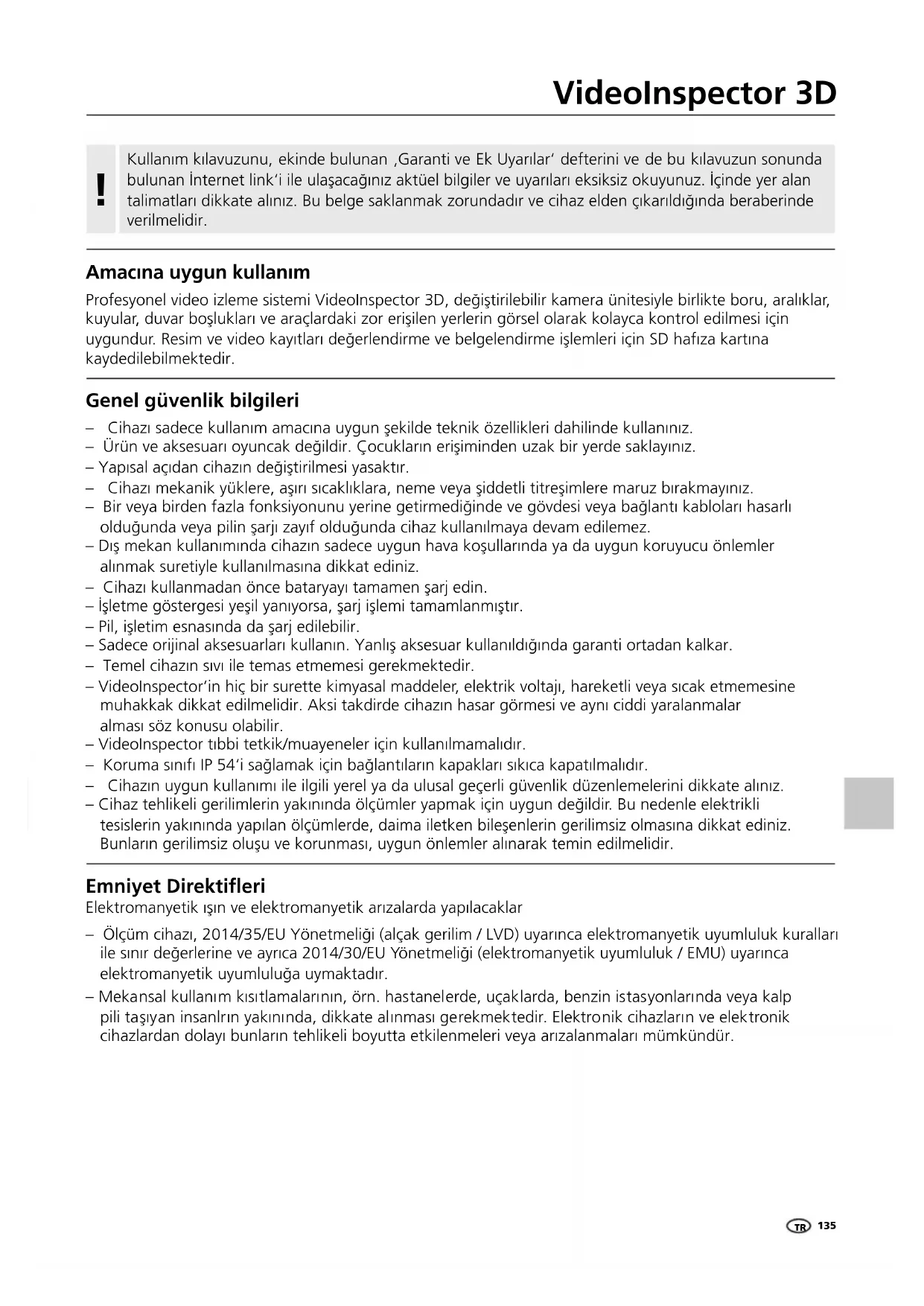 Emniyet Direktieri Elektromanyetik ışın ve elektromanyetik arızalarda yapılacaklar – Ölçüm cihazı, 2014/35/EU Yönetmeliği (alçak gerilim / LVD) uyarınca elektromanyetik uyumluluk kuralları ile sınır değerlerine ve ayrıca 2014/30/EU Yönetmeliği (elektromanyetik uyumluluk / EMU) uyarınca elektromanyetik uyumluluğa uymaktadır. – Mekansal kullanım kısıtlamalarının, örn. hastanelerde, uçaklarda, benzin istasyonlarında veya kalp pili taşıyan insanlrın yakınında, dikkate alınması gerekmektedir. Elektronik cihazların ve elektronik cihazlardan dolayı bunların tehlikeli boyutta etkilenmeleri veya arızalanmaları mümkündür. Genel güvenlik bilgileri – Cihazı sadece kullanım amacına uygun şekilde teknik özellikleri dahilinde kullanınız. – Ürün ve aksesuarı oyuncak değildir. Çocukların erişiminden uzak bir yerde saklayınız. – Yapısal açıdan cihazın değiştirilmesi yasaktır. – Cihazı mekanik yüklere, aşırı sıcaklıklara, neme veya şiddetli titreşimlere maruz bırakmayınız. – Bir veya birden fazla fonksiyonunu yerine getirmediğinde ve gövdesi veya bağlantı kabloları hasarlı olduğunda veya pilin şarjı zayıf olduğunda cihaz kullanılmaya devam edilemez. – Dış mekan kullanımında cihazın sadece uygun hava koşullarında ya da uygun koruyucu önlemler alınmak suretiyle kullanılmasına dikkat ediniz. – Cihazı kullanmadan önce bataryayı tamamen şarj edin. – İşletme göstergesi yeşil yanıyorsa, şarj işlemi tamamlanmıştır. – Pil, işletim esnasında da şarj edilebilir. – Sadece orijinal aksesuarları kullanın. Yanlış aksesuar kullanıldığında garanti ortadan kalkar. – Temel cihazın sıvı ile temas etmemesi gerekmektedir. – VideoInspector’in hiç bir surette kimyasal maddeler, elektrik voltajı, hareketli veya sıcak etmemesine muhakkak dikkat edilmelidir. Aksi takdirde cihazın hasar görmesi ve aynı ciddi yaralanmalar alması söz konusu olabilir. – VideoInspector tıbbi tetkik/muayeneler için kullanılmamalıdır. – Koruma sınıfı IP 54‘i sağlamak için bağlantıların kapakları sıkıca kapatılmalıdır. – Cihazın uygun kullanımı ile ilgili yerel ya da ulusal geçerli güvenlik düzenlemelerini dikkate alınız. – Cihaz tehlikeli gerilimlerin yakınında ölçümler yapmak için uygun değildir. Bu nedenle elektrikli tesislerin yakınında yapılan ölçümlerde, daima iletken bileşenlerin gerilimsiz olmasına dikkat ediniz. Bunların gerilimsiz oluşu ve korunması, uygun önlemler alınarak temin edilmelidir.136