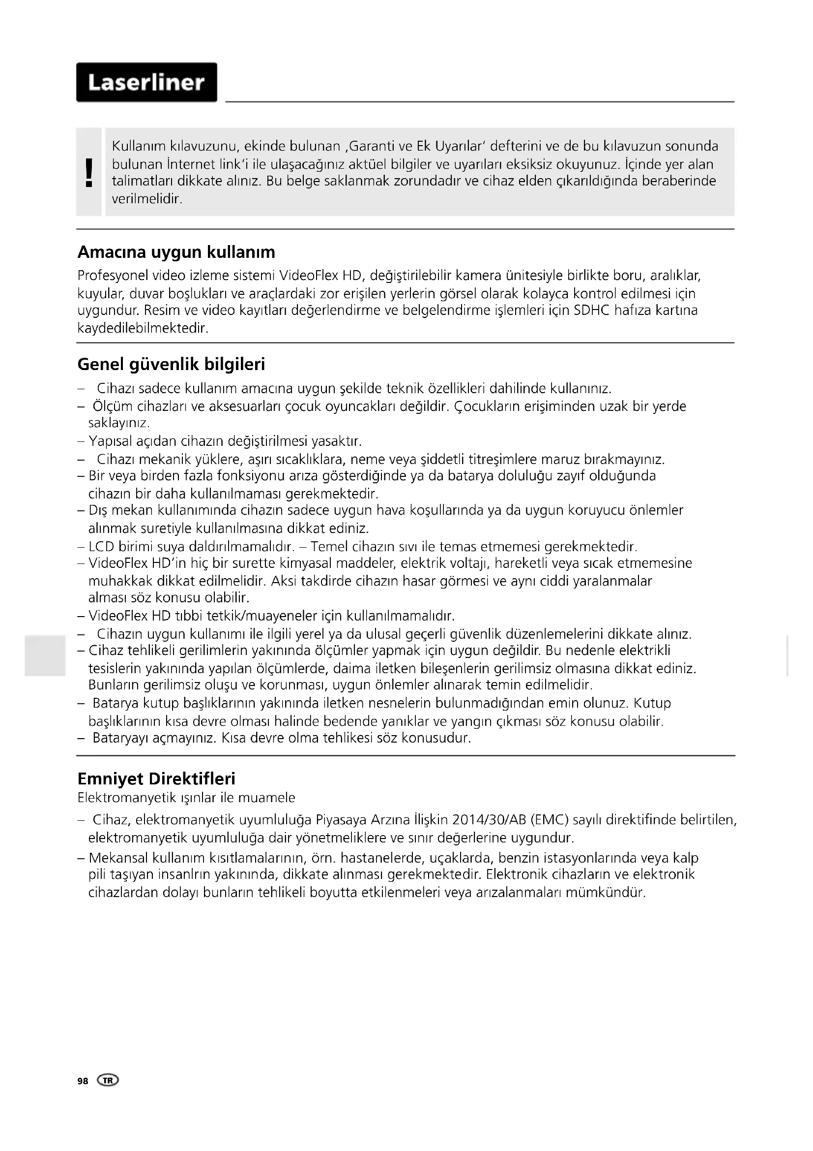 NOEmniyet Direktieri Elektromanyetik ışınlar ile muamele – Cihaz, elektromanyetik uyumluluğa Piyasaya Arzına İlişkin 2014/30/AB (EMC) sayılı direktinde belirtilen, elektromanyetik uyumluluğa dair yönetmeliklere ve sınır değerlerine uygundur. – Mekansal kullanım kısıtlamalarının, örn. hastanelerde, uçaklarda, benzin istasyonlarında veya kalp pili taşıyan insanlrın yakınında, dikkate alınması gerekmektedir. Elektronik cihazların ve elektronik cihazlardan dolayı bunların tehlikeli boyutta etkilenmeleri veya arızalanmaları mümkündür. Genel güvenlik bilgileri – Cihazı sadece kullanım amacına uygun şekilde teknik özellikleri dahilinde kullanınız. – Ölçüm cihazları ve aksesuarları çocuk oyuncakları değildir. Çocukların erişiminden uzak bir yerde saklayınız. – Yapısal açıdan cihazın değiştirilmesi yasaktır. – Cihazı mekanik yüklere, aşırı sıcaklıklara, neme veya şiddetli titreşimlere maruz bırakmayınız. – Bir veya birden fazla fonksiyonu arıza gösterdiğinde ya da batarya doluluğu zayıf olduğunda cihazın bir daha kullanılmaması gerekmektedir. – Dış mekan kullanımında cihazın sadece uygun hava koşullarında ya da uygun koruyucu önlemler alınmak suretiyle kullanılmasına dikkat ediniz. – LCD birimi suya daldırılmamalıdır. – Temel cihazın sıvı ile temas etmemesi gerekmektedir. – VideoFlex HD’in hiç bir surette kimyasal maddeler, elektrik voltajı, hareketli veya sıcak etmemesine muhakkak dikkat edilmelidir. Aksi takdirde cihazın hasar görmesi ve aynı ciddi yaralanmalar alması söz konusu olabilir. – VideoFlex HD tıbbi tetkik/muayeneler için kullanılmamalıdır. – Cihazın uygun kullanımı ile ilgili yerel ya da ulusal geçerli güvenlik düzenlemelerini dikkate alınız. – Cihaz tehlikeli gerilimlerin yakınında ölçümler yapmak için uygun değildir. Bu nedenle elektrikli tesislerin yakınında yapılan ölçümlerde, daima iletken bileşenlerin gerilimsiz olmasına dikkat ediniz. Bunların gerilimsiz oluşu ve korunması, uygun önlemler alınarak temin edilmelidir. – Batarya kutup başlıklarının yakınında iletken nesnelerin bulunmadığından emin olunuz. Kutup başlıklarının kısa devre olması halinde bedende yanıklar ve yangın çıkması söz konusu olabilir. – Bataryayı açmayınız. Kısa devre olma tehlikesi söz konusudur. Amacına uygun kullanım Profesyonel video izleme sistemi VideoFlex HD, değiştirilebilir kamera ünitesiyle birlikte boru, aralıklar, kuyular, duvar boşlukları ve araçlardaki zor erişilen yerlerin görsel olarak kolayca kontrol edilmesi için uygundur. Resim ve video kayıtları değerlendirme ve belgelendirme işlemleri için SDHC hafıza kartına kaydedilebilmektedir. Kullanım kılavuzunu, ekinde bulunan ‚Garanti ve Ek Uyarılar‘ defterini ve de bu kılavuzun sonunda bulunan İnternet link‘i ile ulaşacağınız aktüel bilgiler ve uyarıları eksiksiz okuyunuz. İçinde yer alan talimatları dikkate alınız. Bu belge saklanmak zorundadır ve cihaz elden çıkarıldığında beraberinde verilmelidir.