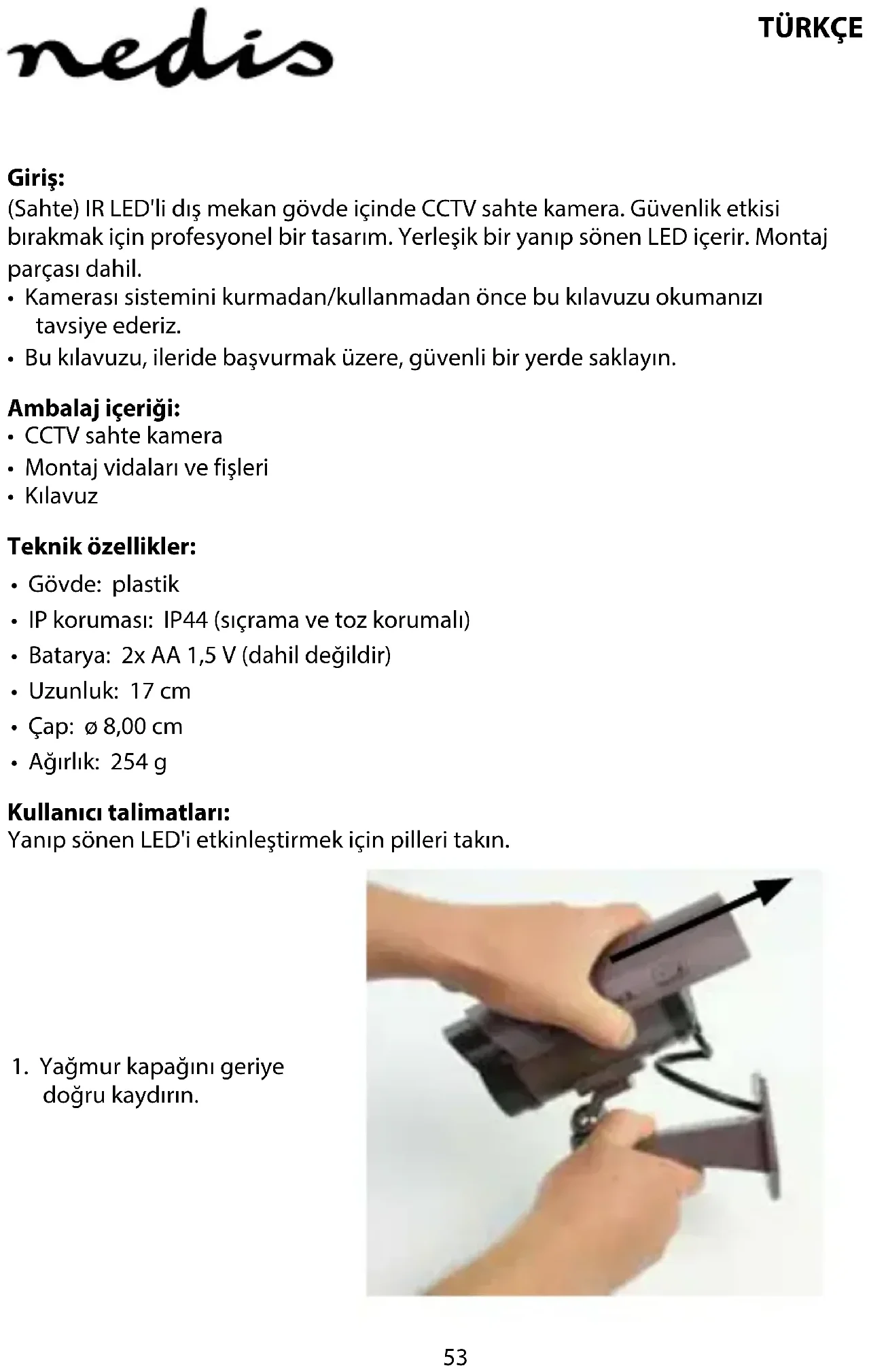 Giriş: (Sahte) IR LED'li dış mekan gövde içinde CCTV sahte kamera. Güvenlik etkisi bırakmak için profesyonel bir tasarım. Yerleşik bir yanıp sönen LED içerir. Montaj parçası dahil.