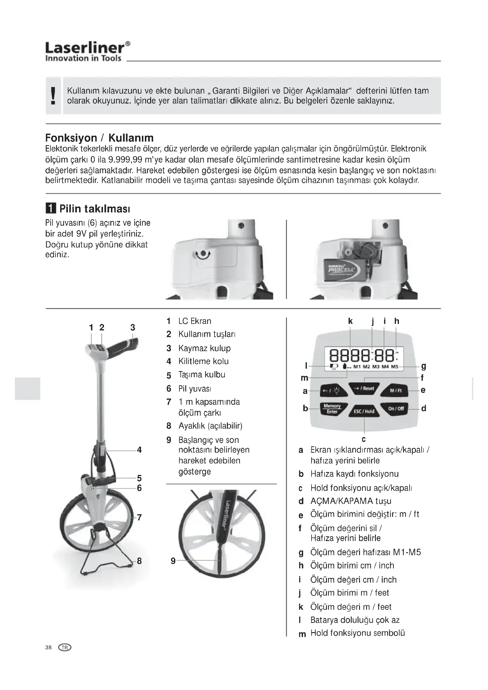 Fonksiyon / KullanČm Elektonik tekerlekli mesafe ölçer, düz yerlerde ve eŒrilerde yapÚlan çalÚŭmalar için öngörülmüŭtür. Elektronik ölçüm çarkÚ 0 ila 9.999,99 m'ye kadar olan mesafe ölçümlerinde santimetresine kadar kesin ölçüm deŒerleri saŒlamaktadÚr. Hareket edebilen göstergesi ise ölçüm esnasÚnda kesin baŭlangÚç ve son noktasÚnÚ belirtmektedir. Katlanabilir modeli ve taŭÚma çantasÚ sayesinde ölçüm cihazÚnÚn taŭÚnmasÚ çok kolaydÚr. Pil yuvasÚnÚ (6) açÚnÚz ve içine bir adet 9V pil yerleŭtiriniz. DoŒru kutup yönüne dikkat ediniz. Pilin takČlmasČ LC Ekran KullanÚm tuŭlarÚ Kaymaz kulup Kilitleme kolu TaŭÚma kulbu Pil yuvasÚ 1 m kapsamÚnda ölçüm çarkÚ AyaklÚk (açÚlabilir) BaŭlangÚç ve son noktasÚnÚ belirleyen hareket edebilen gösterge