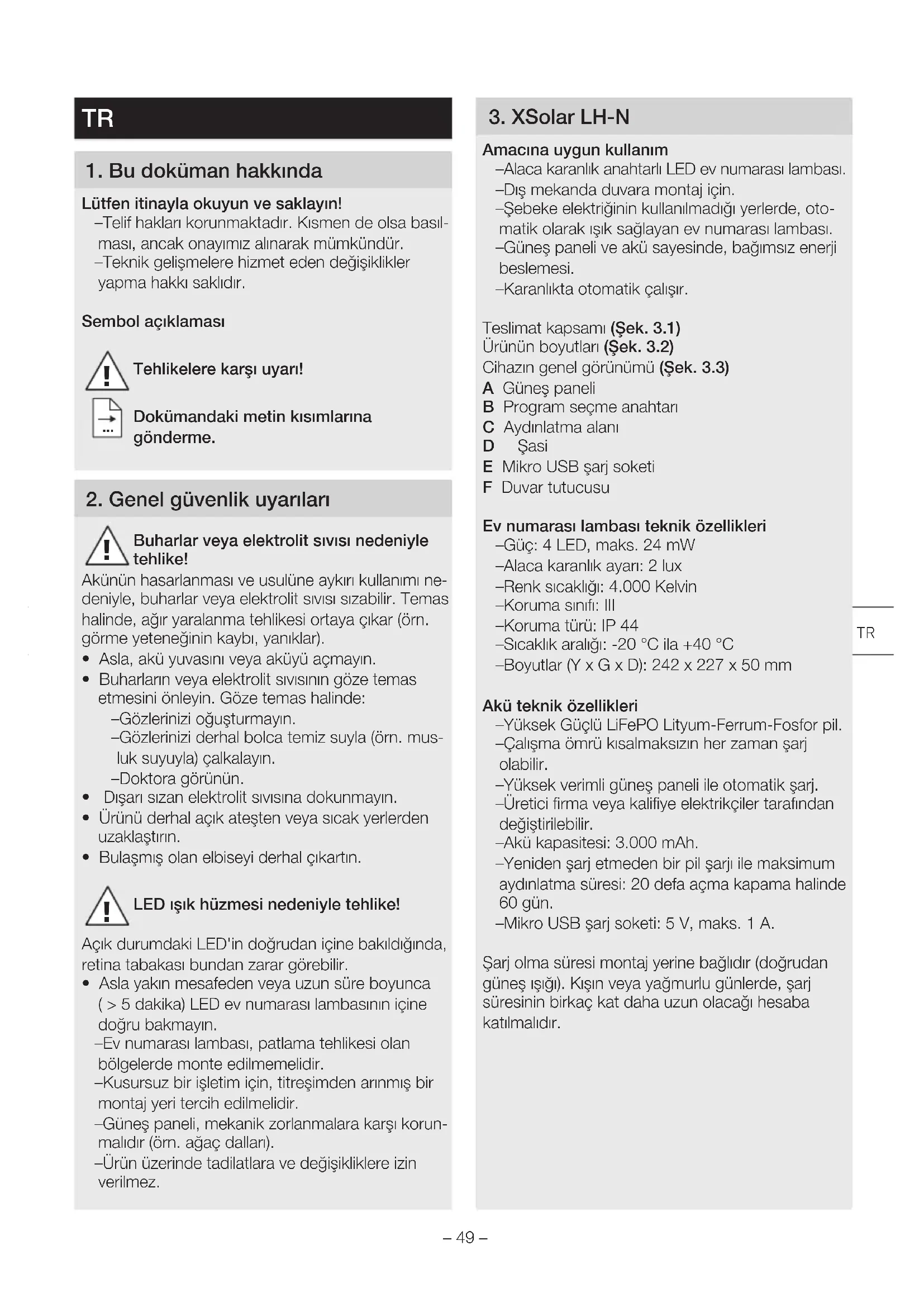 - Asla yakın mesafeden veya uzun süre boyunca ( > 5 dakika) LED ev numarası lambasının içine doğru bakmayın. – Ev numarası lambası, patlama tehlikesi olan bölgelerde monte edilmemelidir. – Kusursuz bir işletim için, titreşimden arınmış bir montaj yeri tercih edilmelidir. – Güneş paneli, mekanik zorlanmalara karşı korun- malıdır (örn. ağaç dalları). – Ürün üzerinde tadilatlara ve değişikliklere izin verilmez. 3 XSolar LH-N Amacına uygun kullanım – Alaca karanlık anahtarlı LED ev numarası lambası. – Dış mekanda duvara montaj için. – Şebeke elektriğinin kullanılmadığı yerlerde, oto- matik olarak ışık sağlayan ev numarası lambası. – Güneş paneli ve akü sayesinde, bağımsız enerji beslemesi. – Karanlıkta otomatik çalışır. Teslimat kapsamı (Şek 31) Ürünün boyutları (Şek 32) Cihazın genel görünümü (Şek 33) A Güneş paneli B Program seçme anahtarı C Aydınlatma alanı D Şasi E Mikro USB şarj soketi F Duvar tutucusu Ev numarası lambası teknik özellikleri – Güç: 4 LED, maks. 24 mW – Alaca karanlık ayarı: 2 lux – Renk sıcaklığı: 4.000 Kelvin – Koruma sınıfı: III – Koruma türü: IP 44 – Sıcaklık aralığı: -20 °C ila +40 °C – Boyutlar (YxGxD): 242 x 227 x 50 mm Akü teknik özellikleri – Yüksek Güçlü LiFePO Lityum-Ferrum-Fosfor pil. – Çalışma ömrü kısalmaksızın her zaman şarj olabilir. – Yüksek verimli güneş paneli ile otomatik şarj. – Üretici firma veya kalifiye elektrikçiler tarafından değiştirilebilir. – Akü kapasitesi: 3.000mAh. – Yeniden şarj etmeden bir pil şarjı ile maksimum aydınlatma süresi: 20 defa açma kapama halinde 60 gün. – Mikro USB şarj soketi: 5 V, maks. 1 A. Şarj olma süresi montaj yerine bağlıdır (doğrudan güneş ışığı). Kışın veya yağmurlu günlerde, şarj süresinin birkaç kat daha uzun olacağı hesaba katılmalıdır. TR– 50 – 4 Montaj