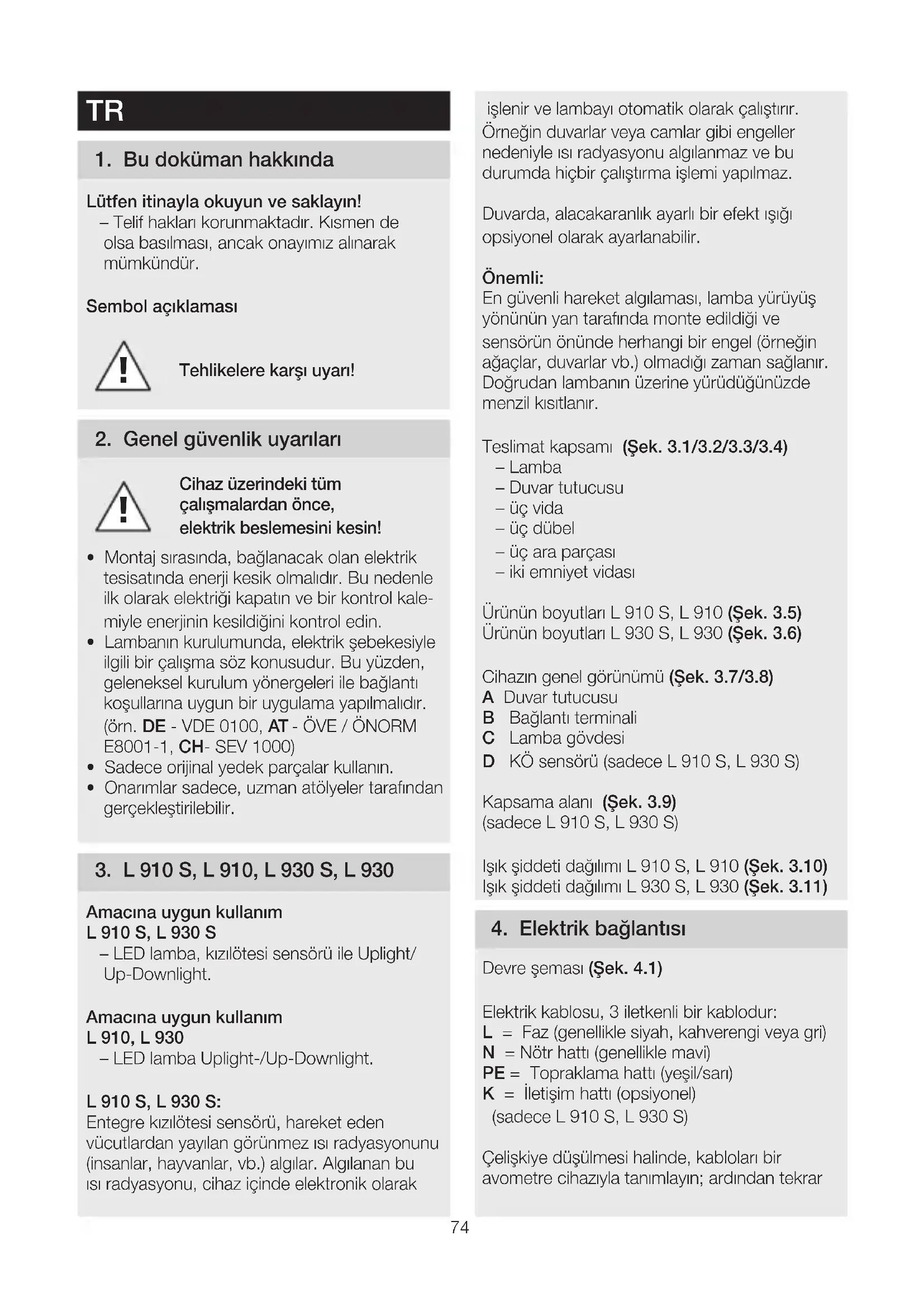 - Onarımlar sadece, uzman atölyeler tarafından gerçekleştirilebilir. 3 L910S, L910, L930S, L930 Amacına uygun kullanım L910S, L930S – LED lamba, kızılötesi sensörü ile Uplight/ Up-Downlight. Amacına uygun kullanım L910, L930 – LED lamba Uplight-/Up-Downlight. L910S, L930S: Entegre kızılötesi sensörü, hareket eden vücutlardan yayılan görünmez ısı radyasyonunu (insanlar, hayvanlar, vb.) algılar. Algılanan bu ısı radyasyonu, cihaz içinde elektronik olarak işlenir ve lambayı otomatik olarak çalıştırır. Örneğin duvarlar veya camlar gibi engeller nedeniyle ısı radyasyonu algılanmaz ve bu durumda hiçbir çalıştırma işlemi yapılmaz. Duvarda, alacakaranlık ayarlı bir efekt ışığı opsiyonel olarak ayarlanabilir. Önemli: En güvenli hareket algılaması, lamba yürüyüş yönünün yan tarafında monte edildiği ve sensörün önünde herhangi bir engel (örneğin ağaçlar, duvarlar vb.) olmadığı zaman sağlanır. Doğrudan lambanın üzerine yürüdüğünüzde menzil kısıtlanır. Teslimat kapsamı (Şek 31/32/33/34) – Lamba – Duvar tutucusu – üç vida – üç dübel – üç ara parçası – iki emniyet vidası Ürünün boyutları L910S, L910 (Şek 35) Ürünün boyutları L930S, L930 (Şek 36) Cihazın genel görünümü (Şek 37/38) A Duvar tutucusu B Bağlantı terminali C Lamba gövdesi D KÖ sensörü (sadece L910S, L930S) Kapsama alanı (Şek 39) (sadece L910S, L930S) Işık şiddeti dağılımı L910S, L910 (Şek 310) Işık şiddeti dağılımı L930S, L930 (Şek 311) 4 Elektrik bağlantısı Devre şeması (Şek 41) Elektrik kablosu, 3 iletkenli bir kablodur: L = Faz (genellikle siyah, kahverengi veya gri) N = Nötr hattı (genellikle mavi) PE = Topraklama hattı (yeşil/sarı) K = İletişim hattı (opsiyonel) (sadece L910S, L930S) Çelişkiye düşülmesi halinde, kabloları bir avometre cihazıyla tanımlayın; ardından tekrar75 elektriksiz hale getirin. Faz (L) ve nötr kablosu (N) avize terminaline bağlanmalıdır; topraklama kablosu (PE) ise (E) terminaline bağlanır. (Şek 55/56) Önemli: Bağlantıların karıştırılması, daha sonra cihazda veya sigorta kutusunda kısa devreye neden olur. Bu durumda, kabloların hepsini tekrar tanımla- mak ve yeniden birleştirmek zorundasınız. Elektrik besleme kablosuna, açma ve kapama için uygun bir elektrik anahtarı tesis edilebilir. Bu lambanın ışık kaynağı değiştirilemez; ışık kaynağının değiştirilmesi gerektiğinde (örn. çalışma ömrü sona erdiğinde), komple lambanın yenilenmesi gerekir. Grup davranışı İletişim kablosu (K) üzerinden, L910S, L930S lambalar ile bir STEINEL dahili grup ağı kurulma- sı mümkündür.Bunun için, bağlantı bölümündeki kapama dilini kırıp çıkarın. (Şek 42) Maksimum 10 lamba birbiriyle ağ oluşturabilir. İletişim hattının maksimum uzunluğu 50 m olabilir. Bir grup içindeki ilk lamba, hareket algıladığında toplam grubu AÇIK konumuna getirir Ayarlanan süre sona erdiğinde başka bir hareket algılan- mıyorsa, bir grup içindeki son lamba toplam grubu KAPALI konumuna getirir Not: – İletişim hattı üzerine elektrik verilemez. Harici yükleri çalıştırmayın! – Grup ağı dahilinde tüm lambalar, DIP anahtarı yardımıyla kendilerine göre ayarlanan değerleri izler. – Test modunda bir grup ağı kurulması mümkün değildir. 5 Montaj