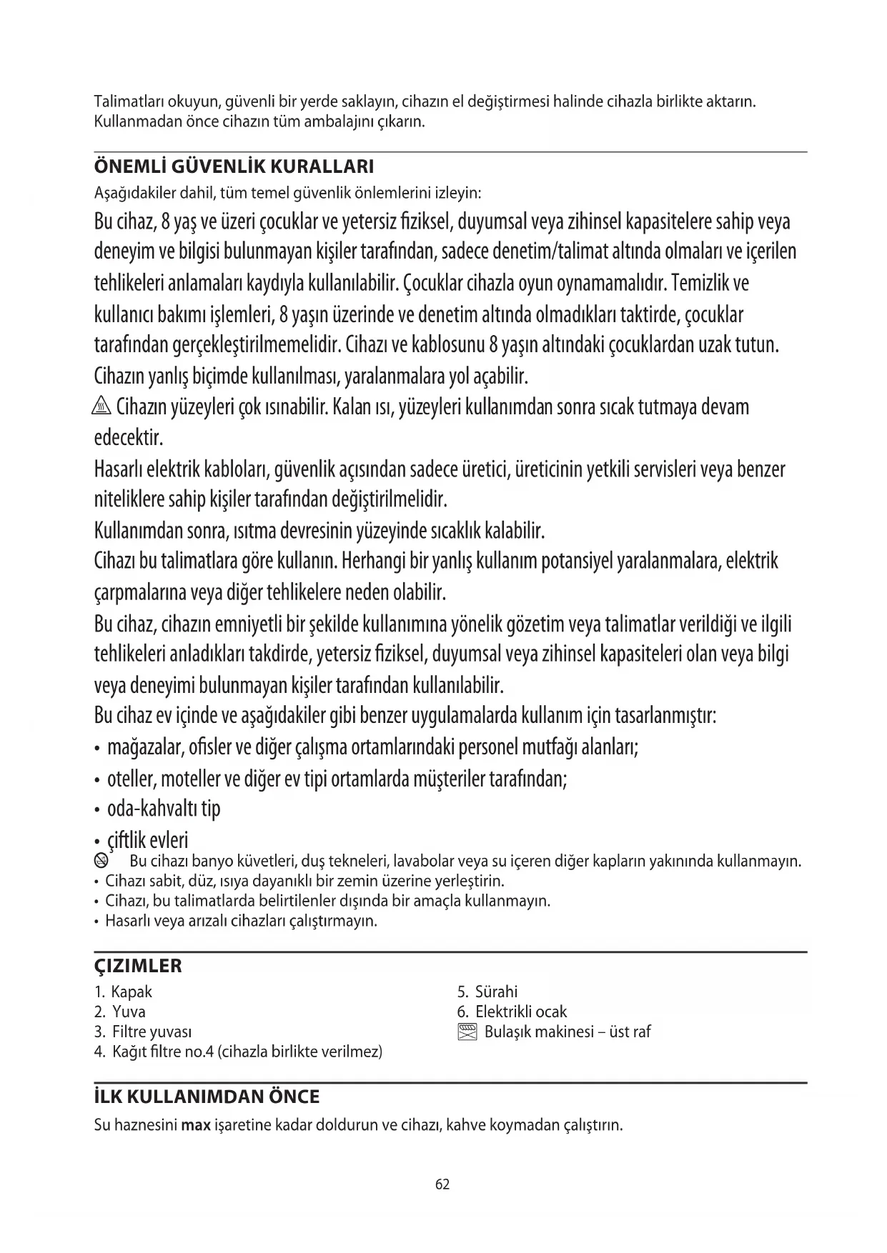 Aşağıdakiler dahil, tüm temel güvenlik önlemlerini izleyin: Bu cihaz, 8 yaş ve üzeri çocuklar ve yetersiz ziksel, duyumsal veya zihinsel kapasitelere sahip veya deneyim ve bilgisi bulunmayan kişiler tarafından, sadece denetim/talimat altında olmaları ve içerilen tehlikeleri anlamaları kaydıyla kullanılabilir. Çocuklar cihazla oyun oynamamalıdır. Temizlik ve kullanıcı bakımı işlemleri, 8 yaşın üzerinde ve denetim altında olmadıkları taktirde, çocuklar tarafından gerçekleştirilmemelidir. Cihazı ve kablosunu 8 yaşın altındaki çocuklardan uzak tutun. Cihazın yanlış biçimde kullanılması, yaralanmalara yol açabilir. h Cihazın yüzeyleri çok ısınabilir. Kalan ısı, yüzeyleri kullanımdan sonra sıcak tutmaya devam edecektir. Hasarlı elektrik kabloları, güvenlik açısından sadece üretici, üreticinin yetkili servisleri veya benzer niteliklere sahip kişiler tarafından değiştirilmelidir. Kullanımdan sonra, ısıtma devresinin yüzeyinde sıcaklık kalabilir. Cihazı bu talimatlara göre kullanın. Herhangi bir yanlış kullanım potansiyel yaralanmalara, elektrik çarpmalarına veya diğer tehlikelere neden olabilir. Bu cihaz, cihazın emniyetli bir şekilde kullanımına yönelik gözetim veya talimatlar verildiği ve ilgili tehlikeleri anladıkları takdirde, yetersiz ziksel, duyumsal veya zihinsel kapasiteleri olan veya bilgi veya deneyimi bulunmayan kişiler tarafından kullanılabilir. Bu cihaz ev içinde ve aşağıdakiler gibi benzer uygulamalarda kullanım için tasarlanmıştır: