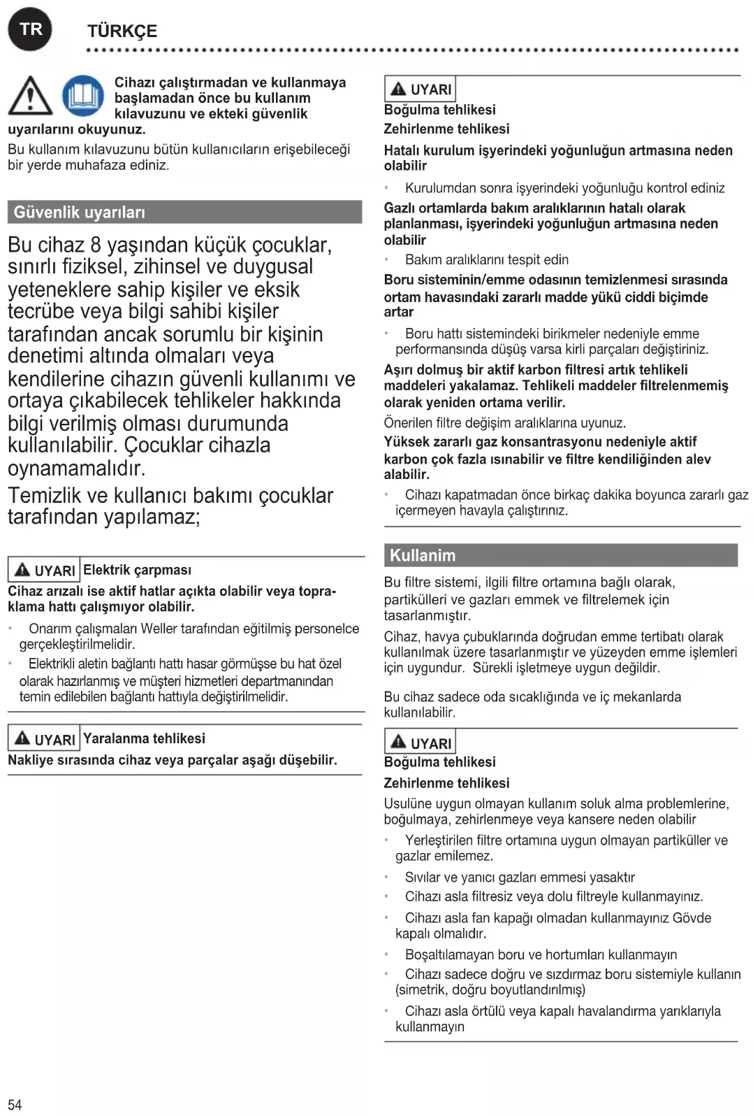 - Gaz moleküllerinin kaynama sıcaklığı > 0 °C Yapışkanbuharlarınıemmekiçinbirgenişbantlıgazltresi (asılıparçacıklarltresiolmadan)kullanınız. temizliği ve bakımı UYARI Aletin kendinde bir çalışma yapmadan önce şi prizden çekin. Çalıştıran kişi şin, erişimi olan her yerden uzakta olduğunu kontrol edebilmelidir. Alette kesinlikle değişiklik yapılmamalıdır! Onarım çalışmaları Weller tarafından eğitilmiş personelce gerçekleştirilmelidir. Sadece orijinal WELLER yedek parçaları kullanılmalıdır. Filtre değişimi year MIN 1x HEPA iltresi ve geni bant cam ltre e le tirilmi tir ve böylece kompak ltre olarak birlikte de i tirilmelidir. Partikül ltresi (Filtre yata ı), kompak ltrenin ön ltreleme kademesidir ve bu yüzden daha sık de i tirilmelidir. İnce toz ltresinin en geç her 10. değişiminde kompakt ltrenin de değiştirilmesini özellikle tavsiye ederiz. Filtresisteminindüzgünçalışmasıiçinltreaşağıdakigibi değiştirilmelidir: