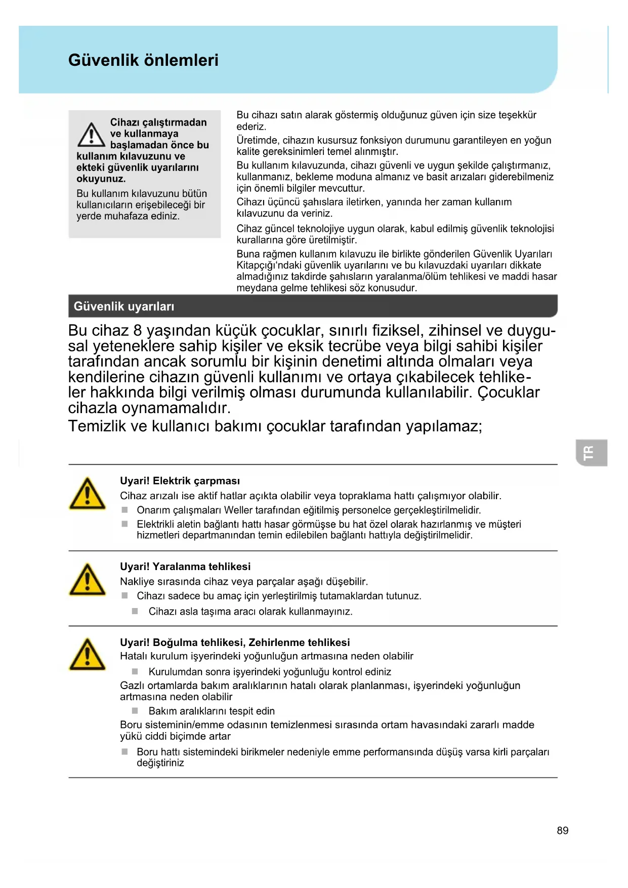 lerhakkındailgiverilmişolmasıdurumundakullanılailirocuklar cihazlaoynamamalıdır Temizlikvekullanıcıakımıçocuklartarafındanyapılamaz Uyari! Elektrik çarpması ihazarızalıiseaktifhatlaraçıktaolailirveyatopraklamahattıçalışmıyorolailir Onarımçalışmalarıellertarafındaneitilmişpersonelcegerçekleştirilmelidir Elektriklialetinalantıhattıhasargrmşseuhatzelolarakhazırlanmışvemşteri hizmetleridepartmanındanteminedileilenalantıhattıyladeiştirilmelidir Uyari! Yaralanma tehlikesi akliyesırasındacihazveyaparçalaraşaıdşeilir ihazısadeceuamaçiçinyerleştirilmiştutamaklardantutunuz ihazıaslataşımaaracıolarakkullanmayınız Uyari! Boğulma tehlikesi, Zehirlenme tehlikesi atalıkurulumişyerindekiyounluunartmasınanedenolailir urulumdansonraişyerindekiyounluukontrolediniz azlıortamlardaakımaralıklarınınhatalıolarakplanlanmasıişyerindekiyounluun artmasınanedenolailir akımaralıklarınıtespitedin orusistemininemmeodasınıntemizlenmesisırasındaortamhavasındakizararlımadde ykciddiiçimdeartar oruhattısistemindekiirikmelernedeniyleemmeperformansındadşşvarsakirliparçaları deiştiriniz90