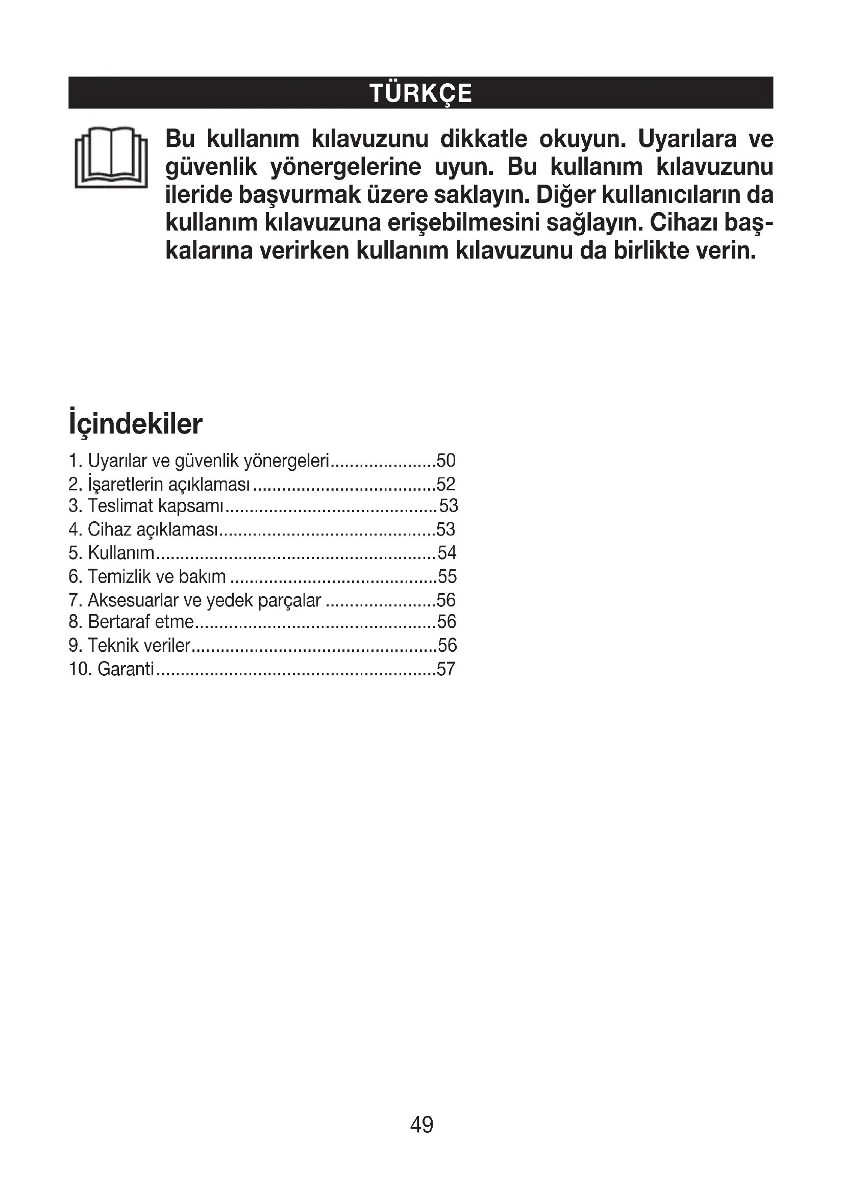 1. Uyarılar ve güvenlik yönergeleri ......................50