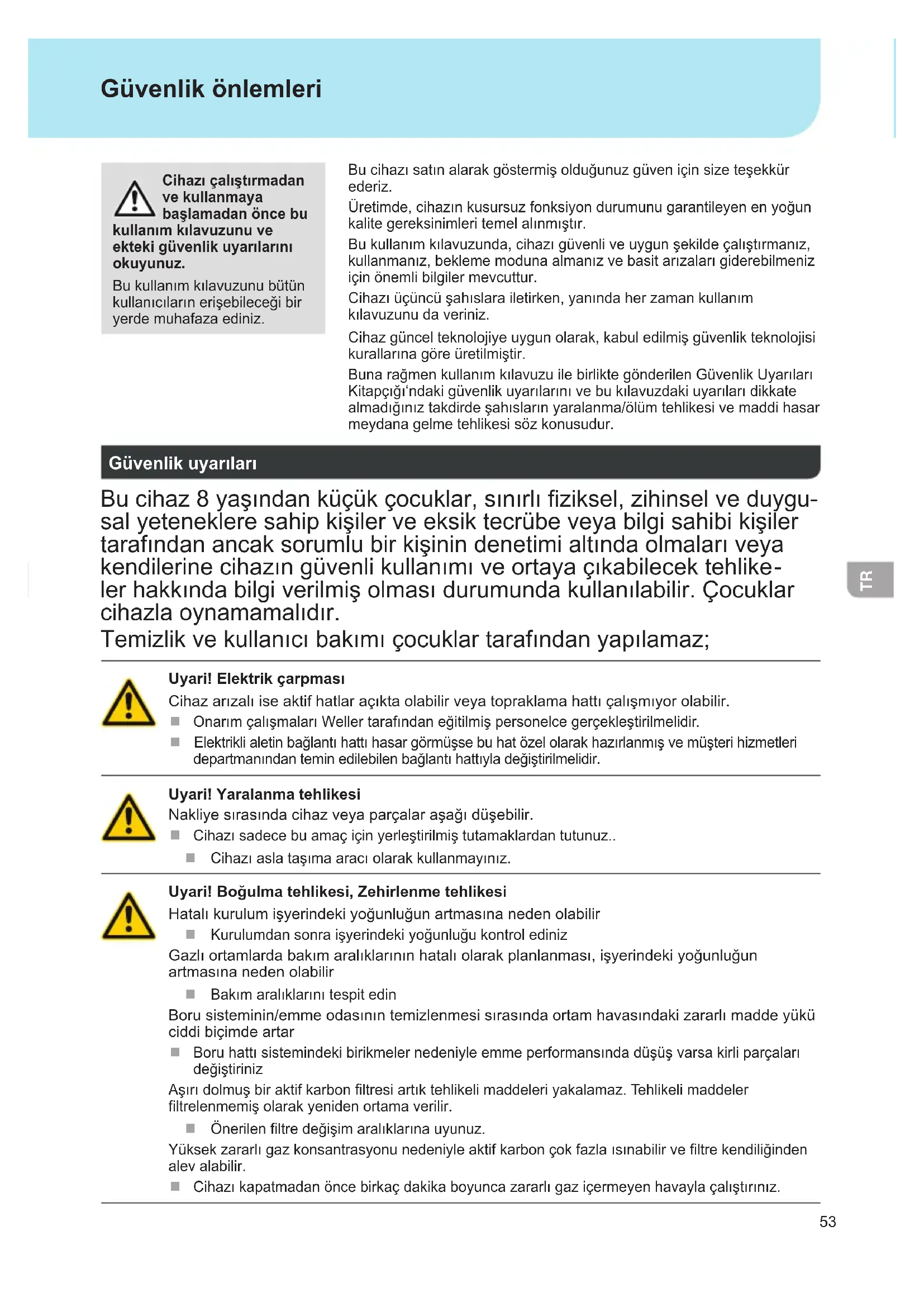 lerhakkındabilgiverilmişolmasıdurumundakullanılabilir.Çocuklar cihazlaoynamamalıdır. Temizlikvekullanıcıbakımıçocuklartarafındanyapılamaz; Uyari! Elektrik çarpması Cihazarızalıiseaktifhatlaraçıktaolabilirveyatopraklamahattıçalışmıyorolabilir. OnarımçalışmalarıWellertarafındaneğitilmişpersonelcegerçekleştirilmelidir. Elektriklialetinbağlantıhattıhasargörmüşsebuhatözelolarakhazırlanmışvemüşterihizmetleri departmanındanteminedilebilenbağlantıhattıyladeğiştirilmelidir. Uyari! Yaralanma tehlikesi Nakliyesırasındacihazveyaparçalaraşağıdüşebilir. Cihazısadecebuamaçiçinyerleştirilmiştutamaklardantutunuz.. Cihazıaslataşımaaracıolarakkullanmayınız. Uyari! Boğulma tehlikesi, Zehirlenme tehlikesi Hatalıkurulumişyerindekiyoğunluğunartmasınanedenolabilir Kurulumdansonraişyerindekiyoğunluğukontrolediniz Gazlıortamlardabakımaralıklarınınhatalıolarakplanlanması,işyerindekiyoğunluğun artmasınanedenolabilir Bakımaralıklarınıtespitedin Borusisteminin/emmeodasınıntemizlenmesisırasındaortamhavasındakizararlımaddeyükü ciddi biçimde artar Boruhattısistemindekibirikmelernedeniyleemmeperformansındadüşüşvarsakirliparçaları değiştiriniz Aşırıdolmuşbiraktifkarbonltresiartıktehlikelimaddeleriyakalamaz. Tehlikeli maddeler ltrelenmemişolarakyenidenortamaverilir. Önerilenltredeğişimaralıklarınauyunuz. Yüksekzararlıgazkonsantrasyonunedeniyleaktifkarbonçokfazlaısınabilirveltrekendiliğinden alev alabilir. Cihazıkapatmadanöncebirkaçdakikaboyuncazararlıgaziçermeyenhavaylaçalıştırınız.54