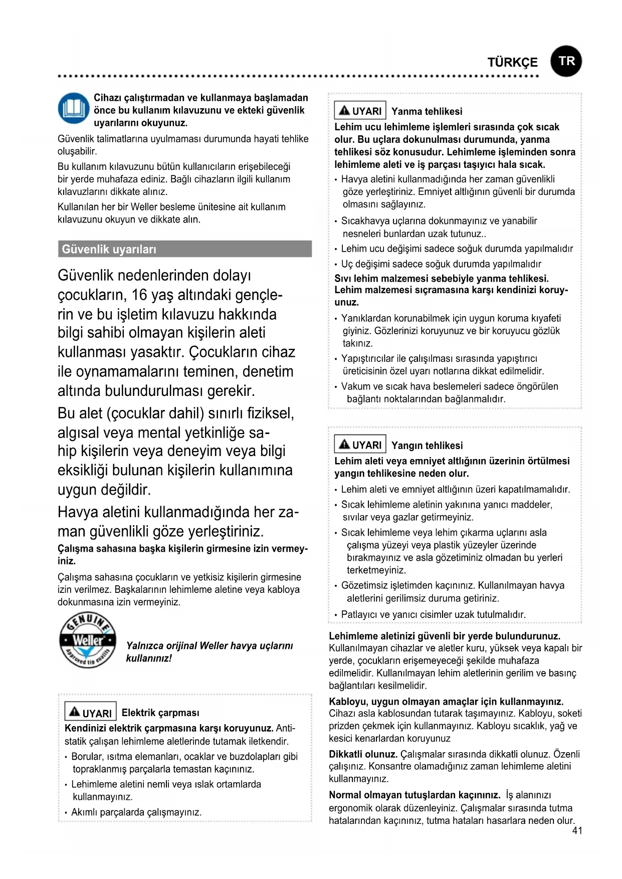 ΕΛΛΗΝΙΚΑ41 Cihazı çalıştırmadan ve kullanmaya başlamadan önce bu kullanım kılavuzunu ve ekteki güvenlik uyarılarını okuyunuz. Güvenlik talimatlarına uyulmaması durumunda hayati tehlike oluşabilir. Bu kullanım kılavuzunu bütün kullanıcıların erişebileceği bir yerde muhafaza ediniz. Bağlı cihazların ilgili kullanım kılavuzlarını dikkate alınız. Kullanılan her bir Weller besleme ünitesine ait kullanım kılavuzunu okuyun ve dikkate alın. Güvenlik uyarıları Güvenlik nedenlerinden dolayı çocukların, 16 yaş altındaki gençle- rin ve bu işletim kılavuzu hakkında bilgi sahibi olmayan kişilerin aleti kullanması yasaktır. Çocukların cihaz ile oynamamalarını teminen, denetim altında bulundurulması gerekir. Bu alet (çocuklar dahil) sınırlı ziksel, algısal veya mental yetkinliğe sa