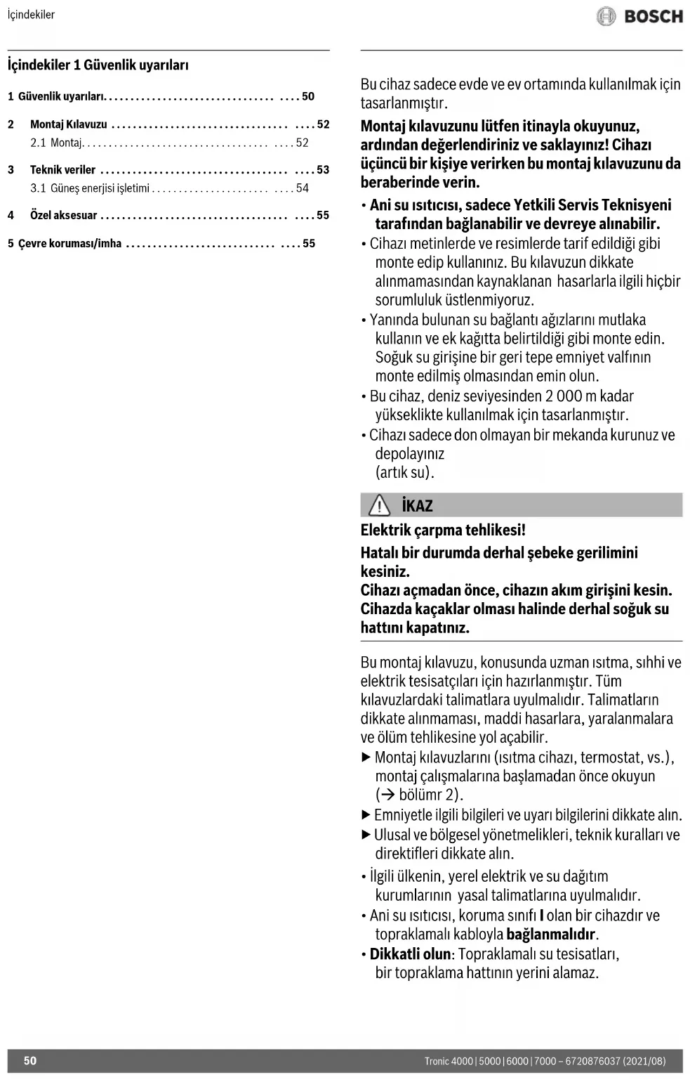 - Sadece güneş enerjisiyle çalıştırılmaya uygun cihazlarda: Termostatlı ön karıştırıcı ön ısıtmalı suyun kullanıldığı ev tesisatına montaj için 5 Çevre koruması/imha Çevre koruması, Bosch Grubu'nun temel bir şirket prensibidir. Ürünlerin kalitesi, ekonomiklilik ve çevre koruması, bizler için aynı önem seviyesindedir. Çevre korumasına ilişkin yasalara ve talimatlara çok sıkı bir şekilde uyulmaktadır. Çevrenin korunması için bizler, mümkün olan en iyi teknolojiyi ve malzemeyi kullanmaya özen gösteririz. Ambalaj Ürünlerin ambalajında, optimum bir geri kazanıma (Recycling) imkan sağlayan, ülkeye özel geri kazandırma sistemleri kullanılmaktadır. Kullandığımız tüm paketleme malzemeleri çevreye zarar vermeyen, geri dönüşümlü malzemelerdir. Kullanılmış cihaz Kullanılmış cihazlar, tekrar kullanılabilecek malzemeler içermektedir. Bu yapı grupları kolayca ayırt edilebilmektedir. Plastikler işaretlenmiştir. Böylelikle farklı grupları ayrıştırılabilir ve geri dönüştürme veya imha için yönlendirilebilir. Eski Elektrikli ve Elektronik Cihazlar Kullanılamaz durumdaki elektronik veya elektrikli cihazlar, ayrı bir yerde toplanmalı ve çevre korumasına uygun geri dönüşüm uygulaması için ilgili kuruluşlara teslim edilmelidir (eski elektronik ve elektrikli cihazlara ilişkin Avrupa Birliği yönetmeliği). Eski elektrikli veya elektronik cihazları imha etmek için, ülkeye özgü iade ve toplama sistemlerini kullanın. Piller evsel atık çöpüne atılmamalıdır. Kullanılmış piller, yerel toplama sistemlerinde imha edilmelidir.Съдържание Tronic 4000 | 5000 | 6000 | 7000 – 6720876037 (2021/08)