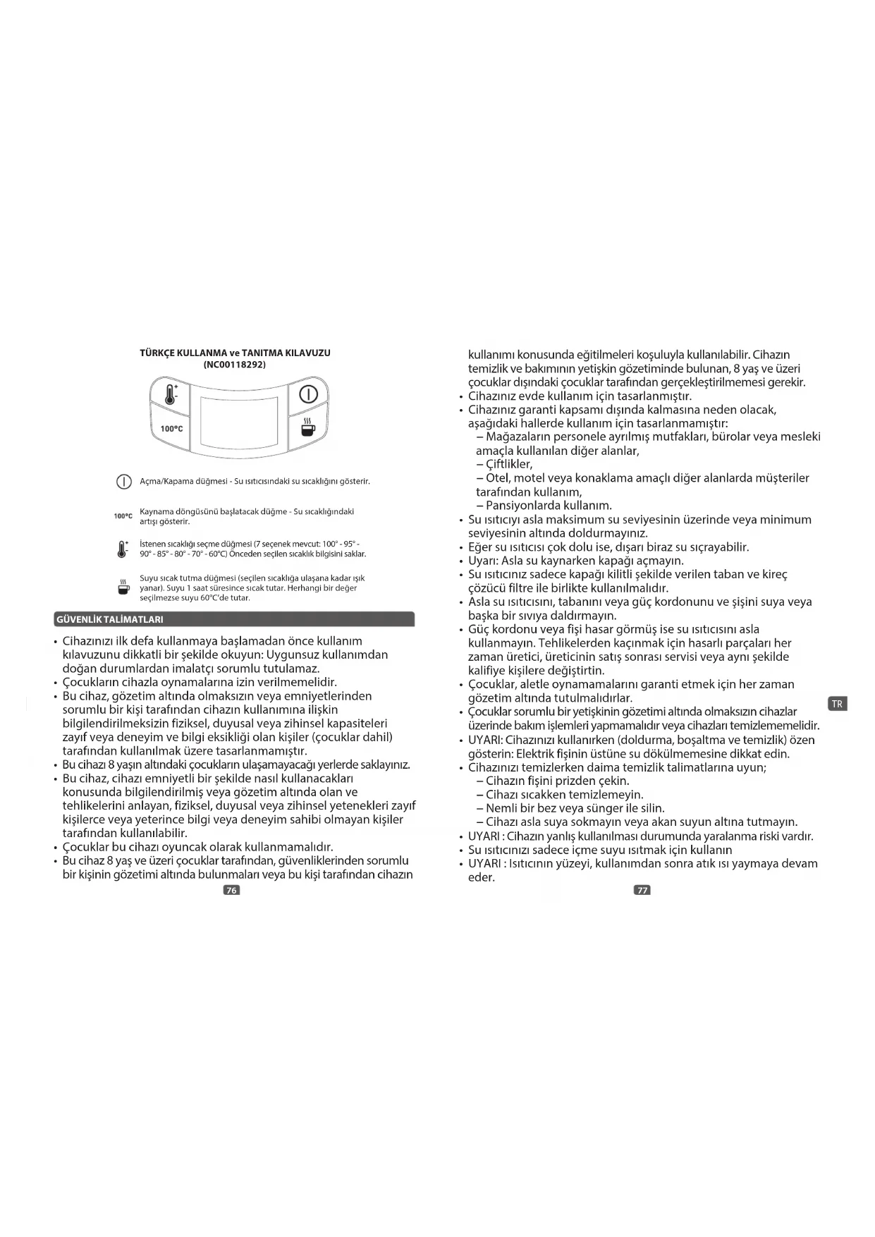 Su ısıtıcınızın ‘sıcak tutma’ fonksiyonu bulunmaktadır . Eğer daha önce bir sıcaklık seçtiyseniz, su bu dereceye kadar ısıtılacak ve 1 saat daha bu sıcaklıkta tutulacaktır. Eğer daha önce bir sıcaklık seçmediyseniz su 60°C sıcaklıkta tutulur. Suyu sıcak tutma fonksiyonu için izin verilen en yüksek sıcaklık 95°C’dir. NOT Ekran 30 dakika sonra kendiliğinden kapanacaktır (bekleme durumu) ama bütün düğmeler hala çalışır durumda olacaktır. Bu nedenle herhangi bir düğmeye basıldığında ekran yeniden açılacaktır. Eğer düğmesine basarak su ısıtıcısının içindeki suyun mevcut derecesinden daha düşük bir derece seçerseniz bu fonksiyon çalışmayacak ve ısınma döngüsü başlamayacaktır. Örneğin: Eğer su 90°C’de ise, 60°C/70°C/80°C/85°C’ler için ısınma döngüsünü başlatamazsınız. Tavsiye edilen sıcaklıklar: 70°C : beyaz çay 80-85°C : yeşil çay 90°C : taze çekilmiş kahve 95°C : siyah çay 100°C : kaynar su/demleme