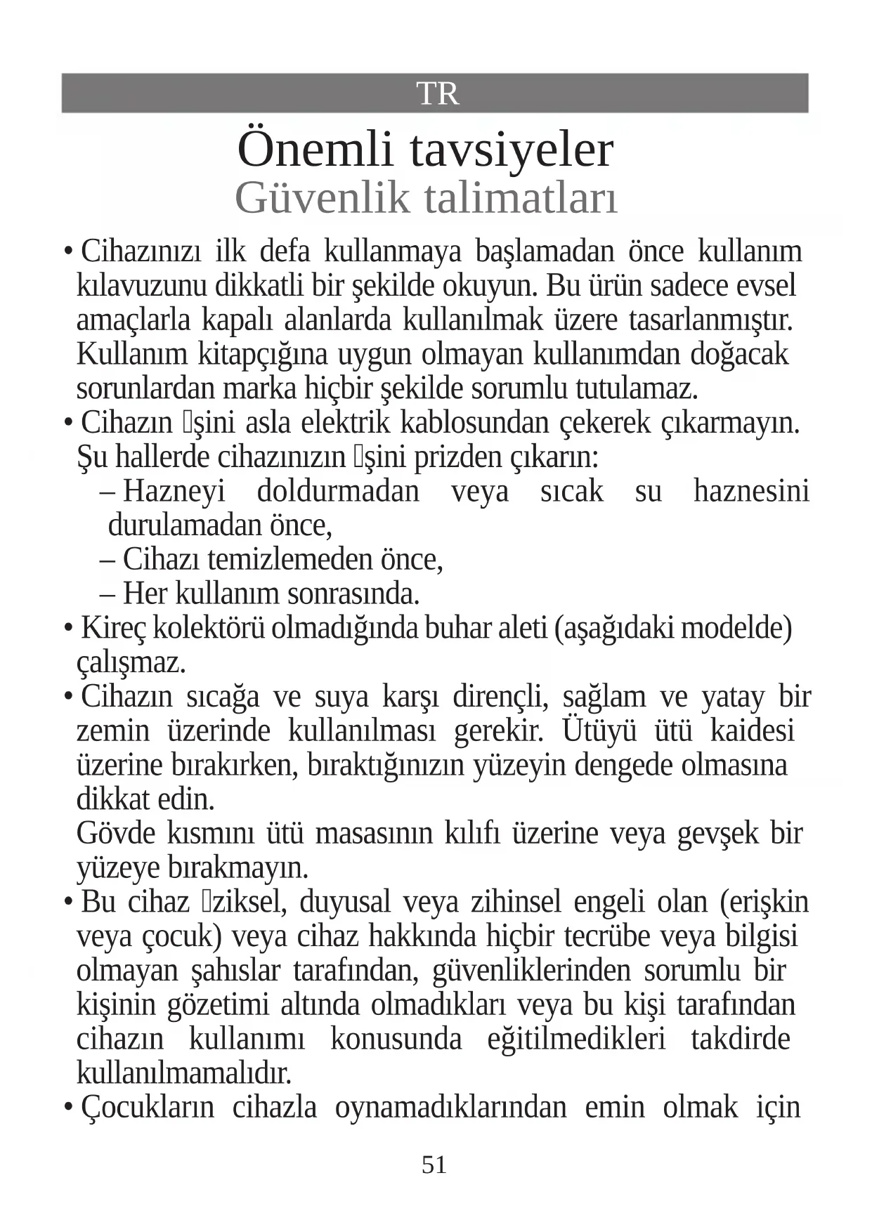 - Bu cihaz 8 yaş ve üzeri çocuklar ve cihaz hakkında hiçbir tecrübe veya bilgisi olmayan şahıslar tarafından, güvenliklerinden sorumlu bir kişinin gözetimi altında bulunmaları veya bu kişi tarafından cihazın kullanımı konusunda eğitilmeleri koşuluyla kullanılabilir. Çocuklar cihaz ile oynamamalıdır. Çocukların bir yetişkinin gözetimi olmadan cihazı temizlemelerine veya bakımını gerçekleştirmelerine izin verilmemelidir. Ütüyü ve kablosunu, çalışırken veya soğuma sırasında 8 yaşından küçük çocukların ulaşamayacakları yerlerde muhafaza edin.