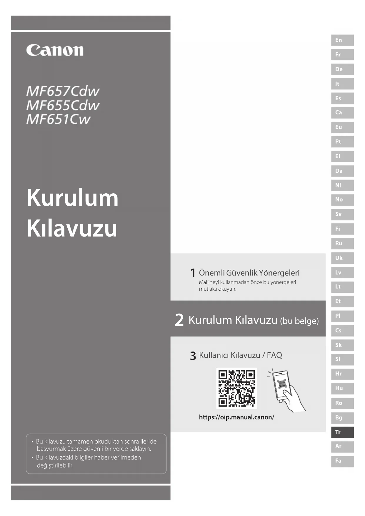 - Bu kılavuzu tamamen okuduktan sonra ileride başvurmak üzere güvenli bir yerde saklayın.• Bu kılavuzdaki bilgiler haber verilmeden değiştirilebilir.https://oip.manual.canon/ Önemli Güvenlik YönergeleriMakineyi kullanmadan önce bu yönergeleri mutlaka okuyun. Kullanıcı Kılavuzu / FAQ
