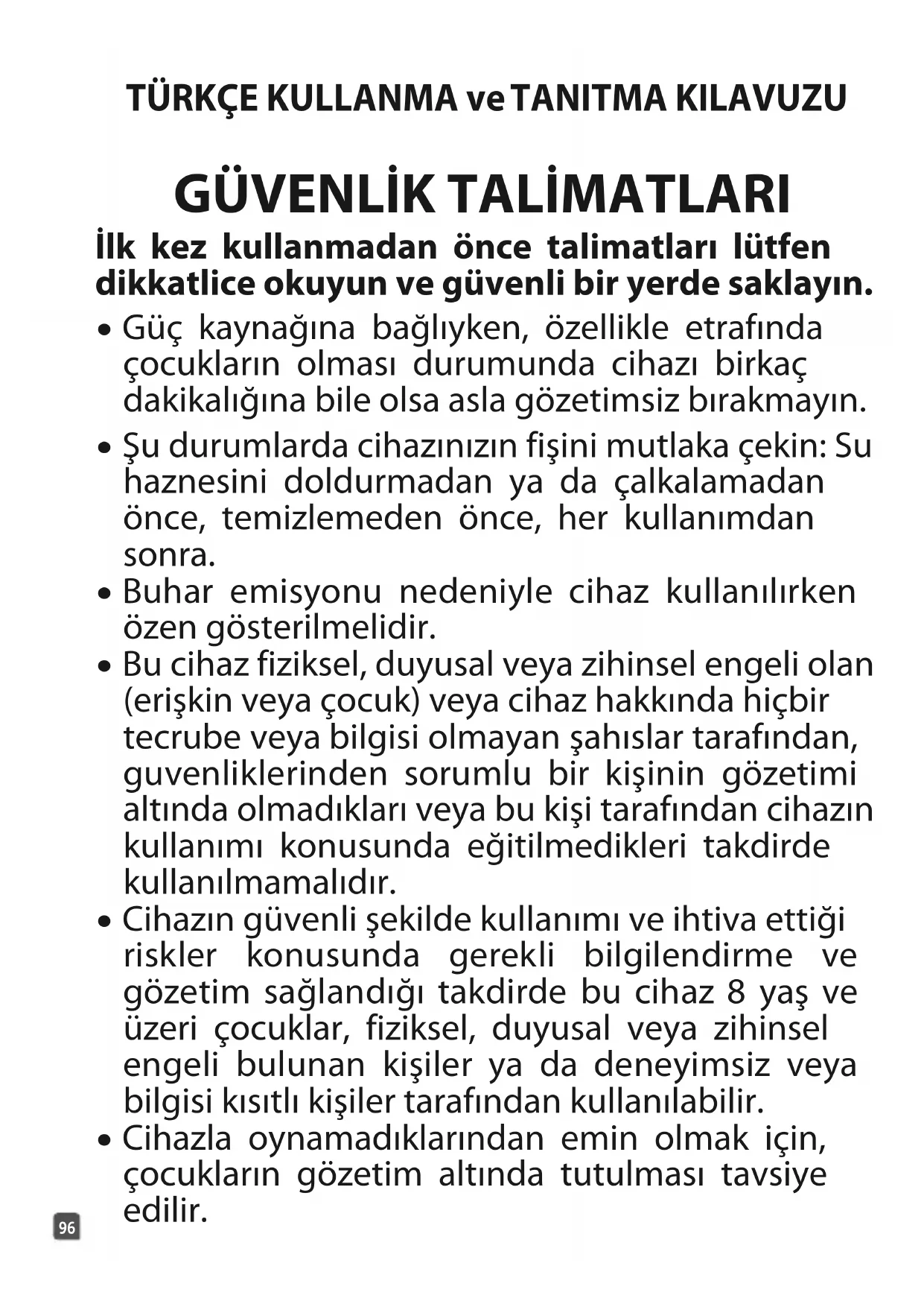 - Bu cihaz fiziksel, duyusal veya zihinsel engeli olan (erişkin veya çocuk) veya cihaz hakkında hiçbir tecrube veya bilgisi olmayan şahıslar tarafından, guvenliklerinden sorumlu bir kişinin gözetimi altında olmadıkları veya bu kişi tarafından cihazın kullanımı konusunda eğitilmedikleri takdirde kullanılmamalıdır.