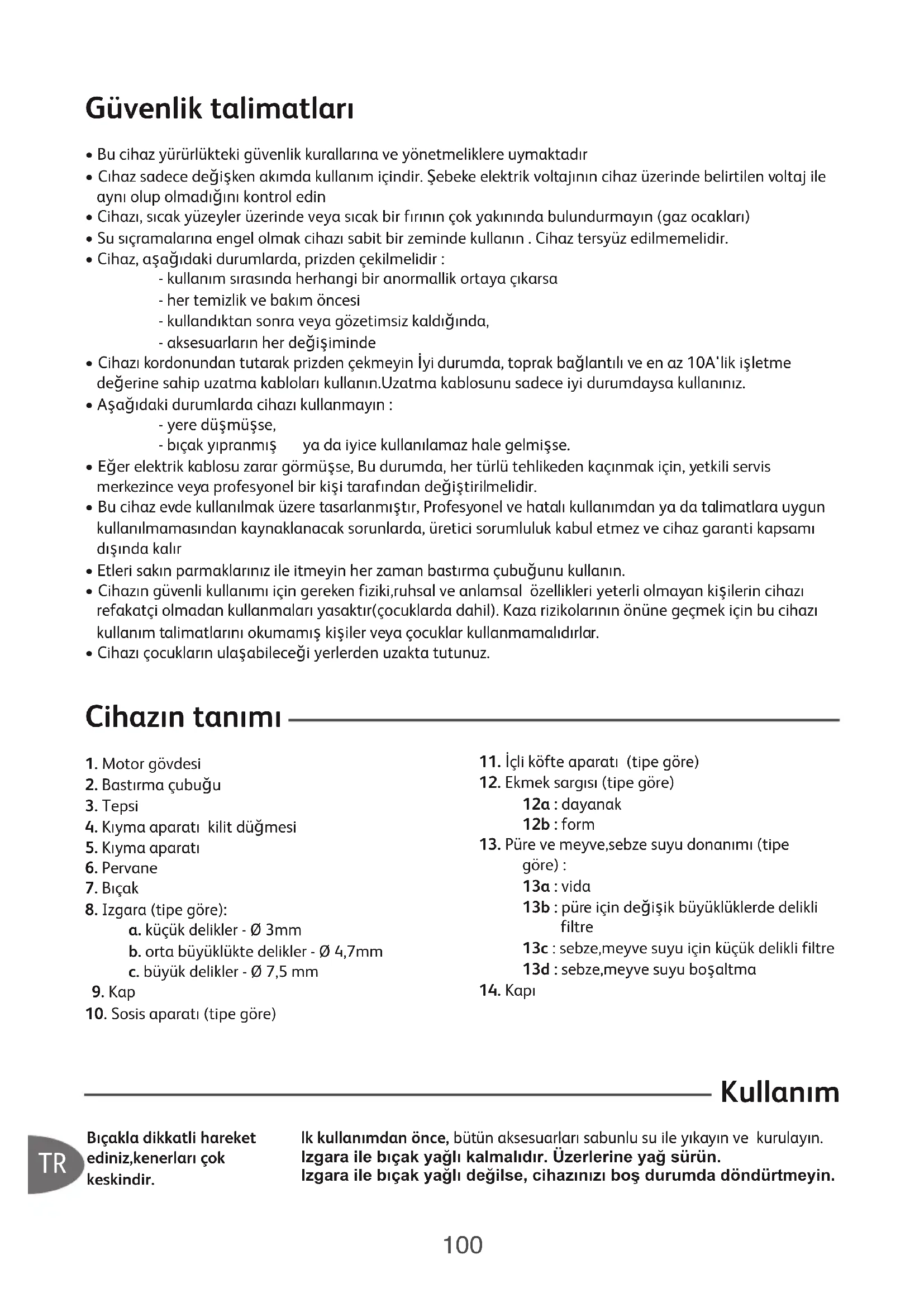 Kullanım lk kullanımdan önce, bütün aksesuarları sabunlu su ile yıkayın ve kurulayın. Izgara ile bıçak yağlı kalmalıdır. Üzerlerine yağ sürün. Izgara ile bıçak yağlı değilse, cihazınızı boş durumda döndürtmeyin. Bıçakla dikkatli hareket ediniz,kenerları çok keskindir.