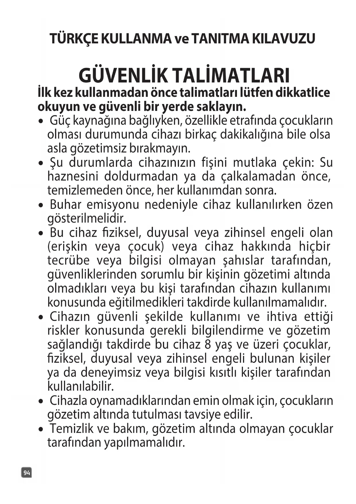 - Temizlik ve bakım, gözetim altında olmayan çocuklar tarafından yapılmamalıdır. TÜRKÇE KULLANMA ve TANITMA KILAVUZU95