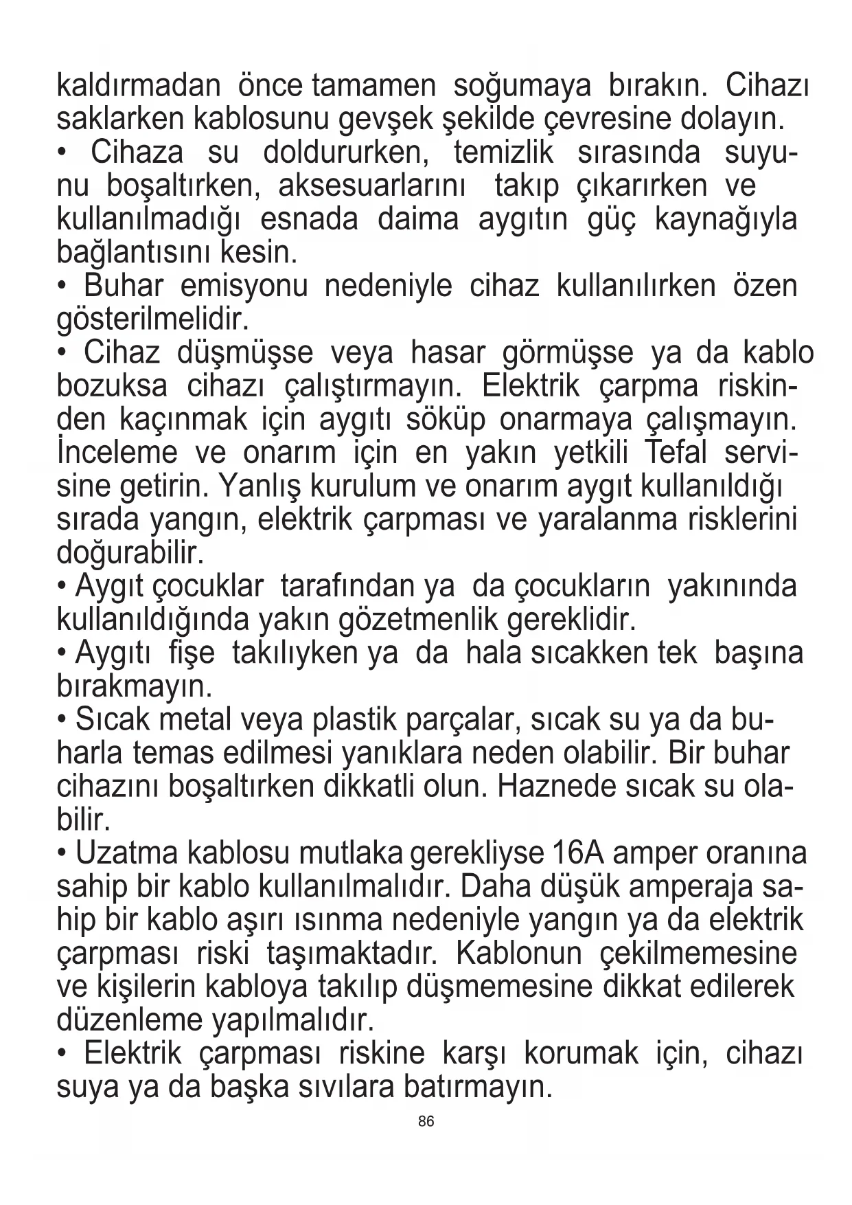 - Tefal tarafından temin edilmemiş olan aksesuarların kullanılması önerilmez ve yangın, elektrik çarpması veya yaralanmalara neden olabilir.