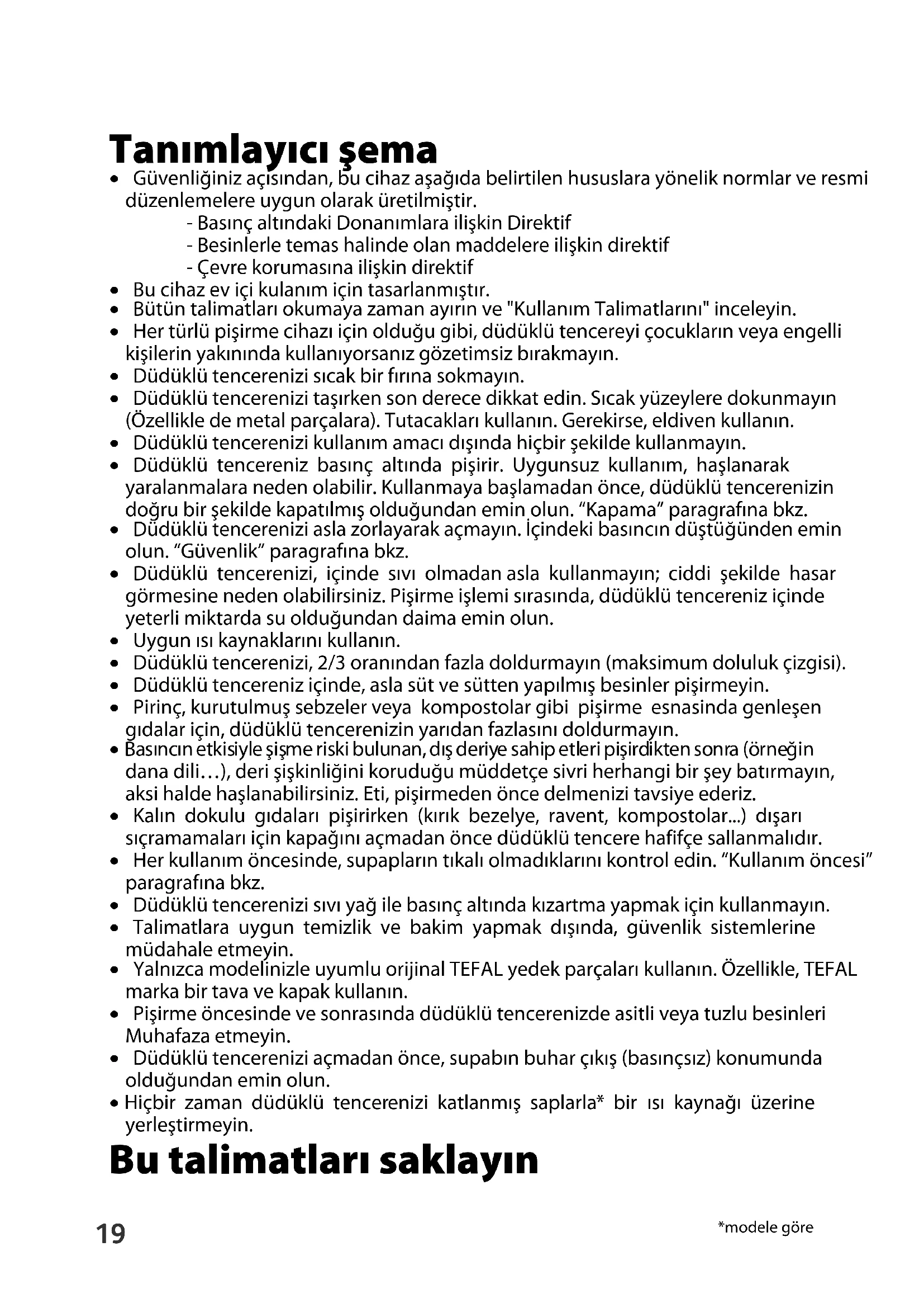 ardından, Yetkili bir TEFAL Servisine kontrol ettirmeniz gerekmektedir. *modele göre İbare Konum Üretici kimliği veya ticari marka. Kapanış butonu İmalat yıl ve partisi Model Çalışma basıncı (PF) Azami emniyet basıncı (PS) “Açık” konumunda olduğunda, kapağın üst kenarlarında görülebilir. Kapasite Haznenin dış tabanında37 *modele göre GARANTİ BELGESİ GARANTİ İLE İLGİLİ OLARAK DİKKAT EDİLMESİ GEREKEN HUSUSLAR Groupe Seb İstanbul tarafından verilen bu garanti, ürünün kullanma kılavuzunda yer alan hususlara aykırı kullanılmasından doğacak arızaların giderilmesini kapsamadığı gibi, aşağıdaki durumlar garanti dışıdır.