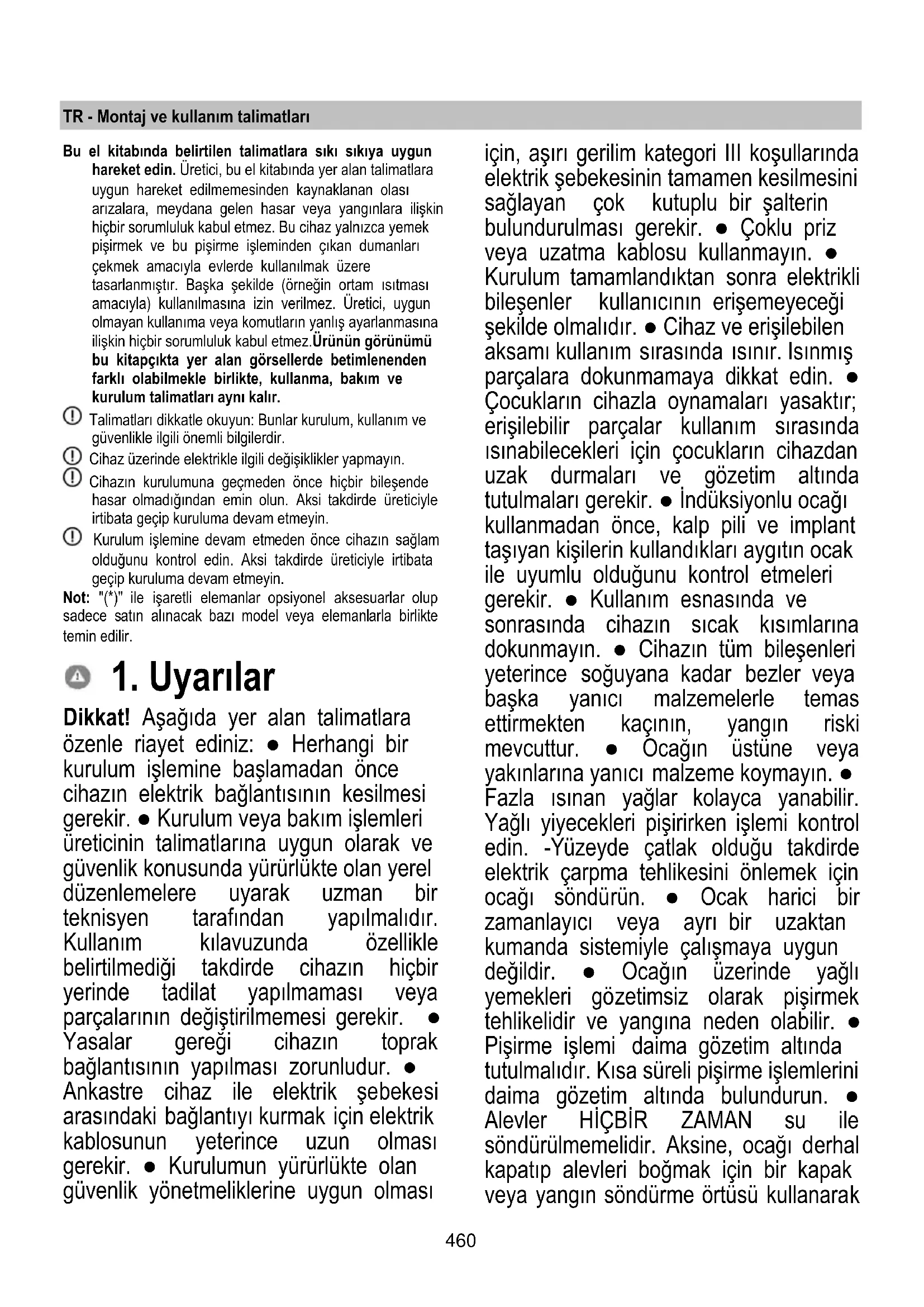 Dikkat! Aşağıda yer alan talimatlara özenle riayet ediniz: ● Herhangi bir kurulum işlemine başlamadan önce cihazın elektrik bağlantısının kesilmesi gerekir. ● Kurulum veya bakım işlemleri üreticinin talimatlarına uygun olarak ve güvenlik konusunda yürürlükte olan yerel düzenlemelere uyarak uzman bir teknisyen tarafından yapılmalıdır. Kullanım kılavuzunda özellikle belirtilmediği takdirde cihazın hiçbir yerinde tadilat yapılmaması veya parçalarının değiştirilmemesi gerekir. ● Yasalar gereği cihazın toprak bağlantısının yapılması zorunludur. ● Ankastre cihaz ile elektrik şebekesi arasındaki bağlantıyı kurmak için elektrik kablosunun yeterince uzun olması gerekir. ● Kurulumun yürürlükte olan güvenlik yönetmeliklerine uygun olması için, aşırı gerilim kategori III koşullarında elektrik şebekesinin tamamen kesilmesini sağlayan çok kutuplu bir şalterin bulundurulması gerekir. ● Çoklu priz veya uzatma kablosu kullanmayın. ● Kurulum tamamlandıktan sonra elektrikli bileşenler kullanıcının erişemeyeceği şekilde olmalıdır. ● Cihaz ve erişilebilen aksamı kullanım sırasında ısınır. Isınmış parçalara dokunmamaya dikkat edin. ● Çocukların cihazla oynamaları yasaktır; erişilebilir parçalar kullanım sırasında ısınabilecekleri için çocukların cihazdan uzak durmaları ve gözetim altında tutulmaları gerekir. ● İndüksiyonlu ocağı kullanmadan önce, kalp pili ve implant taşıyan kişilerin kullandıkları aygıtın ocak ile uyumlu olduğunu kontrol etmeleri gerekir. ● Kullanım esnasında ve sonrasında cihazın sıcak kısımlarına dokunmayın. ● Cihazın tüm bileşenleri yeterince soğuyana kadar bezler veya başka yanıcı malzemelerle temas ettirmekten kaçının, yangın riski mevcuttur. ● Ocağın üstüne veya yakınlarına yanıcı malzeme koymayın. ● Fazla ısınan yağlar kolayca yanabilir. Yağlı yiyecekleri pişirirken işlemi kontrol edin. -Yüzeyde çatlak olduğu takdirde elektrik çarpma tehlikesini önlemek için ocağı söndürün. ● Ocak harici bir zamanlayıcı veya ayrı bir uzaktan kumanda sistemiyle çalışmaya uygun değildir. ● Ocağın üzerinde yağlı yemekleri gözetimsiz olarak pişirmek tehlikelidir ve yangına neden olabilir. ● Pişirme işlemi daima gözetim altında tutulmalıdır. Kısa süreli pişirme işlemlerini daima gözetim altında bulundurun. ● Alevler HİÇBİR ZAMAN su ile söndürülmemelidir. Aksine, ocağı derhal kapatıp alevleri boğmak için bir kapak veya yangın söndürme örtüsü kullanarak461 söndürün. Yangın tehlikesi: Pişirme yüzeylerinin üzerine eşya koymayın. ● Buharlı temizleyici kullanmayın, elektrik çarpması riski mevcuttur. ● Fazla ısınma tehlikesi oluşabileceğinden, ocağın üzerine bıçak, çatal, kaşık ve kapak gibi metal malzeme koymayın. ● Cihazı elektrik şebekesine bağlamadan önce: Gerilim ve güç değerlerinin şebekenin değerlerine karşılık geldiğinden ve bağlantı prizinin uygun olduğundan emin olmak için bilgi plakasını kontrol edin (cihazın alt kısmında bulunur). Şüpheye düşerseniz, ehil bir elektrik teknisyeniyle bağlantı kurun. Önemli: ● Kullanımdan sonra, ocağı kumandasıyla kapatın, tencere algılayıcısına güvenmeyin. ● Sıvıların taşmasını önlemek için haşlama veya ısıtma yaparken ısı beslemesini düşürün. ● Ocağın ısıtma elemanlarının üzerinde boş tencere veya tava bırakmayın. ● Pişirme işlemi sona erer ermez ilgili pişirme bölgesini kapatın. ● Pişirme sırasında kesinlikle alüminyum folyo kullanmayın ve alüminyum ambalajlı ürünleri doğrudan yerleştirmeyin. Alüminyum eriyip ocakta geri dönüşü olanaksız zararlara yol açabilir. ● Öncesinde açmadan yiyecek içeren metal kutu veya tenekeleri kesinlikle ısıtmayın: patlama meydana gelebilir! Bu uyarı tüm diğer ocak tipleri için geçerlidir. ● Takviye özelliği gibi yüksek güçlü bir fonksiyonu kullanmak kızartma yağı gibi bazı sıvıları ısıtmak için uygun değildir. Yüksek ısı tehlikeli olabilir. Bu durumlarda daha düşük bir ısıtma gücü kullanılması tavsiye edilir. ● Kaplar doğrudan ocağın üzerine ve ısıtma bölümlerinin ortasına yerleştirilmelidir. Tencere ve ocak arasında kesinlikle başka nesne olmamalıdır. ● Yüksek sıcaklık söz konusu olduğunda cihaz otomatik olarak pişirme bölgelerinin güç seviyesini düşürür. ● Herhangi bir temizlik veya bakım işlemi yapmadan önce elektrik fişini prizden çekerek veya evinizdeki ana şalteri kapatarak cihazın elektrik şebekesiyle olan bağlantısını kesin. ● Tüm kurulum ve bakım işlemlerinde iş eldiveni kullanın. ● Bu cihaz 8 yaşından büyük çocuklar ile fiziksel, duyusal veya zihinsel kapasitesi düşük veya deneyimden ve gerekli bilgiden yoksun kişilerce yalnızca gözetim altındayken veya cihazın güvenli kullanımına ilişkin talimatlar verildikten ve bu durumla ilgili tehlikeleri anlamaları sağlandıktan sonra kullanılabilir. ● Cihazla oynamadıklarından emin olmak için çocuklar kontrol altında tutulmalıdır. ● Temizlik ve bakım işlemleri çocuklar tarafından gözetimsiz olarak yapılmamalıdır. ● Bu cihaz gaz veya başka yakıtları yakan diğer cihazlarla aynı anda kullanılacağı zaman söz konusu yerde yeterli havalandırma bulunmalıdır. ● Cihazın dışı ve içi sık sık (EN AZINDAN AYDA BİR) temizlenmelidir; her koşulda bakım talimatlarında açıkça belirtilenlere uygun hareket edin. ● Cihazla ilgili temizlik kuralları ile filtreleri değiştirme ve temizleme kurallarına uygun hareket edilmemesi yangın risklerinin doğmasına neden olur. ● Flambe usulü yemek pişirmek kesinlikle yasaktır. ● Açık alev kullanmak filtreler açısından zararlıdır ve yangınlara neden olabilir, bu nedenle her durumda kaçınılmalıdır. ● Aş