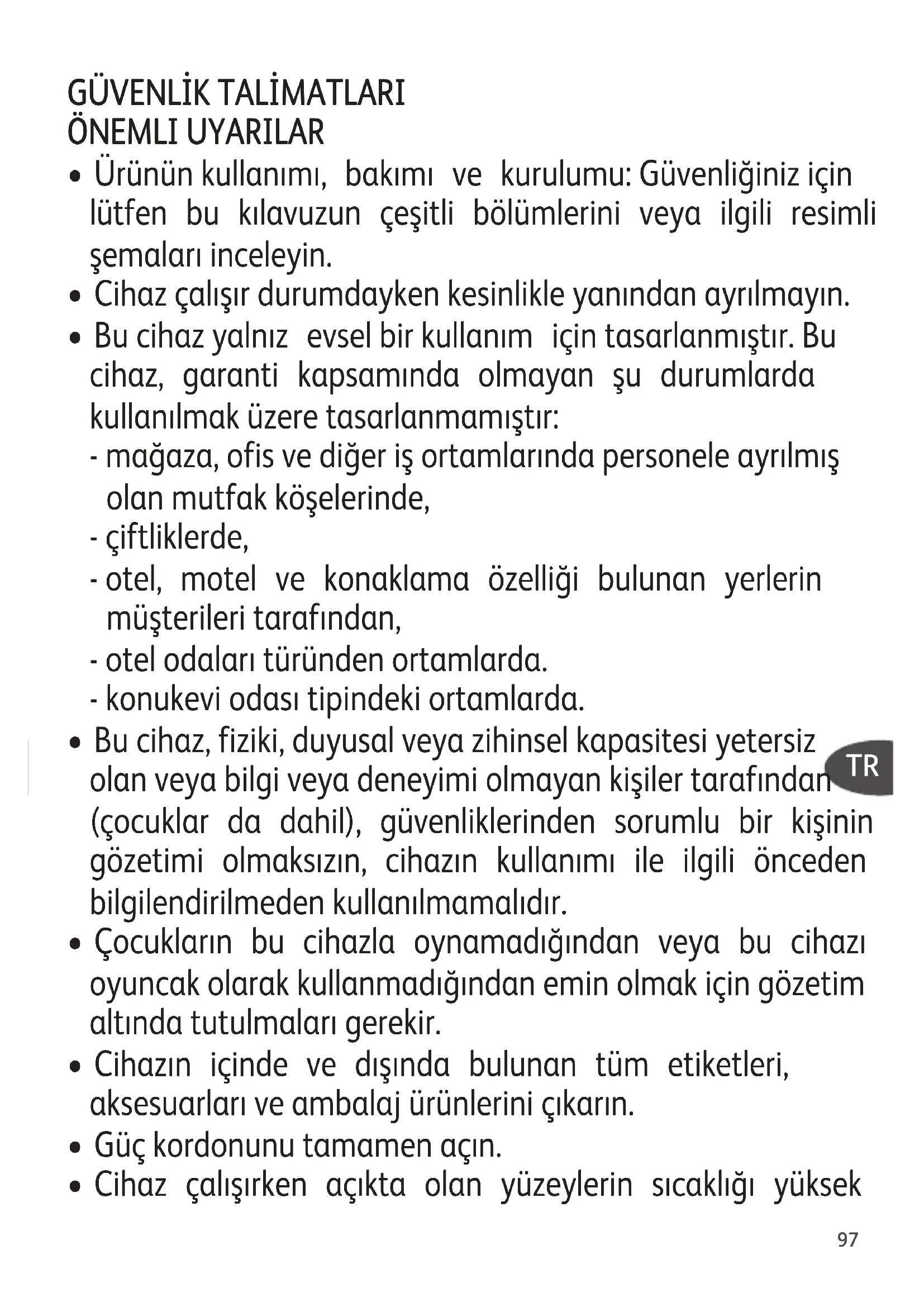 - Bu cihaz 0 ila 8 yaşındaki çocuklar tarafından kullanılamaz. Bu cihaz 8 ve 8 yaşından büyük çocuklar tarafından ancak sürekli gözetim altında tutularak kullanılabilir. Bu cihaz bedensel, duyusal veya zihinsel engelleri olan kişiler veya yeterli bilgi veya deneyimi olmayanlar tarafından, gözetim altında olmaları veya cihazın tam güvenli kullanımına ilişkin denetim veya talimatlar konusunda bilgilendirilmiş ve olası tehlikeleri iyice anlamış olmaları şartıyla kullanılabilir. Cihazı ve kablosunu 8 yaşından küçük çocukların ulaşamayacağı yerlerde saklayın. Cihazın temizliği ve bakımı kullanıcı tarafından çocukların bulunmadığı bir ortamda yapılmalıdır. Sıcak sıvıların dökülmesini önlemek için, pişirme cihazları kulplarıyla (uygun şekilde) sabit bir konuma yerleştirilmelidir.
