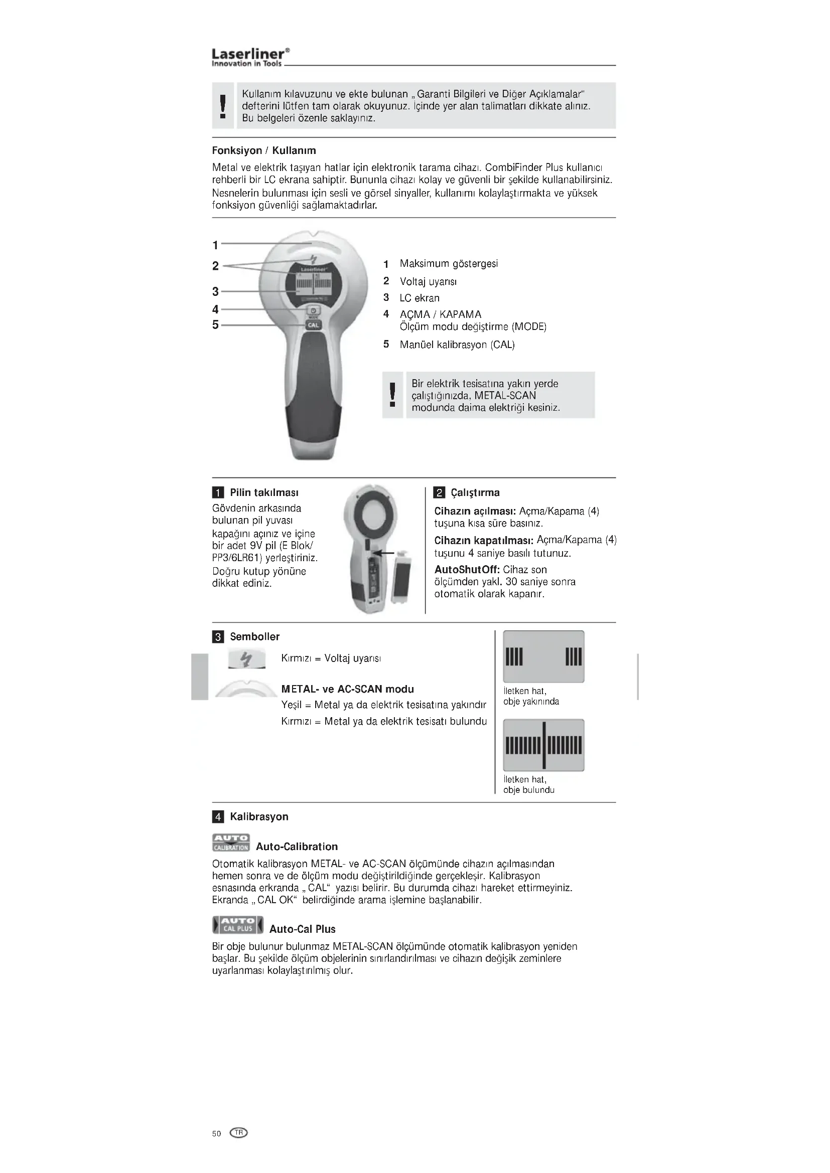 ŭunu 4 saniye basÚlÚ tutunuz. AutoShutOff: Cihaz son ölçümden yakl. 30 saniye sonra otomatik olarak kapanÚr. ÇalČĵtČrma Auto-Calibration Otomatik kalibrasyon METAL- ve AC-SCAN ölçümünde cihazÚn açÚlmasÚndan hemen sonra ve de ölçüm modu deŒiŭtirildiŒinde gerçekleŭir. Kalibrasyon esnasÚnda erkranda „CAL“ yazÚsÚ belirir. Bu durumda cihazÚ hareket ettirmeyiniz. Ekranda „CAL OK“ belirdiŒinde arama iŭlemine baŭlanabilir. Auto-Cal Plus Bir obje bulunur bulunmaz METAL-SCAN ölçümünde otomatik kalibrasyon yeniden baŭlar. Bu ŭekilde ölçüm objelerinin sÚnÚrlandÚrÚlmasÚ ve cihazÚn deŒiŭik zeminlere uyarlanmasÚ kolaylaŭtÚrÚlmÚŭ olur. Kalibrasyon Bir elektrik tesisatÚna yakÚn yerde çalÚŭtÚŒÚnÚzda, METAL-SCAN modunda daima elektriŒi kesiniz.
