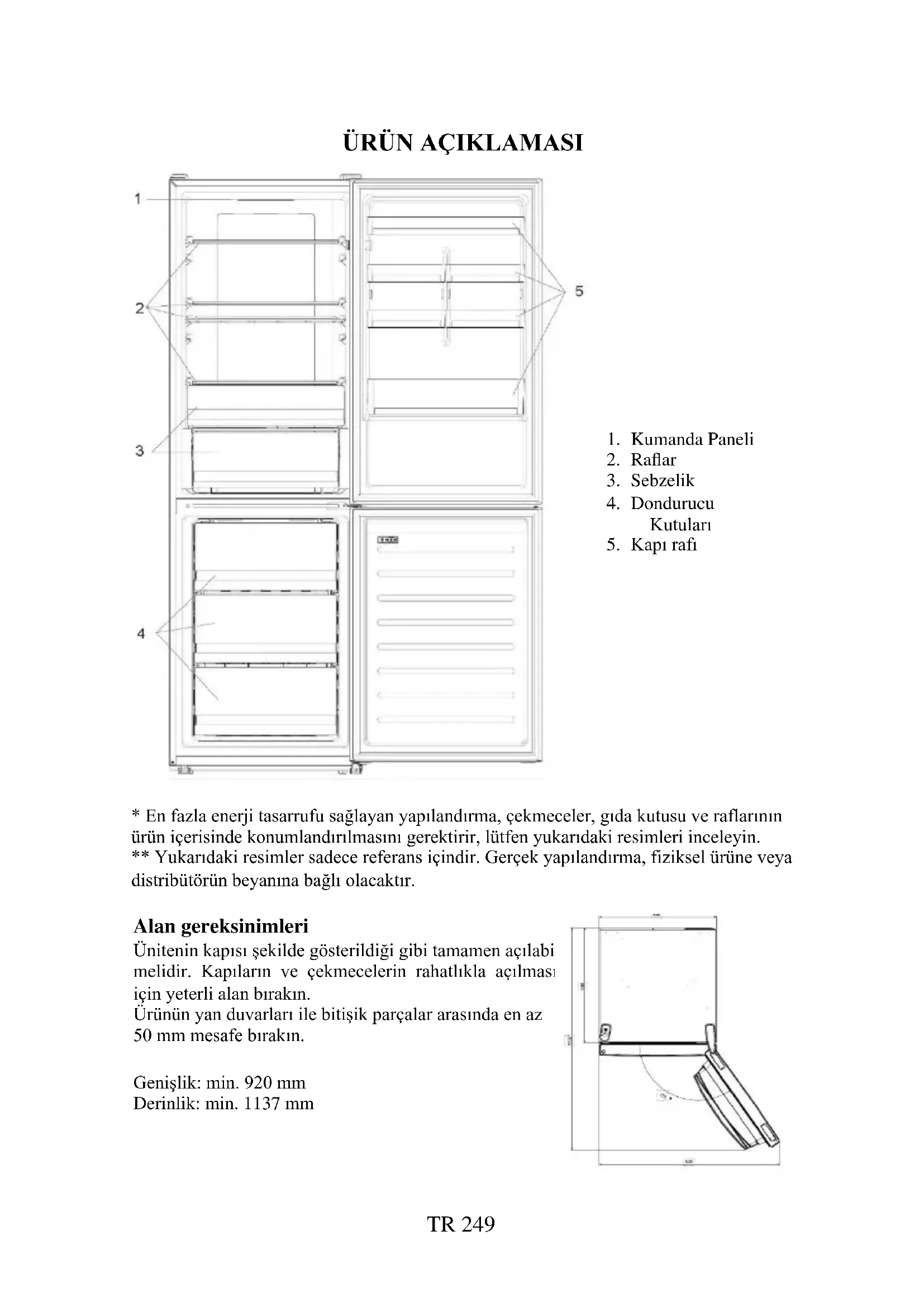 - En fazla enerji tasarrufu sağlayan yapılandırma, çekmeceler, gıda kutusu ve raflarının ürün içerisinde konumlandırılmasını gerektirir, lütfen yukarıdaki resimleri inceleyin. ** Yukarıdaki resimler sadece referans içindir. Gerçek yapılandırma, fiziksel ürüne veya distribütörün beyanına bağlı olacaktır. Alan gereksinimleri Ünitenin kapısı şekilde gösterildiği gibi tamamen açılabil- melidir. Kapıların ve çekmecelerin rahatlıkla açılması için yeterli alan bırakın. Ürünün yan duvarları ile bitişik parçalar arasında en az 50 mm mesafe bırakın. Genişlik: min. 920 mm Derinlik: min. 1137 mm