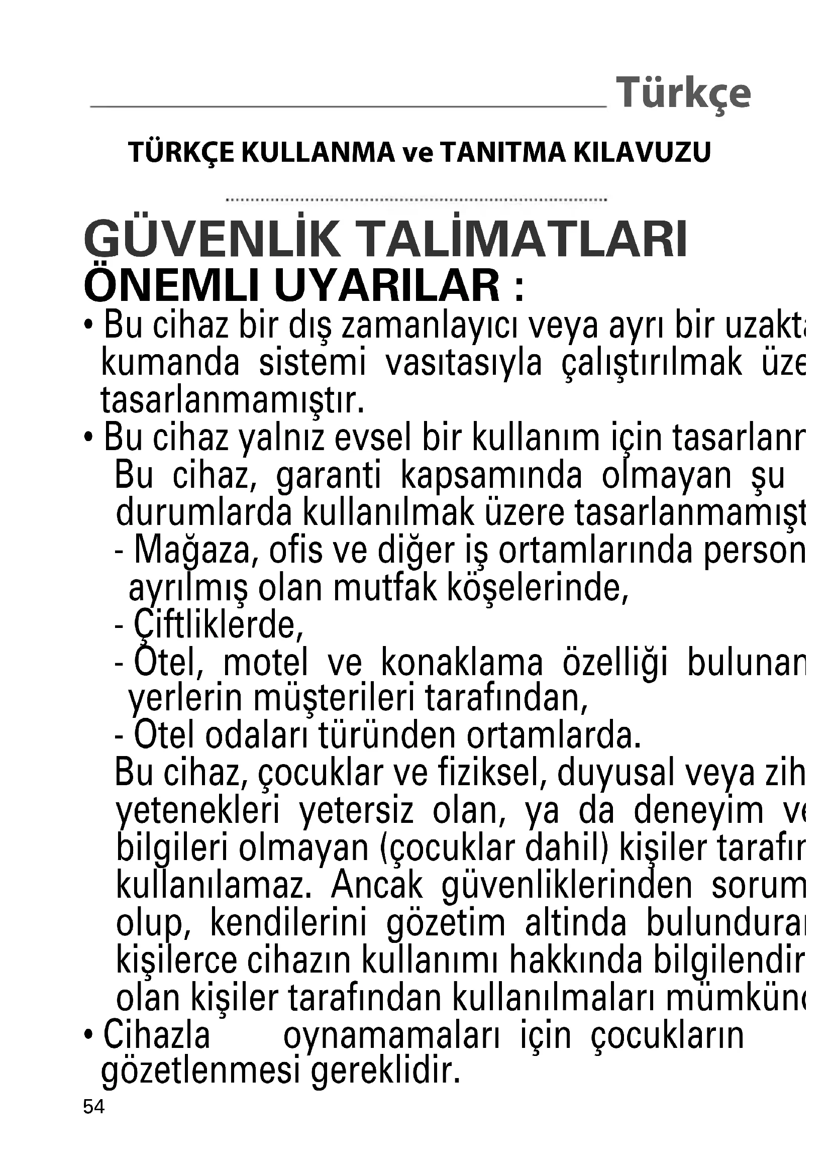 - Bu cihaz yalnız evsel bir kullanım için tasarlanmıştır. Bu cihaz, garanti kapsamında olmayan şu durumlarda kullanılmak üzere tasarlanmamıştır: - Mağaza, ofis ve diğer iş ortamlarında personele ayrılmış olan mutfak köşelerinde, - Çiftliklerde, - Otel, motel ve konaklama özelliği bulunan yerlerin müşterileri tarafından, - Otel odaları türünden ortamlarda. Bu cihaz, çocuklar ve fiziksel, duyusal veya zihinsel yetenekleri yetersiz olan, ya da deneyim ve bilgileri olmayan (çocuklar dahil) kişiler taraf6ndan kullan6lamaz. Ancak güvenliklerinden sorumlu olup, kendilerini gözetim altinda bulunduran kişilerce cihaz6n kullan6m6 hakk6nda bilgilendirilmiş olan kişiler taraf6ndan kullan6lmalar6 mümkündür.