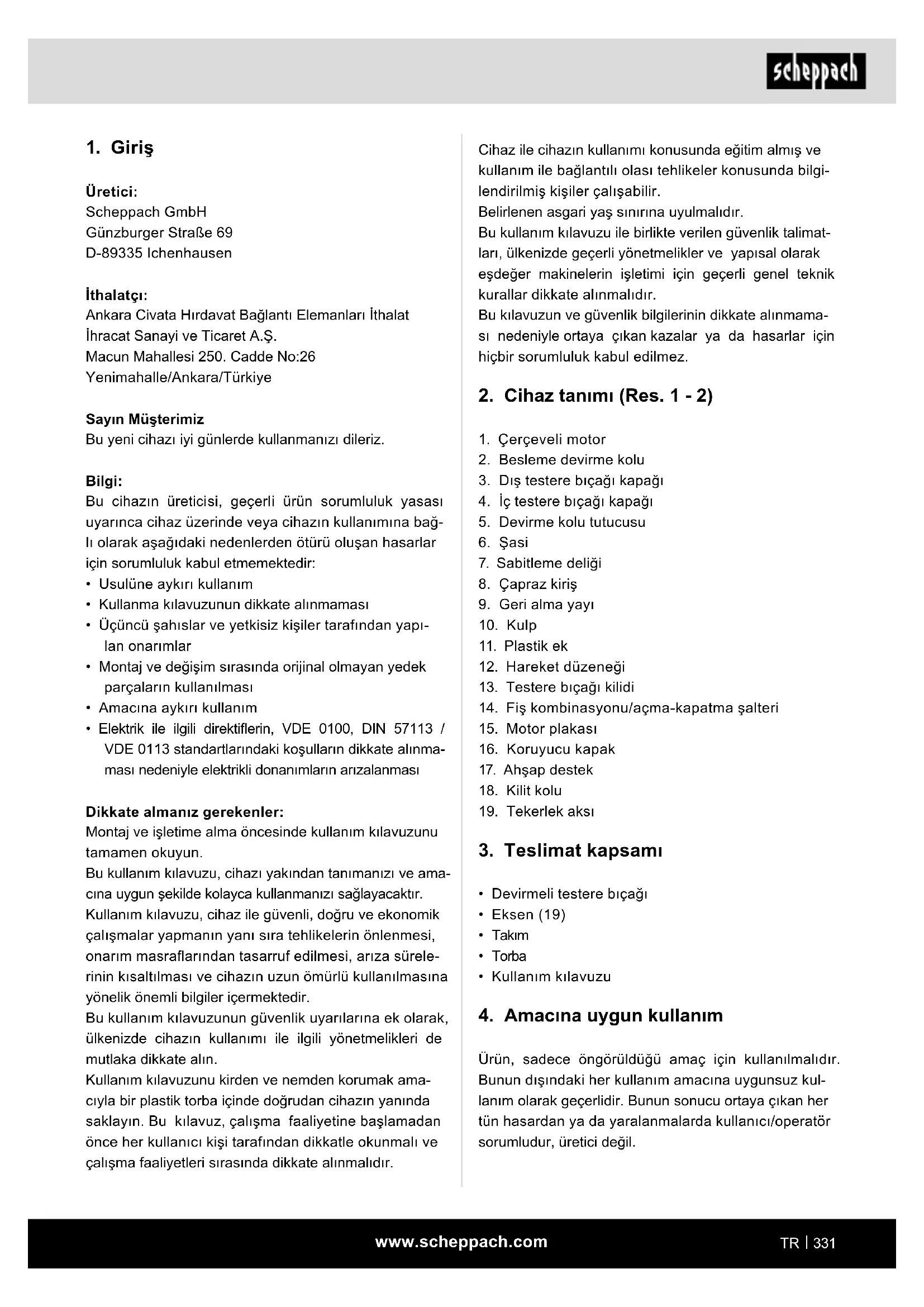 - Elektrik ile ilgili direktierin, VDE 0100, DIN 57113 / VDE 0113 standartlarındaki koşulların dikkate alınma- ması nedeniyle elektrikli donanımların arızalanması Dikkate almanız gerekenler: Montaj ve işletime alma öncesinde kullanım kılavuzunu tamamen okuyun. Bu kullanım kılavuzu, cihazı yakından tanımanızı ve ama- cına uygun şekilde kolayca kullanmanızı sağlayacaktır. Kullanım kılavuzu, cihaz ile güvenli, doğru ve ekonomik çalışmalar yapmanın yanı sıra tehlikelerin önlenmesi, onarım masraarından tasarruf edilmesi, arıza sürele- rinin kısaltılması ve cihazın uzun ömürlü kullanılmasına yönelik önemli bilgiler içermektedir. Bu kullanım kılavuzunun güvenlik uyarılarına ek olarak, ülkenizde cihazın kullanımı ile ilgili yönetmelikleri de mutlaka dikkate alın. Kullanım kılavuzunu kirden ve nemden korumak ama- cıyla bir plastik torba içinde doğrudan cihazın yanında saklayın. Bu kılavuz, çalışma faaliyetine başlamadan önce her kullanıcı kişi tarafından dikkatle okunmalı ve çalışma faaliyetleri sırasında dikkate alınmalıdır.www.scheppach.com