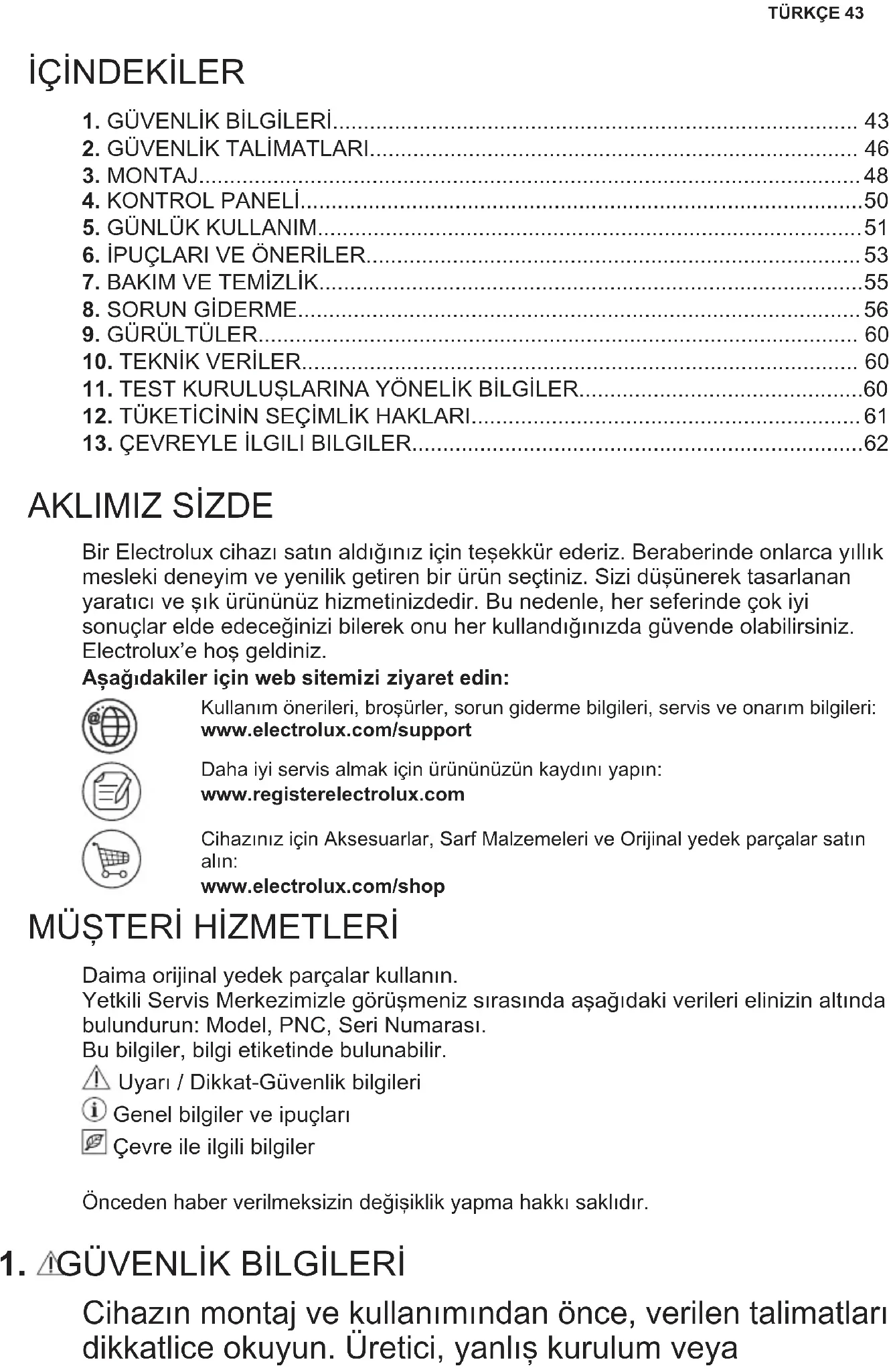 Bir Electrolux cihazı satın aldığınız için teşekkür ederiz. Beraberinde onlarca yıllık mesleki deneyim ve yenilik getiren bir ürün seçtiniz. Sizi düşünerek tasarlanan yaratıcı ve şık ürününüz hizmetinizdedir. Bu nedenle, her seferinde çok iyi sonuçlar elde edeceğinizi bilerek onu her kullandığınızda güvende olabilirsiniz. Electrolux’e hoş geldiniz. Aşağıdakiler için web sitemizi ziyaret edin: Kullanım önerileri, broşürler, sorun giderme bilgileri, servis ve onarım bilgileri: www.electrolux.com/support Daha iyi servis almak için ürününüzün kaydını yapın: www.registerelectrolux.com Cihazınız için Aksesuarlar, Sarf Malzemeleri ve Orijinal yedek parçalar satın alın: www.electrolux.com/shop