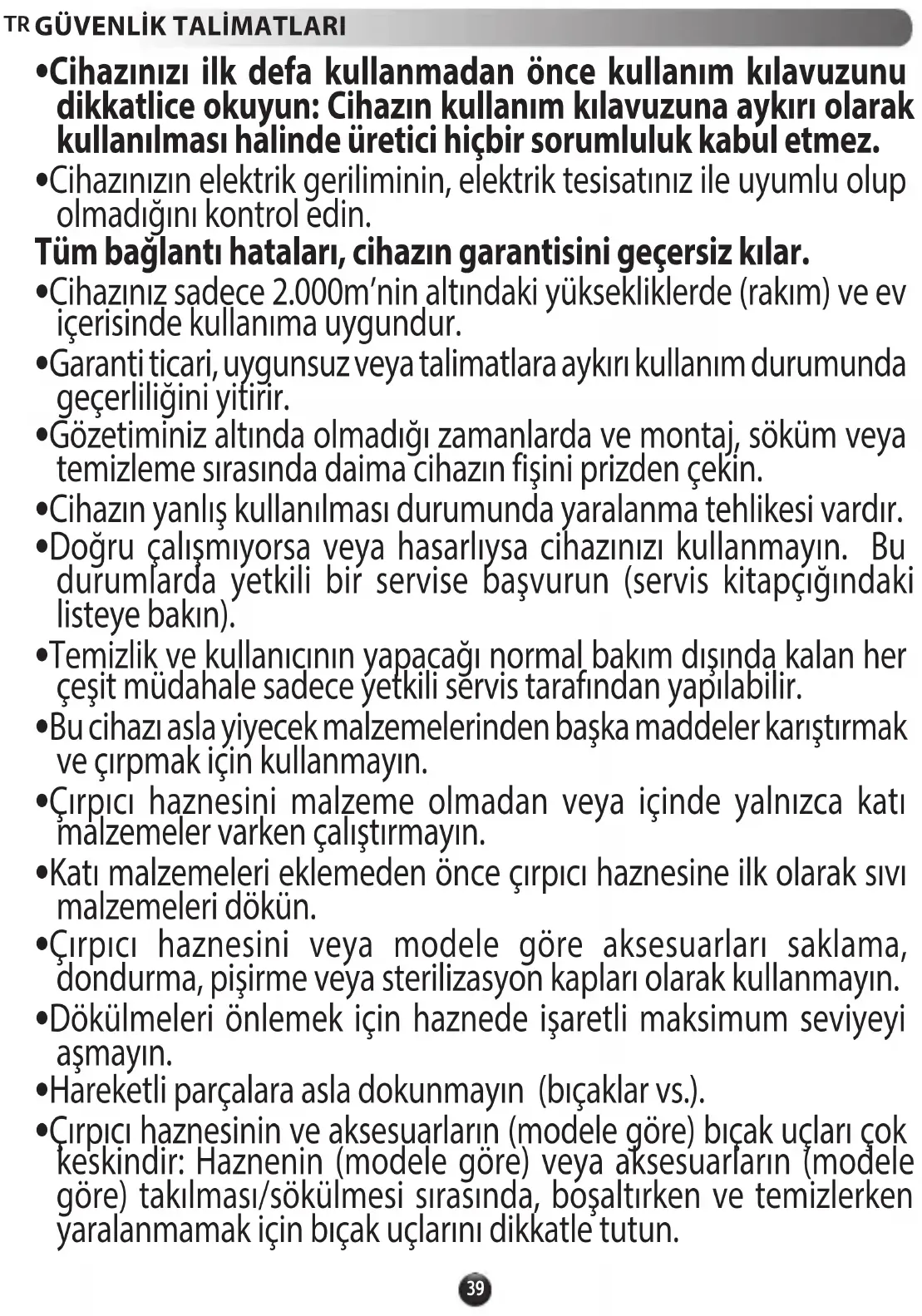 - Cihazın çalışması sırasında parmaklarınızı veya cihazın kullanımı için işlevsel olmayan nesneleri çırpıcı haznesine koymayın.