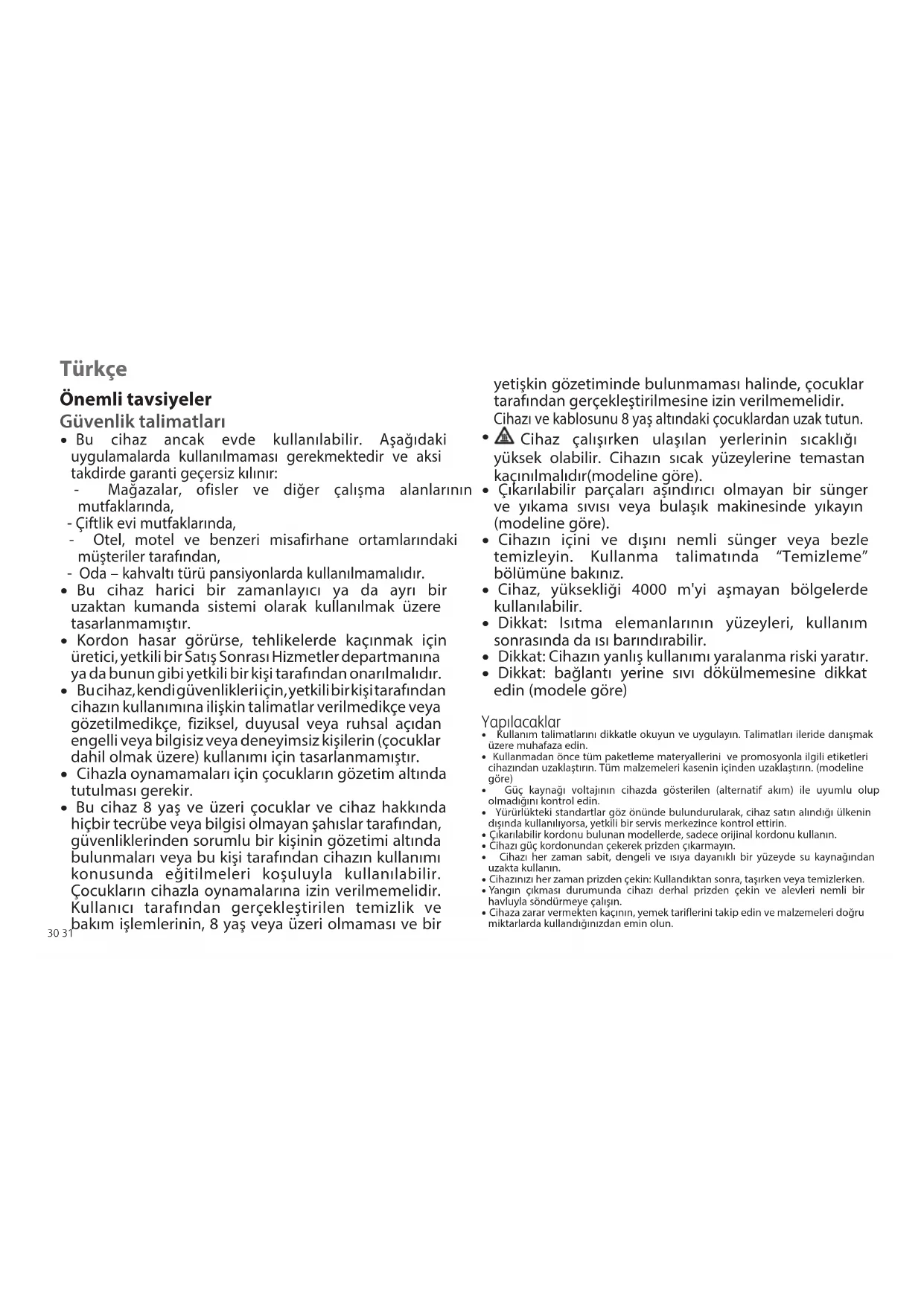 - Bu cihaz 8 yaş ve üzeri çocuklar ve cihaz hakkında hiçbir tecrübe veya bilgisi olmayan şahıslar tarafından, güvenliklerinden sorumlu bir kişinin gözetimi altında bulunmaları veya bu kişi tarafından cihazın kullanımı konusunda eğitilmeleri koşuluyla kullanılabilir. Çocukların cihazla oynamalarına izin verilmemelidir. Kullanıcı tarafından gerçekleştirilen temizlik ve bakım işlemlerinin, 8 yaş veya üzeri olmaması ve bir Türkçe yetişkin gözetiminde bulunmaması halinde, çocuklar tarafından gerçekleştirilmesine izin verilmemelidir. Cihazı ve kablosunu 8 yaş altındaki çocuklardan uzak tutun.
