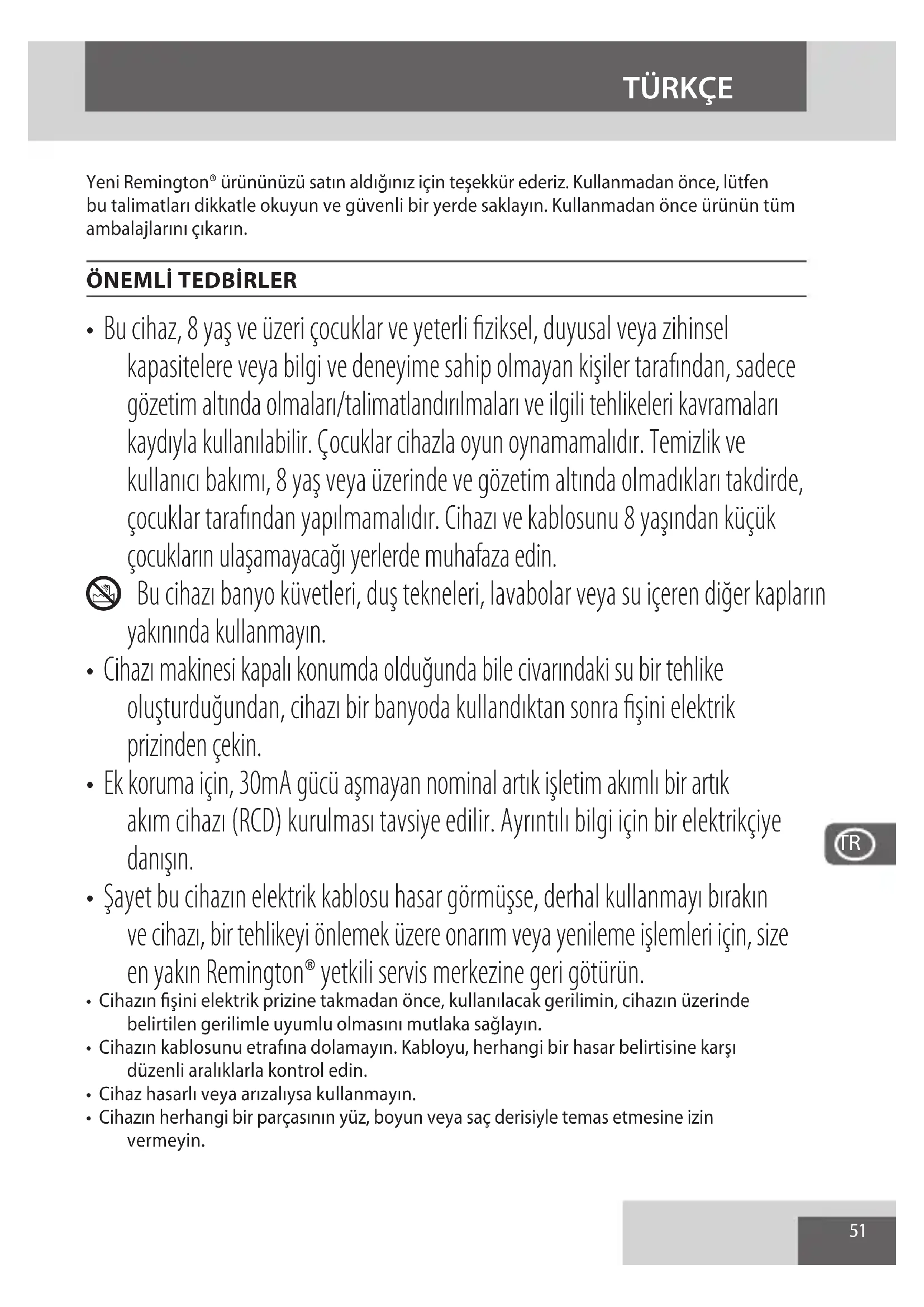 - Şayet bu cihazın elektrik kablosu hasar görmüşse, derhal kullanmayı bırakın ve cihazı, bir tehlikeyi önlemek üzere onarım veya yenileme işlemleri için, size en yakın Remington® yetkili servis merkezine geri götürün.