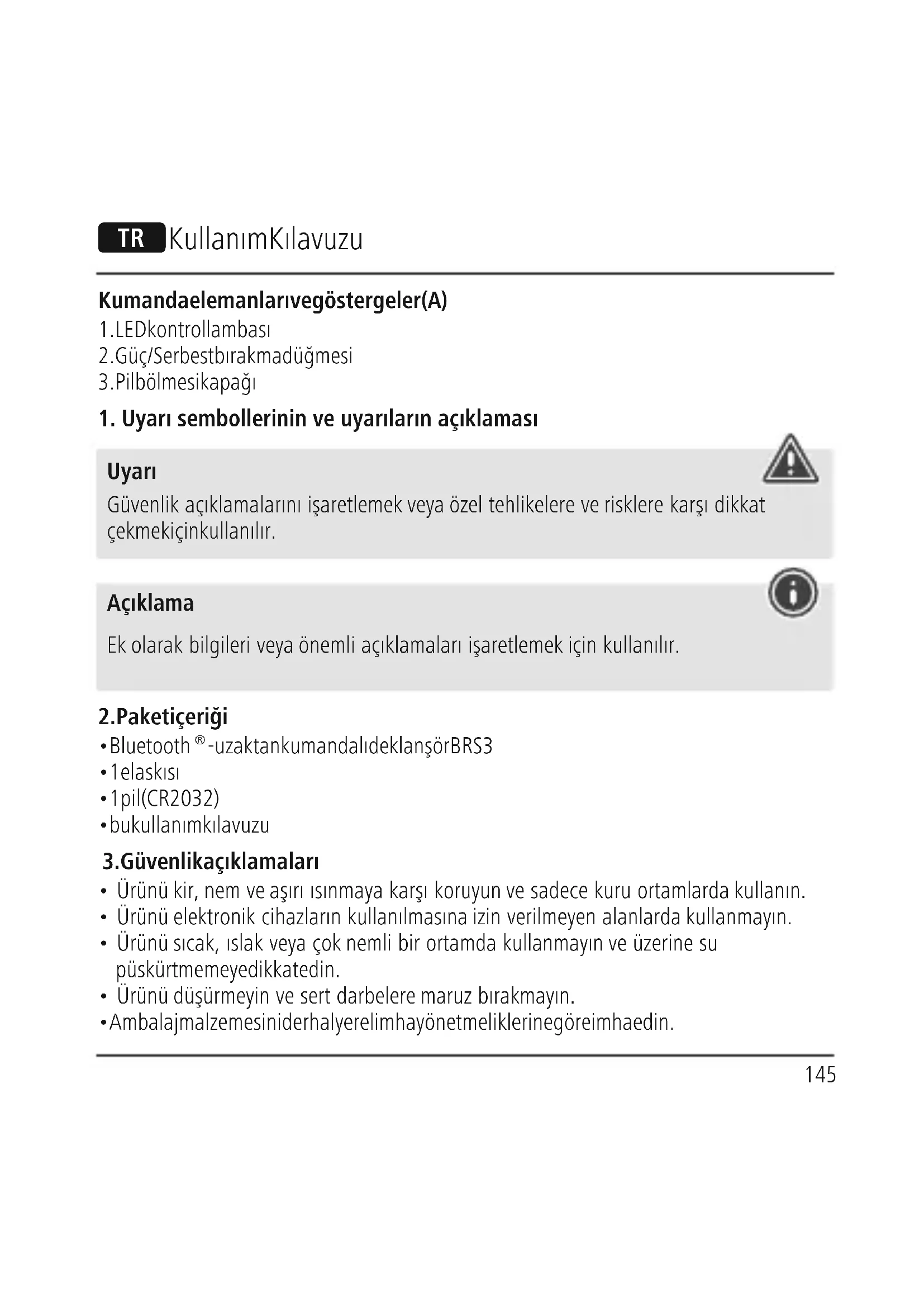 - Ürünü açmayın ve hasar görmesi durumunda çalıştırmaya devam etmeyin.147 Uyarı - Piller / Düğme piller