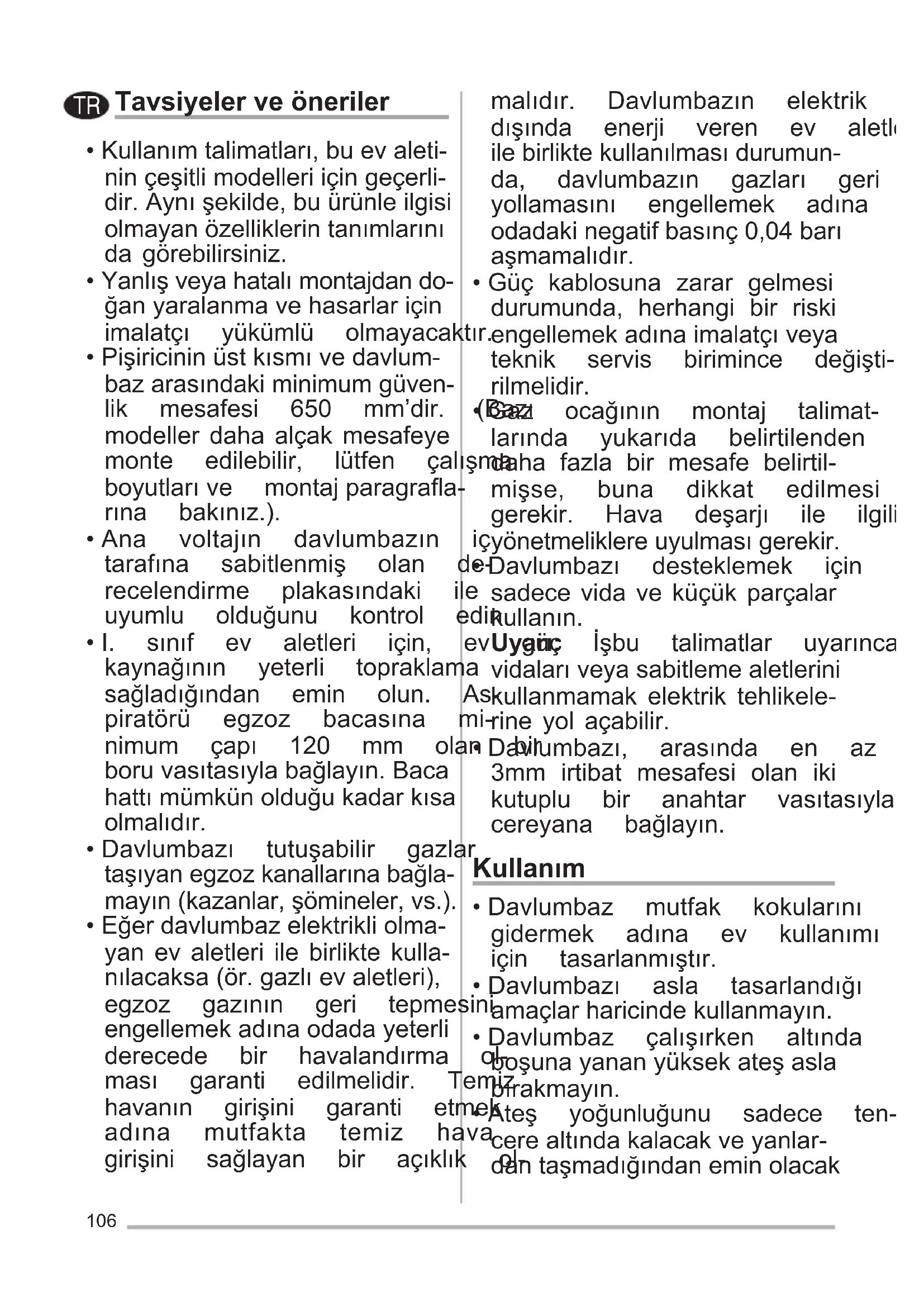 - Eğerdavlumbazelektrikliolma- yan ev aletleri ile birlikte kulla- nılacaksa(ör.gazlıevaletleri), egzoz gazının geri tepmesini engellemekadınaodadayeterli derecede bir havalandırma ol- ması garanti edilmelidir. Temiz havanın girişini garanti etmek adına mutfakta temiz hava girişini sağlayan bir açıklık ol- malıdır. Davlumbazın elektrik dışında enerji veren ev aletleri ilebirliktekullanılmasıdurumun- da, davlumbazın gazları geri yollamasını engellemek adına odadakinegatifbasınç0,04barı aşmamalıdır.