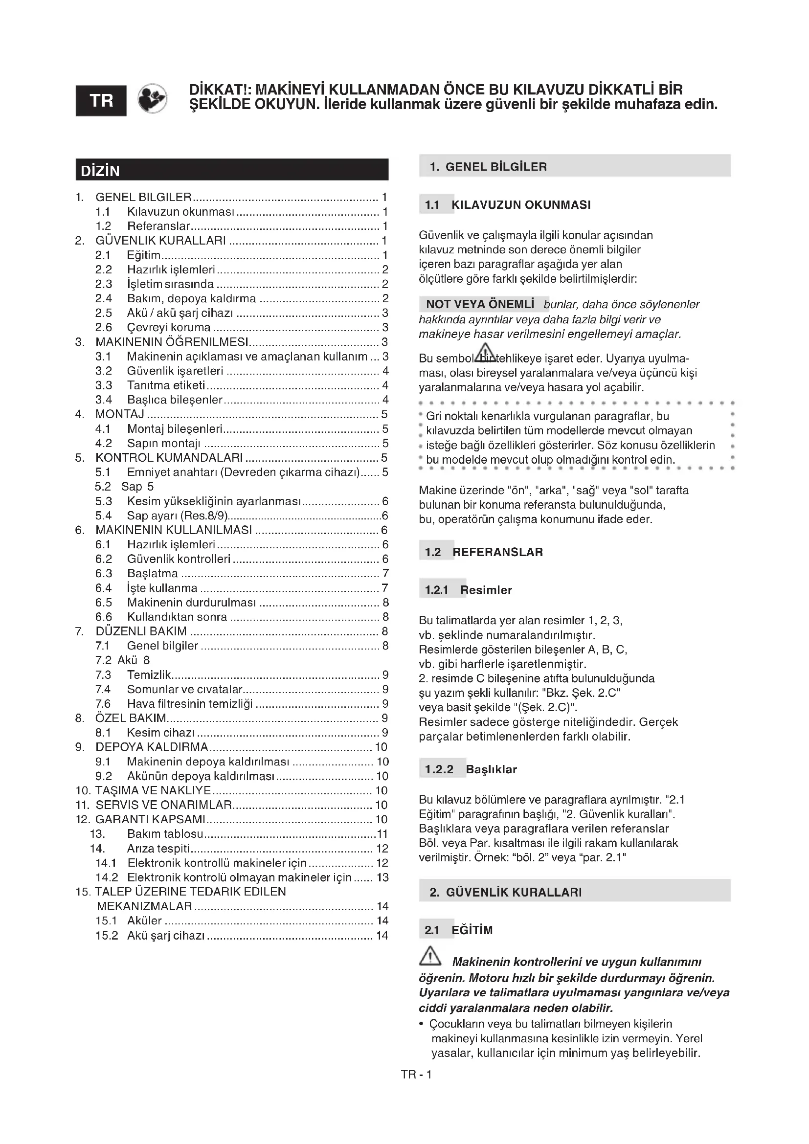 - Makineyi asla parçaları aşınmış veya hasar görmüş haldeyken kullanmayın. Arızalı veya aşınmış parçalar daima değiştirilmeli, kesinlikle onarılmamalıdır.TR - 3