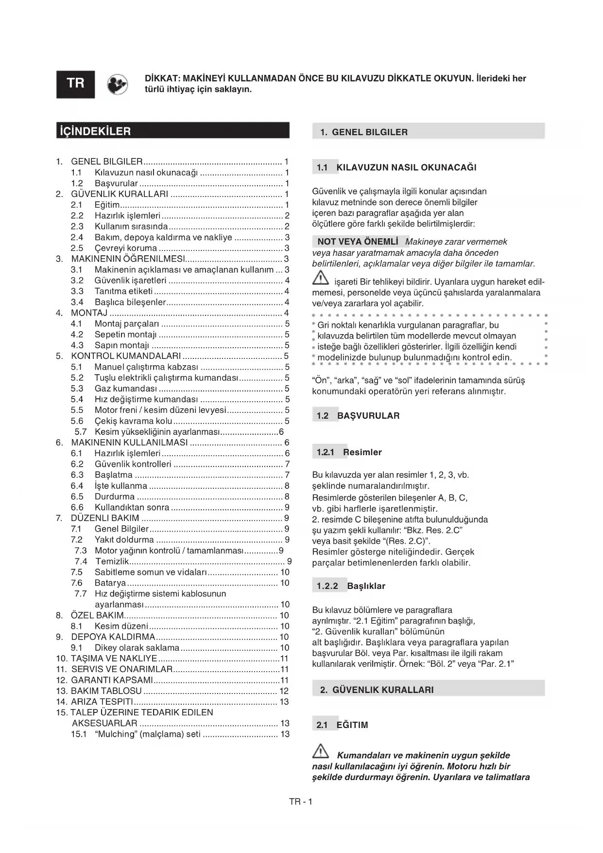 Kötü bilenmiş bir kesim düzeni çimi koparır ve çayırın sararmasına neden olur. Anahtarı çıkarmadan ve kesim düzeni tamamen durmadan kesim düzenine dokunmayın. Kesim düzenleri ile ilgili tüm işlemler (sökme, bileme, balans, onarım, tekrar monte etme ve/ veya değiştirme) güvenlik nedeniyle özel aletlerin kullanımının yanı sıra özel uzmanlık gerektiren önemli işlerdir, bu yüzden her zaman Uzman Servis tarafından gerçekleştirilmeleri gerekir. Dengesini korumak için hasar görmüş, bükülmüş veya aşınmış kesim düzenini kendi vidalarıyla birlikte daima bütün halde değiştirin.TR - 11 ÖNEMLİ Daima "Teknik Bilgiler" tablosunda verilen kodu taşıyan orijinal kesim düzenlerini kullanın. Ürün sürekli geliştirildiğinden, "Teknik Bilgiler" tablosunda belirtilen kesim düzenlerinin yerine zaman içinde birbirleriyle değiştirilebilme ve çalışma güvenliği özelliklerine sahip başka kesim düzenleri konulabilir.