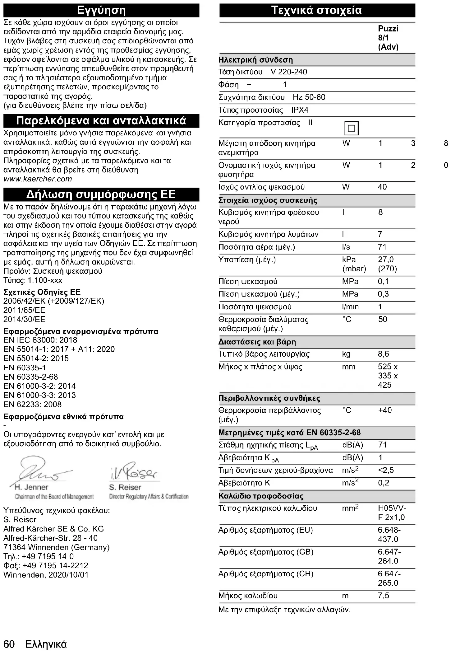 Aşağıda imzası olan, yönetim kurulu adına ve yönetim yetkisine sahip olarak hareket eder. Dokümantasyon yetkilisi: S. Reiser Alfred Kärcher SE & Co. KG Alfred-Kärcher-Str. 28 - 40 71364 Winnenden (Almanya) Tel.: +49 7195 14-0 Faks: +49 7195 14-2212 Winnenden, 2020/10/01Русский 65 Teknik bilgiler Teknik d eğişiklik hakkı saklıdır.