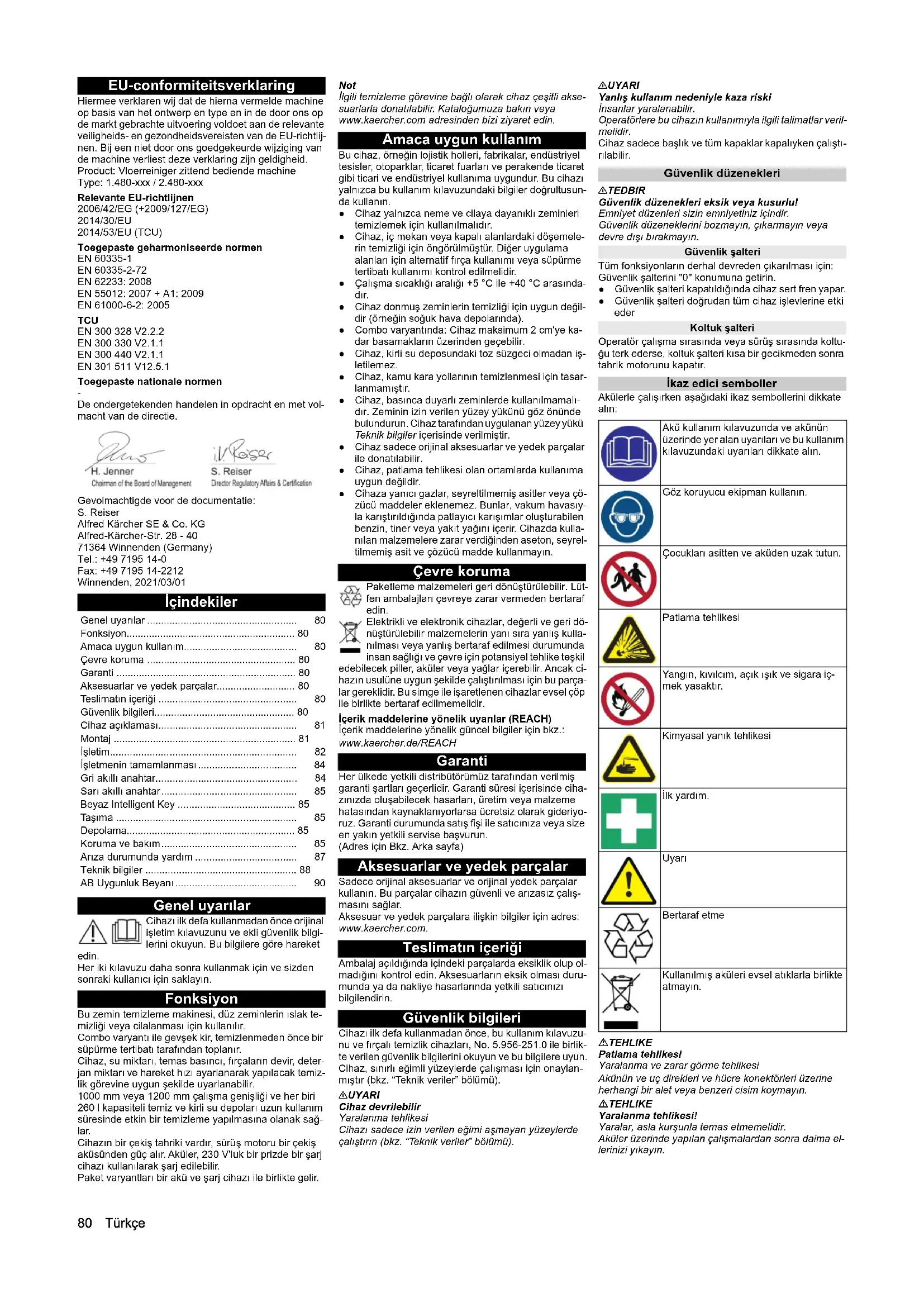 De ondergetekenden handelen in opdracht en met vol- macht van de directie. Gevolmachtigde voor de documentatie: S. Reiser Alfred Kärcher SE & Co. KG Alfred-Kärcher-Str. 28 - 40 71364 Winnenden (Germany) Tel.: +49 7195 14-0 Fax: +49 7195 14-2212 Winnenden, 2021/03/01 İçindekiler Genel uyarılar Cihazı ilk defa kullanmadan önce orijinal işletim kılavuzunu ve ekli güvenlik bilgi- lerini okuyun. Bu bilgilere göre hareket edin. Her iki kılavuzu daha sonra kullanmak için ve sizden sonraki kullanıcı için saklayın. Fonksiyon Bu zemin temizleme makinesi, düz zeminlerin ıslak te- mizliği veya cilalanması için kullanılır. Combo varyantı ile gevşek kir, temizlenmeden önce bir süpürme tertibatı tarafından toplanır. Cihaz, su miktarı, temas basıncı, fırçaların devir, deter- jan miktarı ve hareket hızı ayarlanarak yapılacak temiz- lik görevine uygun şekilde uyarlanabilir. 1000 mm veya 1200 mm çalışma genişliği ve her biri 260 l kapasiteli temiz ve kirli su depoları uzun kullanım süresinde etkin bir temizleme yapılmasına olanak sağ- lar. Cihazın bir çekiş tahriki vardır, sürüş motoru bir çekiş aküsünden güç alır. Aküler, 230 V'luk bir prizde bir şarj cihazı kullanılarak şarj edilebilir. Paket varyantları bir akü ve şarj cihazı ile birlikte gelir. Not İlgili temizleme görevine bağlı olarak cihaz çeşitli akse- suarlarla donatılabilir. Kataloğumuza bakın veya www.kaercher.com adresinden bizi ziyaret edin. Amaca uygun kullanım Bu cihaz, örneğin lojistik holleri, fabrikalar, endüstriyel tesisler, otoparklar, ticaret fuarları ve perakende ticaret gibi ticari ve endüstriyel kullanıma uygundur. Bu cihazı yalnızca bu kullanım kılavuzundaki bilgiler doğrultusun- da kullanın. ● Cihaz yalnızca neme ve cilaya dayanıklı zeminleri temizlemek için kullanılmalıdır. ● Cihaz, iç mekan veya kapalı alanlardaki döşemele- rin temizliği için öngörülmüştür. Diğer uygulama alanları için alternatif fırça kullanımı veya süpürme tertibatı kullanımı kontrol edilmelidir. ● Çalışma sıcaklığı aralığı +5 °C ile +40 °C arasında- dır. ● Cihaz donmuş zeminlerin temizliği için uygun değil- dir (örneğin soğuk hava depoları nda). ● Combo varyantında: Cihaz maksimum 2 cm'ye ka- dar basamakların üzerinden geçebilir. ● Cihaz, kirli su deposundaki toz süzgeci olmadan iş- letilemez. ● Cihaz, kamu kara yollarının temizlenmesi için tasar- lanmamıştır. ● Cihaz, basınca duyarlı zeminlerde kullanılmamalı- dır. Zeminin izin verilen yüzey yükünü göz önünde bulundurun. Cihaz tarafından uygulanan yüzey yükü Teknik bilgiler içerisinde verilmiştir. ● Cihaz sadece orijinal aksesuarlar ve yedek parçalar ile donatılabilir. ● Cihaz, patlama tehlikesi olan ortamlarda kullanıma uygun değildir. ● Cihaza yanıcı gazlar, seyreltilmemiş asitler veya çö- zücü maddeler eklenemez. Bunlar, vakum havasıy- la karıştırıldığında patlayıcı karışımlar oluşturabilen benzin, tiner veya yakıt yağını içerir. Cihazda kulla-