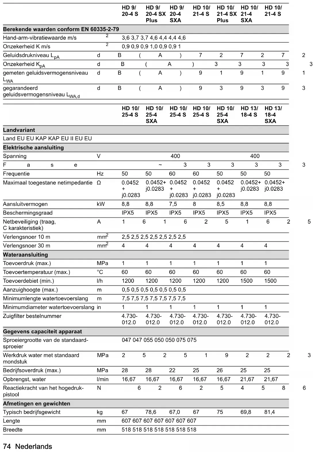 Werkdruk water met standaard mondstuk MPa25251922231818 Bedrijfsoverdruk (max.) MPa 28 28 22 25 26 25 25 Opbrengst, water l/min 16,67 16,67 16,67 16,67 16,67 21,67 21,67 Reactiekracht van het hogedruk- pistool N 62625458606868 Afmetingen en gewichten Typisch bedrijfsgewicht kg 67 78,6 67,0 67 75 69,8 81,4 Lengte mm 607 607 607 607 607 607 607 Breedte mm 518 518 518 518 518 518 518Türkçe 75 Uitzondering volgens verordening (EU) 2019/1781 bijla- ge I punt 2 (12): j) Technische wijzigingen voorbehouden. İçindekiler Genel uyarılar Cihazı ilk defa kullanmadan önce orijinal işletim kılavuzunu ve ekli güvenlik bilgi- lerini okuyun. Bu bilgilere göre hareket edin. Her iki kılavuzu daha sonra kullanmak için ve sizden sonraki kullanıcı için saklayın. Amaca uygun kullanım Bu yüksek basınç temizleyicisini sadece aşağıdaki ça- lışmalar için kullanın: ● Yüksek basınç huzmesi ile temizleme maddesi ol- madan temizlik (ör. ön cepheler, teraslar, bahçe alet- leri) ● Aksesuar olarak temin edilebilen köpük püskürtücü ile (örneğin makineler, araçlar, yapılar, aletler için) düşük basınçlı jet ve temizlik maddesi ile temizlik Sert kirlenmeler için özel donanım olarak bir rotor me- mesi öneriyoruz. HD...Plus varyasyonunda rotor memesi teslimat kapsa- mındadır. Cihaz Servo Kontrol aksesuarları ile çalıştırılabilir. Su beslemesi için sınır değerler DIKKAT Kirlenmiş su Erken aşınma veya cihaz içinde tortulaşmalar Cihazı sadece temiz suyla veya sınır değerleri aşmayan geri dönüşüm suyuyla besleyin. Su beslemesi için aşağıdaki sınır değerler geçerlidir: ● pH değeri: 6,5-9,5 ● Elektriksel iletkenlik: Temiz suyun iletkenliği + 1200 µS/cm, maksimum iletkenlik 2000 µS/cm ● Çökeltilebilir maddeler (numune hacmi 1 l, çökelme süresi 30 dakika): < 0,5 mg/l ● Filtrelenebilir maddeler: < 50 mg/l, aşındırıcı madde değil ● Hidrokarbonlar: < 20 mg/l ● Klorür: < 300 mg/l ● Sülfat: < 240 mg/l ● Kalsiyum: < 200 mg/l ● Toplam sertlik: < 28 °dH, < 50° TH, < 500 ppm (mg CaCO