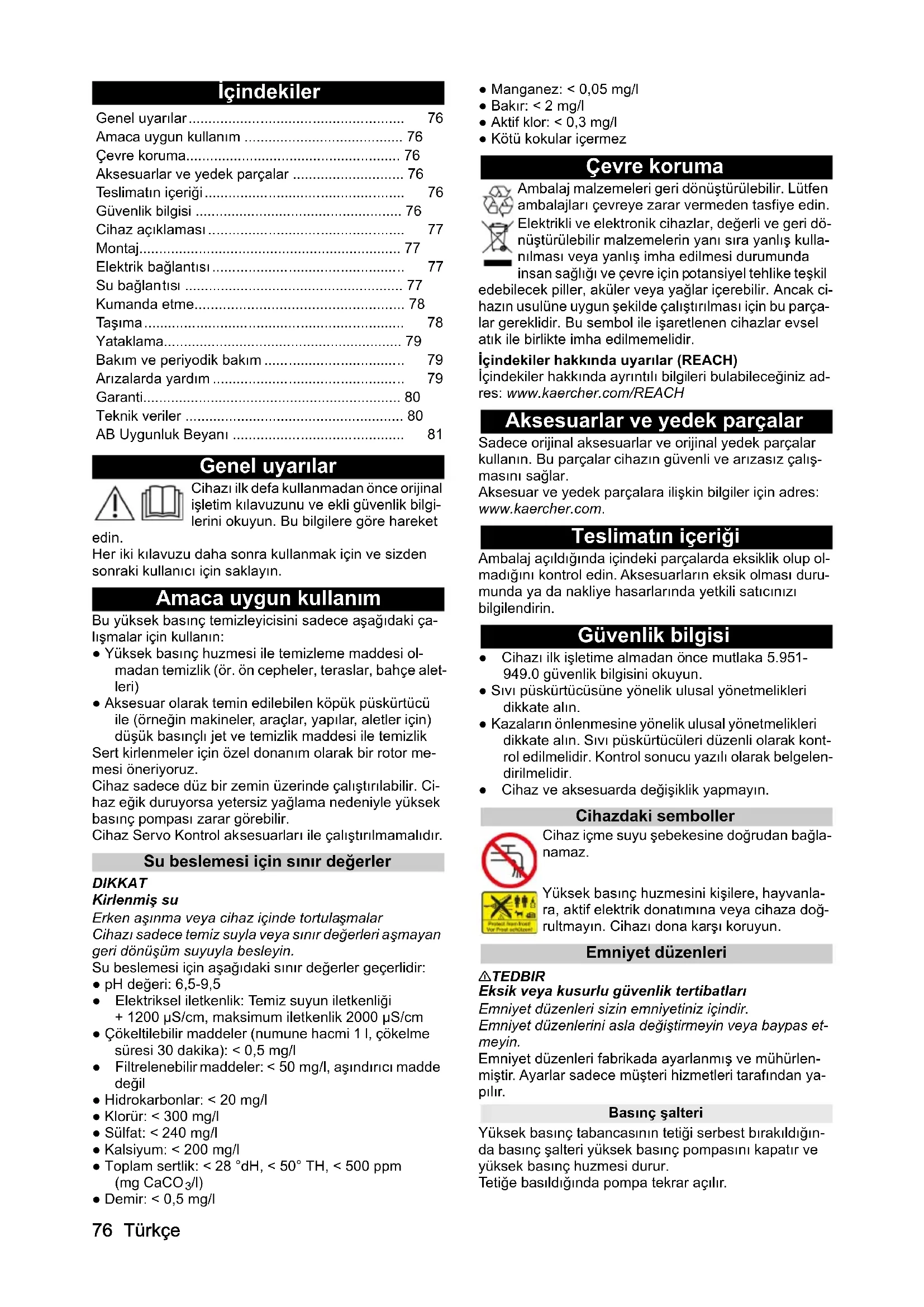 /l) ● Demir: < 0,5 mg/l ● Manganez: < 0,05 mg/l ● Bakır: < 2 mg/l ● Aktif klor: < 0,3 mg/l ● Kötü kokular içermez Çevre koruma Ambalaj malzemeleri geri dönüştürülebilir. Lütfen ambalajları çevreye zarar vermeden tasfiye edin. Elektrikli ve elektronik cihazlar, değerli ve geri dö- nüştürülebilir malzemelerin yanı sıra yanlış kulla- nılması veya yanlış imha edilmesi durumunda insan sağlığı ve çevre için potansiyel tehlike teşkil edebilecek piller, aküler veya yağlar içerebilir. Ancak ci- hazın usulüne uygun şekilde çalıştırılması için bu parça- lar gereklidir. Bu sembol ile işaretlenen cihazlar evsel atık ile birlikte imha edilmemelidir. İçindekiler hakkında uyarılar (REACH) İçindekiler hakkında ayrıntılı bilgileri bulabileceğiniz ad- res: www.kaercher.com/REACH Aksesuarlar ve yedek parçalar Sadece orijinal aksesuarlar ve orijinal yedek parçalar kullanın. Bu parçalar cihazın güvenli ve arızasız çalış- masını sağlar. Aksesuar ve yedek parçalara ilişkin bilgiler için adres: www.kaercher.com. Teslimatın içeriği Ambalaj açıldığında içindeki parçalarda eksiklik olup ol- madığını kontrol edin. Aksesuarların eksik olması duru- munda ya da nakliye hasarlarında yetkili satıcınızı bilgilendirin. Güvenlik bilgisi ● Cihazı ilk işletime almadan önce mutlaka 5.951-