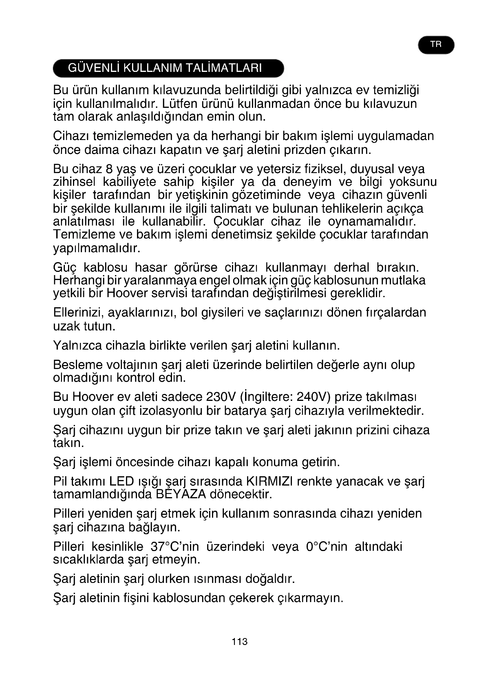 Bu ürün kullanım kılavuzunda belirtildiği gibi yalnızca ev temizliği için kullanılmalıdır. Lütfen ürünü kullanmadan önce bu kılavuzun tam olarak anlaşıldığından emin olun. Cihazı temizlemeden ya da herhangi bir bakım işlemi uygulamadan önce daima cihazı kapatın ve şarj aletini prizden çıkarın. Bu cihaz 8 yaş ve üzeri çocuklar ve yetersiz fiziksel, duyusal veya zihinsel kabiliyete sahip kişiler ya da deneyim ve bilgi yoksunu kişiler tarafından bir yetişkinin gözetiminde veya cihazın güvenli bir şekilde kullanımı ile ilgili talimatı ve bulunan tehlikelerin açıkça anlatılması ile kullanabilir. Çocuklar cihaz ile oynamamalıdır. Temizleme ve bakım işlemi denetimsiz şekilde çocuklar tarafından yapılmamalıdır. Güç kablosu hasar görürse cihazı kullanmayı derhal bırakın. Herhangi bir yaralanmaya engel olmak için güç kablosunun mutlaka yetkili bir Hoover servisi tarafından değiştirilmesi gereklidir. Ellerinizi, ayaklarınızı, bol giysileri ve saçlarınızı dönen fırçalardan uzak tutun. Yalnızca cihazla birlikte verilen şarj aletini kullanın. Besleme voltajının şarj aleti üzerinde belirtilen değerle aynı olup olmadığını kontrol edin. Bu Hoover ev aleti sadece 230V (İngiltere: 240V) prize takılması uygun olan çift izolasyonlu bir batarya şarj cihazıyla verilmektedir. Şarj cihazını uygun bir prize takın ve şarj aleti jakının prizini cihaza takın. Şarj işlemi öncesinde cihazı kapalı konuma getirin. Pil takımı LED ışığı şarj sırasında KIRMIZI renkte yanacak ve şarj tamamlandığında BEYAZA dönecektir. Pilleri yeniden şarj etmek için kullanım sonrasında cihazı yeniden şarj cihazına bağlayın. Pilleri kesinlikle 37°C’nin üzerindeki veya 0°C’nin altındaki sıcaklıklarda şarj etmeyin. Şarj aletinin şarj olurken ısınması doğaldır. Şarj aletinin fişini kablosundan çekerek çıkarmayın. TR114 Uzun süre evde bulunmayacaksanız (tatil vs. gibi nedenlerle) şarj aletini prizden çekin. Uzun süre kullanılmayan elektrikli süpürgenin şarjı kendi kendine bitebileceğinden, yeniden kullanmadan önce süpürgeyi iyice şarj edin. Cihaz atılacağı zaman, öncelikle piller çıkartılmalıdır. Pil çıkartılırken, cihaz şebeke beslemesinden çıkartılmalıdır. Pilleri güvenli bir şekilde imha edin. Pillerin tamamen boşalması için cihazı durana kadar çalıştırın. Kullanılmış piller bir geri dönüştürme istasyonuna götürülmeli ve evsel atıklarla birlikte atılmamalıdır. Pilleri çıkarmak için, lütfen Hoover Müşteri Merkezi ile temasa geçin veya aşağıdaki talimatlara göre devam edin. ÖNEMLİ: Pilleri çıkarmadan önce daima tamamen boşaltın ve şarj ünitesinin fişten çıkarıldığından emin olun. Süpürgeyi piller tamamen boşalana kadar çalıştırın. Şarj cihazı jak fişini cihazdan çıkarın. Pil takımı serbest bırakma düğmelerine basın ve çıkarmak için kaydırın. Not: Birimin parçalarına ayrılması ile ilgili zorluk yaşarsanız ya da cihazın tamiri, onarımı ya da geri dönüşümü ile ilgili daha ayrıntılı bilgiye ihtiyaç duyarsanız lütfen belediyeniz ya da ev atıkları imha hizmetleri ile görüşün. Yalnızca Hoover tarafından önerilen veya sağlanan aparatları, malzemeleri ve yedek parçaları kullanın. Statik elektrik: bazı halılar statik elektrik oluşuma neden olabilir. Statik elektrik deşarjı sağlığa zararlı değildir. Cihazınızı dış mekanlarda veya ıslak yüzeylerde ya da ıslak toplama için kullanmayın. Sert veya keskin nesneleri, kibritleri, sıcak külleri, sigara izmaritleri veya diğer benzeri öğeleri toplamayın. Yanıcı sıvıları, temizleme sıvılarını, aerosolleri veya spreyleri püskürtmeyin ya da toplamayın. Cihazı kullanırken güç kablosu üzerine basmayın veya güç kablosundan çekerek prizden çıkarmayın. Arıza görünürse cihazı veya şarj aletini kullanmayı bırakın. Hoover teknik servisi: Cihazın uzun süre güvenli ve verimli kullanımını sağlamak için, servis ve bakımlarının yetkili Hoover servisinde yapılmasını tavsiye ederiz. Cihazı hayvanları veya insanları temizlemek için kullanmayın.