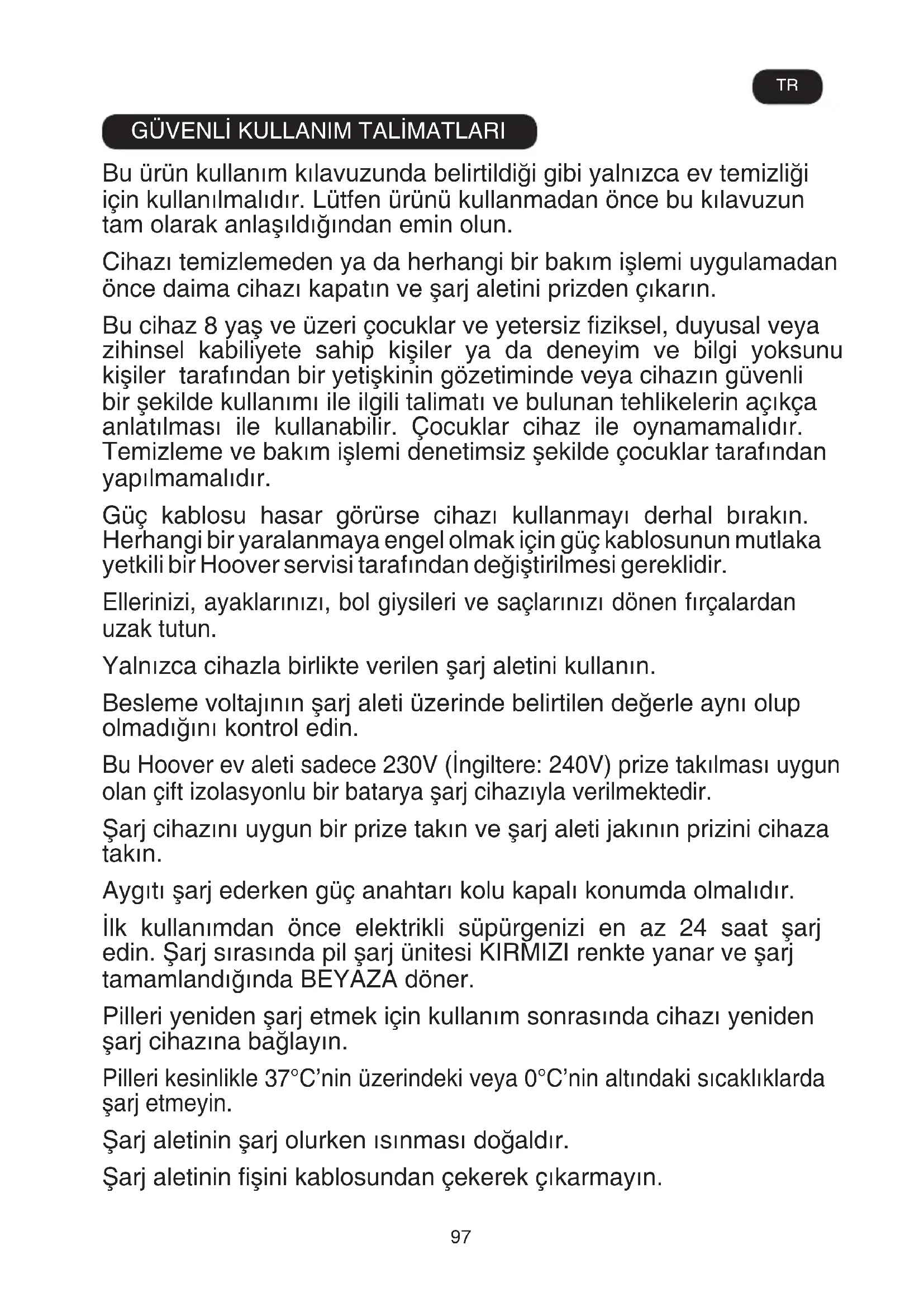 Bu ürün kullanım kılavuzunda belirtildiği gibi yalnızca ev temizliği için kullanılmalıdır. Lütfen ürünü kullanmadan önce bu kılavuzun tam olarak anlaşıldığından emin olun. Cihazı temizlemeden ya da herhangi bir bakım işlemi uygulamadan önce daima cihazı kapatın ve şarj aletini prizden çıkarın. Bu cihaz 8 yaş ve üzeri çocuklar ve yetersiz fiziksel, duyusal veya zihinsel kabiliyete sahip kişiler ya da deneyim ve bilgi yoksunu kişiler tarafından bir yetişkinin gözetiminde veya cihazın güvenli bir şekilde kullanımı ile ilgili talimatı ve bulunan tehlikelerin açıkça anlatılması ile kullanabilir. Çocuklar cihaz ile oynamamalıdır. Temizleme ve bakım işlemi denetimsiz şekilde çocuklar tarafından yapılmamalıdır. Güç kablosu hasar görürse cihazı kullanmayı derhal bırakın. Herhangi bir yaralanmaya engel olmak için güç kablosunun mutlaka yetkili bir Hoover servisi tarafından değiştirilmesi gereklidir. Ellerinizi, ayaklarınızı, bol giysileri ve saçlarınızı dönen fırçalardan uzak tutun. Yalnızca cihazla birlikte verilen şarj aletini kullanın. Besleme voltajının şarj aleti üzerinde belirtilen değerle aynı olup olmadığını kontrol edin. Bu Hoover ev aleti sadece 230V (İngiltere: 240V) prize takılması uygun olan çift izolasyonlu bir batarya şarj cihazıyla verilmektedir. Şarj cihazını uygun bir prize takın ve şarj aleti jakının prizini cihaza takın. Aygıtı şarj ederken güç anahtarı kolu kapalı konumda olmalıdır. İlk kullanımdan önce elektrikli süpürgenizi en az 24 saat şarj edin. Şarj sırasında pil şarj ünitesi KIRMIZI renkte yanar ve şarj tamamlandığında BEYAZA döner. Pilleri yeniden şarj etmek için kullanım sonrasında cihazı yeniden şarj cihazına bağlayın. Pilleri kesinlikle 37°C’nin üzerindeki veya 0°C’nin altındaki sıcaklıklarda şarj etmeyin. Şarj aletinin şarj olurken ısınması doğaldır. Şarj aletinin fişini kablosundan çekerek çıkarmayın. TR98 Uzun süre evde bulunmayacaksanız (tatil vs. gibi nedenlerle) şarj aletini prizden çekin. Uzun süre kullanılmayan elektrikli süpürgenin şarjı kendi kendine bitebileceğinden, yeniden kullanmadan önce süpürgeyi iyice şarj edin. Cihaz atılacağı zaman, öncelikle piller çıkartılmalıdır. Pil çıkartılırken, cihaz şebeke beslemesinden çıkartılmalıdır. Pilleri güvenli bir şekilde imha edin. Pillerin tamamen boşalması için cihazı durana kadar çalıştırın. Kullanılmış piller bir geri dönüştürme istasyonuna götürülmeli ve evsel atıklarla birlikte atılmamalıdır. Pilleri çıkarmak için, lütfen Hoover Müşteri Merkezi ile temasa geçin veya aşağıdaki talimatlara göre devam edin. ÖNEMLİ: Çıkarmadan önce pilleri her zaman tamamen deşarj edin. Süpürgeyi piller tamamen boşalana kadar çalıştırın. Şarj cihazı jak fişini cihazdan çıkarın. Pil takımı serbest bırakma düğmelerine basın ve çıkarmak için kaydırın. [11] NOT: Birimin parçalarına ayrılması ile ilgili zorluk yaşarsanız ya da cihazın tamiri, onarımı ya da geri dönüşümü ile ilgili daha ayrıntılı bilgiye ihtiyaç duyarsanız lütfen belediyeniz ya da ev atıkları imha hizmetleri ile görüşün. Yalnızca Hoover tarafından önerilen veya sağlanan aparatları, malzemeleri ve yedek parçaları kullanın. Statik elektrik: Bazı halılar statik elektrik oluşuma neden olabilir. Statik elektrik deşarjı sağlığa zararlı değildir. Cihazınızı dış mekanlarda veya ıslak yüzeylerde ya da ıslak toplama için kullanmayın. Sert veya keskin nesneleri, kibritleri, sıcak külleri, sigara izmaritleri veya diğer benzeri öğeleri toplamayın. Yanıcı sıvıları, temizleme sıvılarını, aerosolleri veya spreyleri püskürtmeyin ya da toplamayın. Cihazı kullanırken güç kablosu üzerine basmayın veya güç kablosundan çekerek prizden çıkarmayın. Arıza görünürse cihazı veya şarj aletini kullanmayı bırakın. Hoover teknik servisi: Cihazın uzun süre güvenli ve verimli kullanımını sağlamak için, servis ve bakımlarının yetkili Hoover servisinde yapılmasını tavsiye ederiz. Cihazı hayvanları veya insanları temizlemek için kullanmayın.
