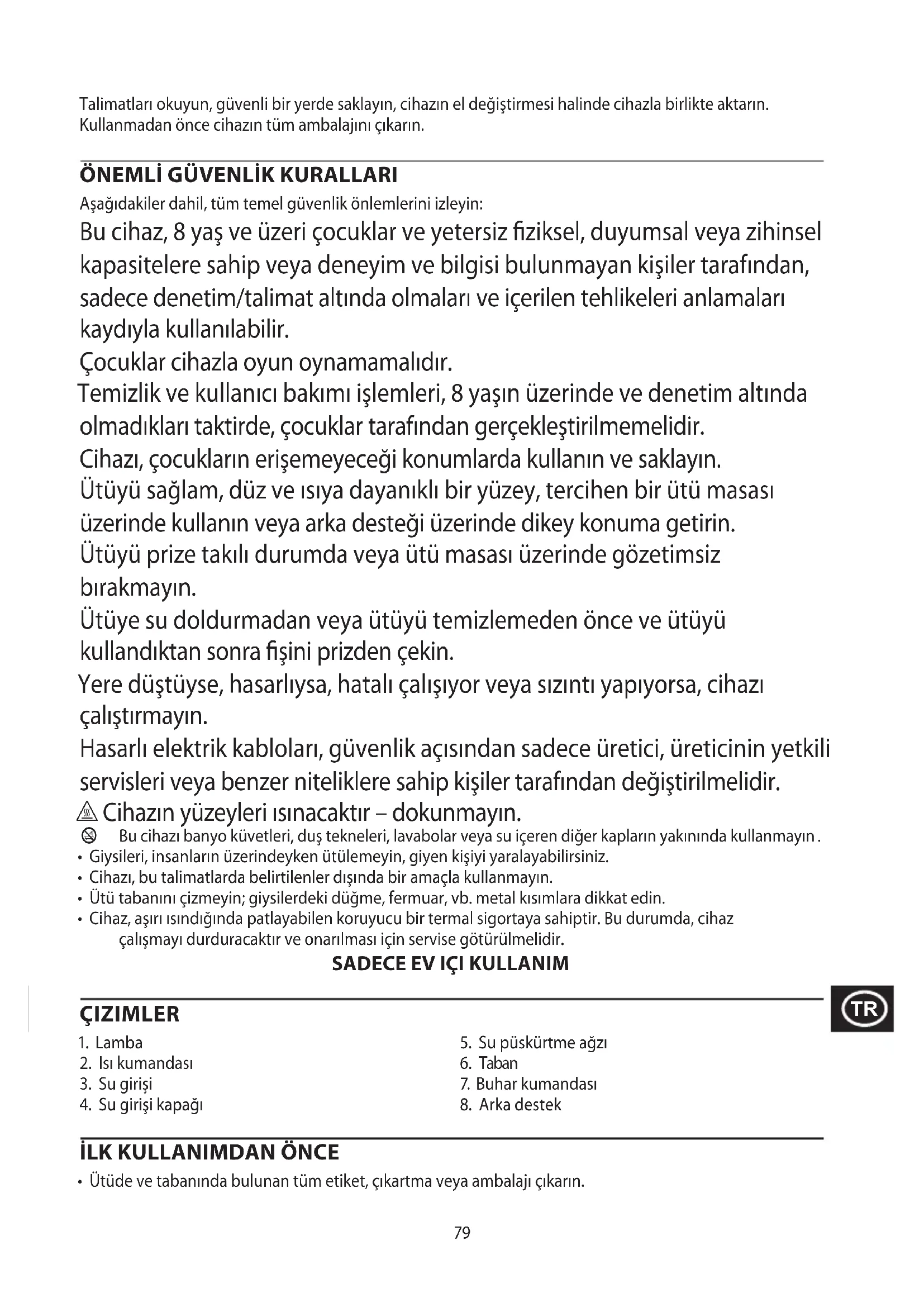 Aşağıdakiler dahil, tüm temel güvenlik önlemlerini izleyin: Bu cihaz, 8 yaş ve üzeri çocuklar ve yetersiz fiziksel, duyumsal veya zihinsel kapasitelere sahip veya deneyim ve bilgisi bulunmayan kişiler tarafından, sadece denetim/talimat altında olmaları ve içerilen tehlikeleri anlamaları kaydıyla kullanılabilir. Çocuklar cihazla oyun oynamamalıdır. Temizlik ve kullanıcı bakımı işlemleri, 8 yaşın üzerinde ve denetim altında olmadıkları taktirde, çocuklar tarafından gerçekleştirilmemelidir. Cihazı, çocukların erişemeyeceği konumlarda kullanın ve saklayın. Ütüyü sağlam, düz ve ısıya dayanıklı bir yüzey, tercihen bir ütü masası üzerinde kullanın veya arka desteği üzerinde dikey konuma getirin. Ütüyü prize takılı durumda veya ütü masası üzerinde gözetimsiz bırakmayın. Ütüye su doldurmadan veya ütüyü temizlemeden önce ve ütüyü kullandıktan sonra fişini prizden çekin. Yere düştüyse, hasarlıysa, hatalı çalışıyor veya sızıntı yapıyorsa, cihazı çalıştırmayın. Hasarlı elektrik kabloları, güvenlik açısından sadece üretici, üreticinin yetkili servisleri veya benzer niteliklere sahip kişiler tarafından değiştirilmelidir. h Cihazın yüzeyleri ısınacaktır – dokunmayın.