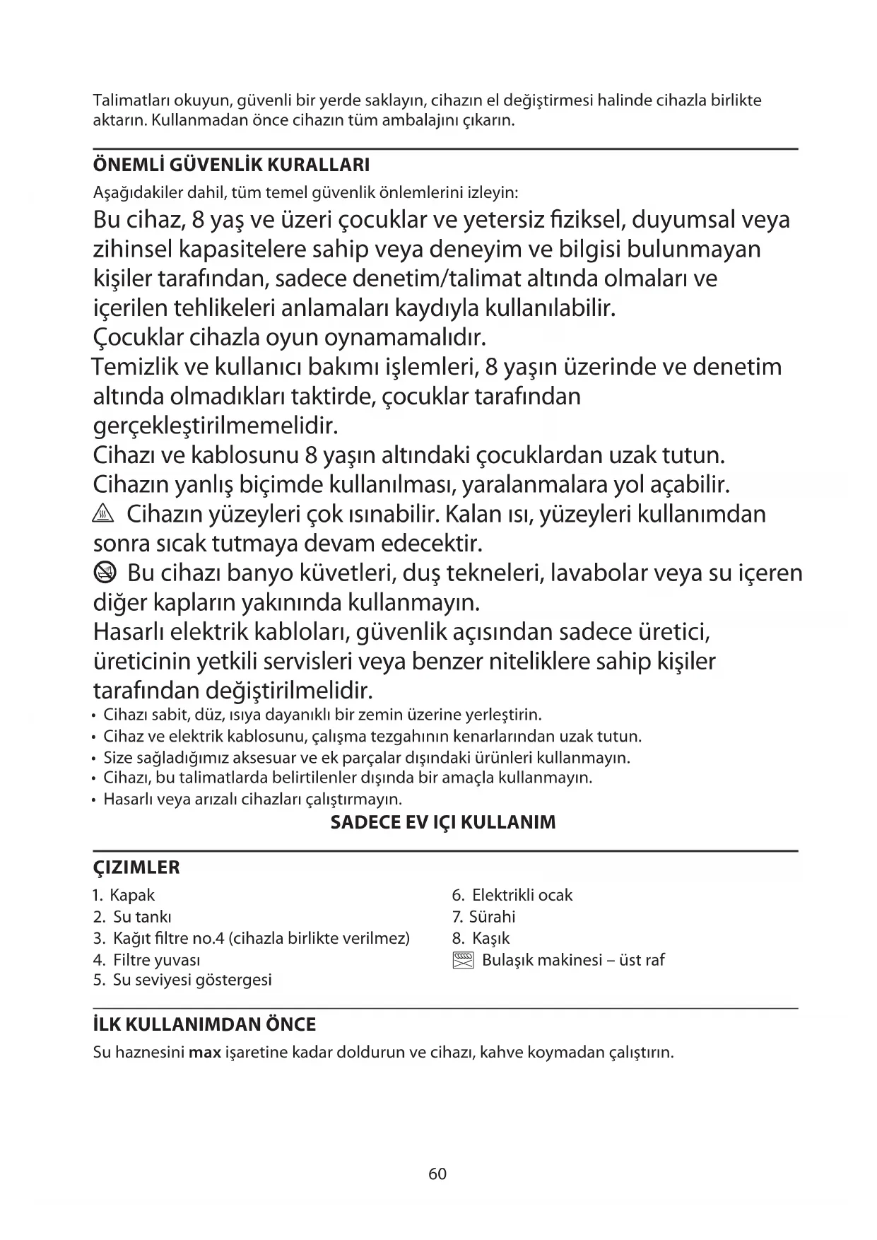 Aşağıdakiler dahil, tüm temel güvenlik önlemlerini izleyin: Bu cihaz, 8 yaş ve üzeri çocuklar ve yetersiz ziksel, duyumsal veya zihinsel kapasitelere sahip veya deneyim ve bilgisi bulunmayan kişiler tarafından, sadece denetim/talimat altında olmaları ve içerilen tehlikeleri anlamaları kaydıyla kullanılabilir. Çocuklar cihazla oyun oynamamalıdır. Temizlik ve kullanıcı bakımı işlemleri, 8 yaşın üzerinde ve denetim altında olmadıkları taktirde, çocuklar tarafından gerçekleştirilmemelidir. Cihazı ve kablosunu 8 yaşın altındaki çocuklardan uzak tutun. Cihazın yanlış biçimde kullanılması, yaralanmalara yol açabilir. h Cihazın yüzeyleri çok ısınabilir. Kalan ısı, yüzeyleri kullanımdan sonra sıcak tutmaya devam edecektir. b Bu cihazı banyo küvetleri, duş tekneleri, lavabolar veya su içeren diğer kapların yakınında kullanmayın. Hasarlı elektrik kabloları, güvenlik açısından sadece üretici, üreticinin yetkili servisleri veya benzer niteliklere sahip kişiler tarafından değiştirilmelidir.