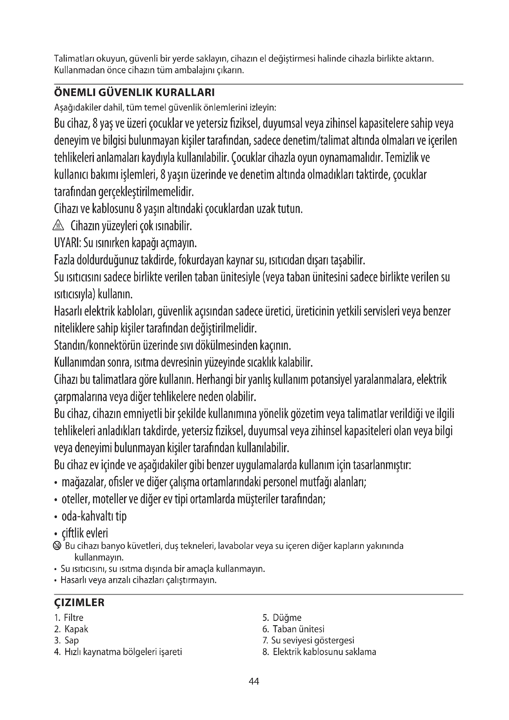 Aşağıdakiler dahil, tüm temel güvenlik önlemlerini izleyin: Bu cihaz, 8 yaş ve üzeri çocuklar ve yetersiz ziksel, duyumsal veya zihinsel kapasitelere sahip veya deneyim ve bilgisi bulunmayan kişiler tarafından, sadece denetim/talimat altında olmaları ve içerilen tehlikeleri anlamaları kaydıyla kullanılabilir. Çocuklar cihazla oyun oynamamalıdır. Temizlik ve kullanıcı bakımı işlemleri, 8 yaşın üzerinde ve denetim altında olmadıkları taktirde, çocuklar tarafından gerçekleştirilmemelidir. Cihazı ve kablosunu 8 yaşın altındaki çocuklardan uzak tutun. h Cihazın yüzeyleri çok ısınabilir. UYARI: Su ısınırken kapağı açmayın. Fazla doldurduğunuz takdirde, fokurdayan kaynar su, ısıtıcıdan dışarı taşabilir. Su ısıtıcısını sadece birlikte verilen taban ünitesiyle (veya taban ünitesini sadece birlikte verilen su ısıtıcısıyla) kullanın. Hasarlı elektrik kabloları, güvenlik açısından sadece üretici, üreticinin yetkili servisleri veya benzer niteliklere sahip kişiler tarafından değiştirilmelidir. Standın/konnektörün üzerinde sıvı dökülmesinden kaçının. Kullanımdan sonra, ısıtma devresinin yüzeyinde sıcaklık kalabilir. Cihazı bu talimatlara göre kullanın. Herhangi bir yanlış kullanım potansiyel yaralanmalara, elektrik çarpmalarına veya diğer tehlikelere neden olabilir. Bu cihaz, cihazın emniyetli bir şekilde kullanımına yönelik gözetim veya talimatlar verildiği ve ilgili tehlikeleri anladıkları takdirde, yetersiz ziksel, duyumsal veya zihinsel kapasiteleri olan veya bilgi veya deneyimi bulunmayan kişiler tarafından kullanılabilir. Bu cihaz ev içinde ve aşağıdakiler gibi benzer uygulamalarda kullanım için tasarlanmıştır: