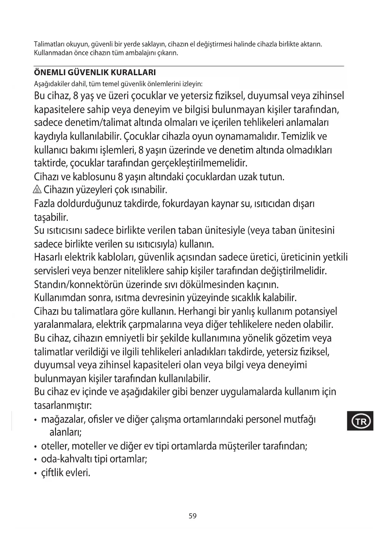 Aşağıdakiler dahil, tüm temel güvenlik önlemlerini izleyin: Bu cihaz, 8 yaş ve üzeri çocuklar ve yetersiz ziksel, duyumsal veya zihinsel kapasitelere sahip veya deneyim ve bilgisi bulunmayan kişiler tarafından, sadece denetim/talimat altında olmaları ve içerilen tehlikeleri anlamaları kaydıyla kullanılabilir. Çocuklar cihazla oyun oynamamalıdır. Temizlik ve kullanıcı bakımı işlemleri, 8 yaşın üzerinde ve denetim altında olmadıkları taktirde, çocuklar tarafından gerçekleştirilmemelidir. Cihazı ve kablosunu 8 yaşın altındaki çocuklardan uzak tutun. h Cihazın yüzeyleri çok ısınabilir. Fazla doldurduğunuz takdirde, fokurdayan kaynar su, ısıtıcıdan dışarı taşabilir. Su ısıtıcısını sadece birlikte verilen taban ünitesiyle (veya taban ünitesini sadece birlikte verilen su ısıtıcısıyla) kullanın. Hasarlı elektrik kabloları, güvenlik açısından sadece üretici, üreticinin yetkili servisleri veya benzer niteliklere sahip kişiler tarafından değiştirilmelidir. Standın/konnektörün üzerinde sıvı dökülmesinden kaçının. Kullanımdan sonra, ısıtma devresinin yüzeyinde sıcaklık kalabilir. Cihazı bu talimatlara göre kullanın. Herhangi bir yanlış kullanım potansiyel yaralanmalara, elektrik çarpmalarına veya diğer tehlikelere neden olabilir. Bu cihaz, cihazın emniyetli bir şekilde kullanımına yönelik gözetim veya talimatlar verildiği ve ilgili tehlikeleri anladıkları takdirde, yetersiz ziksel, duyumsal veya zihinsel kapasiteleri olan veya bilgi veya deneyimi bulunmayan kişiler tarafından kullanılabilir. Bu cihaz ev içinde ve aşağıdakiler gibi benzer uygulamalarda kullanım için tasarlanmıştır: