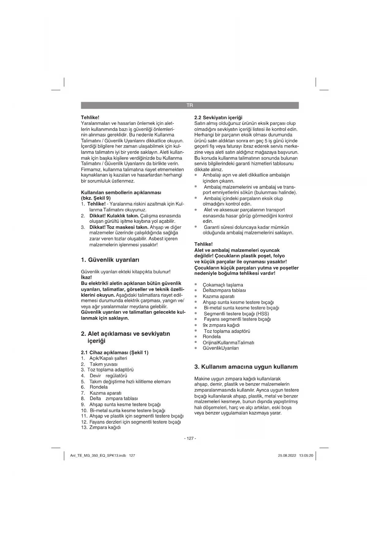 Makineyi elektrik şebekesine bağlamadan önce makinenin tip etiketi üzerinde belirtilen değerlerin elektrik şebekesi değerleri ile aynı olup olmadığını kontrol edin. İkaz! Makine üzerinde ayar işlemi yapmadan önce daima fi şi prizden çıkarın. Anl_TE_MG_350_EQ_SPK13.indb 128Anl_TE_MG_350_EQ_SPK13.indb 128 25.08.2022 13:05:2125.08.2022 13:05:21TR